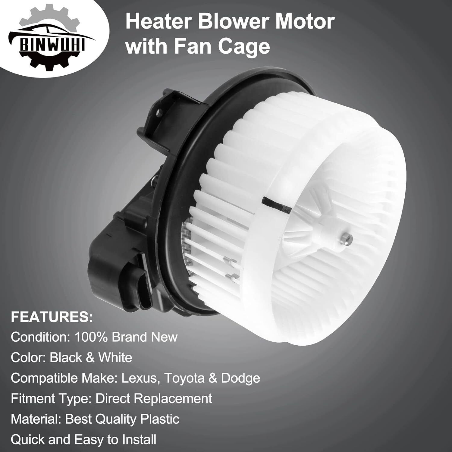 ?Compatibility?This HVAC Heater Blower Motor Replacement for 2005-2018 Toyota Avalon | 2007-2017 Toyota Camry | 2007-2020 Toyota Tundra | 2008-2019 Toyota Highlander | 2010-2020 Toyota 4Runner | 2010-2016 Toyota Venza | 2007-2018 Lexus ES350 | 2010-2012 Lexus RX350 | 2010-2012 Lexus RX450h | 2013 Lexus ES300h | 2010-2019 Lexus GX460 | 2014-2020 Dodge Journey.?NOTE?Please check the description or use the year/make/model drop down bar and interchangeable part numbers to confirm the compatibility before purchase this Blower Motor. ?Replaces Part#?This AC Blower Motor with Fan Cage Replaces 700215, 68232372AC, 87103-0E040, 87103-0C040, 87103-60400, PM9351, 75830 Compatible with Toyota, Lexus Dodge vehicle. ?OEM FIT EASY INSTALLATION?Direct replacement for your factory Blower Motor Fan Assembly .The blower motor can be installed easily with no special tools required and just by removing a few screws on the passenger side of the vehicle under the glove box.This blowers motor will get your air conditioning system up and running again in no time.While this is not a genuine OEM part it is a direct replacement. ?ASSURED QUALITY?Similar to OE, uses higher heat resistant materials to ensure longevity when operating under high ambient temperatures.All of our motors exceed OE design and allow your heat and air conditioning to run at top-notch quality again. Each ac blower motor must be inspected and tested multiple times before shipping. ?Two-year Warranty?BINWUHI blower motor comes complete with two-year warranty,once any quality problems or installation/using problems with the ac resistor, Click "ASK SELLER " besides your order from us and let us solve your problem!