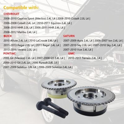 OEM number: Exhaust Sprocket: 917-254 | 12578516 | 12621505 | Intake Sprocket: 917-270 | 12578515 | Compatible with Chevrolet: 2008-2010 Captiva Sport (Mexico) 2.4L L4 | 2008-2010 Cobalt 2.0L L4 | 2006-2008 Cobalt 2.4L L4 | 2010-2011 Equinox 2.4L L4 | 2008-2010 HHR 2.0L L4 | 2006-2011 HHR 2.4L L4 | 2008-2012 Malibu 2.4L L4 | Compatible with GMC: 2010-2011 Terrain 2.4L L4 | Compatible with Buick: 2010 Allure 2.4L L4 | 2010 LaCrosse 2.4L L4 | 2011-2013 Regal 2.0L L4 | 2011 Regal 2.4L L4 | 2013-2016 Verano 2.0L L4 | Compatible with Pontiac: 2006 G4 (Mexico) 2.4L L4 | 2007-2008 G5 2.4L L4 | 2006-2010 G6 2.4L L4 | 2006 Pursuit 2.4L L4 | 2007-2009 Solstice 2.0L L4 | 2006-2009 Solstice 2.4L L4 | Compatible with Saturn: 2007-2009 Aura 2.4L L4 | 2006-2007 Ion 2.4L L4 | 2007-2010 Sky 2.0L L4 | 2007-2010 Sky 2.4L L4 | 2007-2010 Vue 2.4L L4 | Product includes: 2X Camshaft Sprockets with bolts