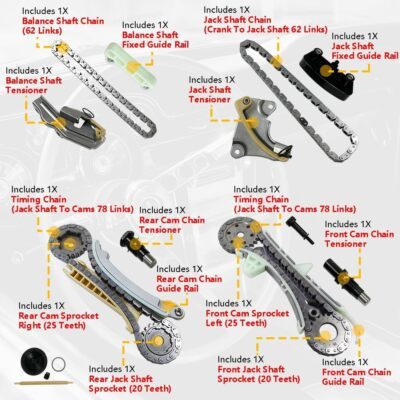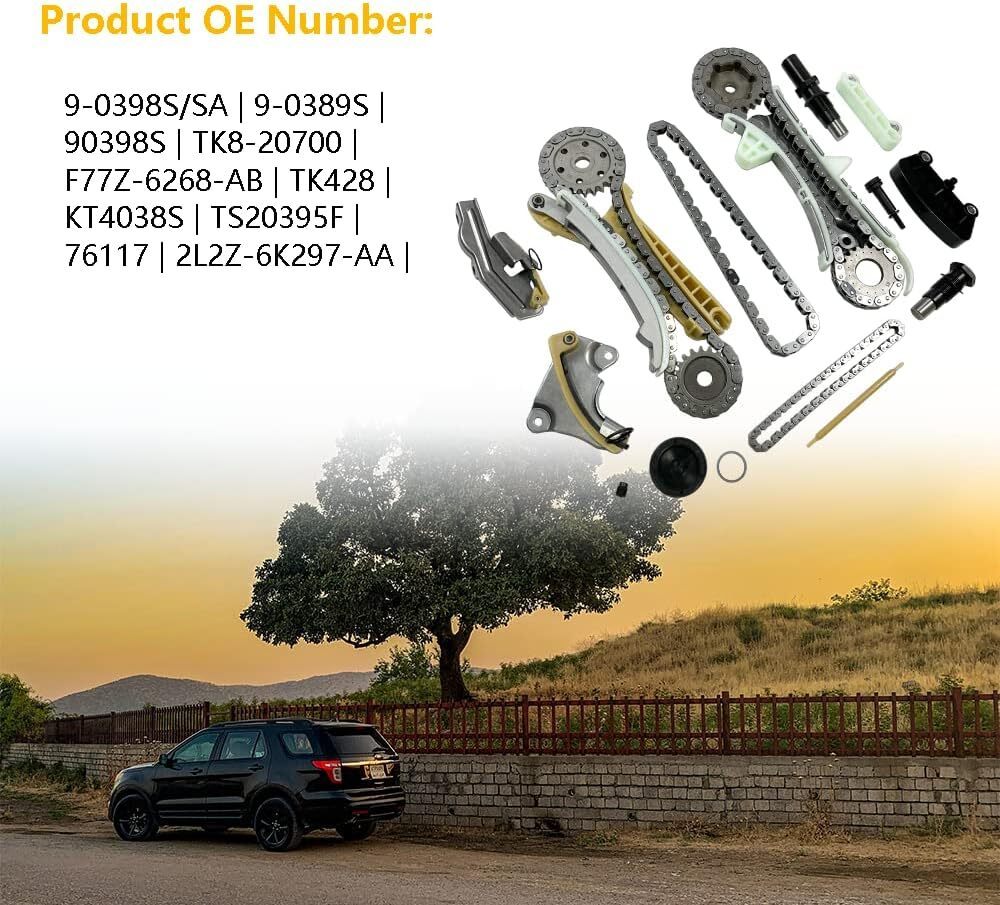 OEM number: 9-0398S/SA | 9-0389S | 90398S | TK8-20700 | F77Z-6268-AB | TK428 | KT4038S | TS20395F | 76117 | 2L2Z-6K297-AA | Package includes: 1 Balance Shaft Chain (62 Links) | 1 Balance Shaft Tensioner | 1 Balance Shaft Fixed Guide Rail | | 1 Timing Chain (Jack Shaft To Cams 78 Links) | 1 Front Cam Chain Tensioner | 1 Front Cam Sprocket Left (25 Teeth .572" Hole) | 1 Front Jack Shaft Sprocket (20 Teeth 1.102" Hole) | 1 Front Cam Chain Guide Rail | | 1 Jack Shaft Chain (Crank To Jack Shaft 62 Links) | 1 Jack Shaft Tensioner | 1 Jack Shaft Fixed Guide Rail | | 1 Timing Chain (Jack Shaft To Cams 78 Links) | 1 Rear Cam Chain Tensioner | 1 Rear Cam Sprocket Right (25 Teeth .461" Hole) | 1 Rear Jack Shaft Sprocket (20 Teeth 1.102" Hole) | 1 Rear Cam Chain Guide Rail | | 1 Oil Line Restrictor | Note: This listing fits both the 2wd and 4wd models. 2wd models don't use the balance shaft components. Compatible with 1997-2010 FORD EXPLORER 4.0L 245CID SOHC V6, VIN Code "E" , "K" | 2001-2005 FORD EXPLORER SPORT TRAC 4.0L 245CID SOHC V6, VIN Code "E" , "K" | 2001-2010 FORD RANGER 4.0L 245CID SOHC V6, VIN Code "E" , "K" | 2005-2006 FORD MUSTANG 4.0L 245CID SOHC V6, VIN Code "E" , "K" | 1998-2010 MERCURY MOUNTAINEER 4.0L 245CID SOHC V6, VIN Code "E" , "K" | 2001-2006 MAZDA B4000 4.0L 4016cc SOHC V6, VIN Code "E" |