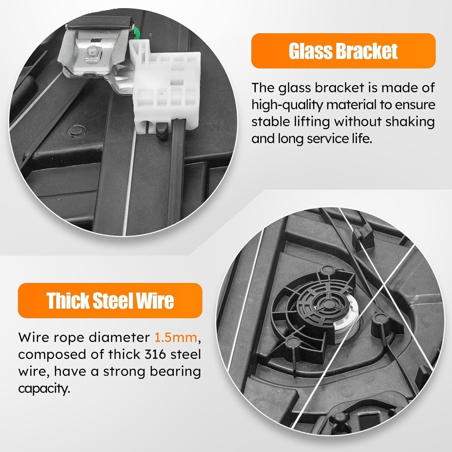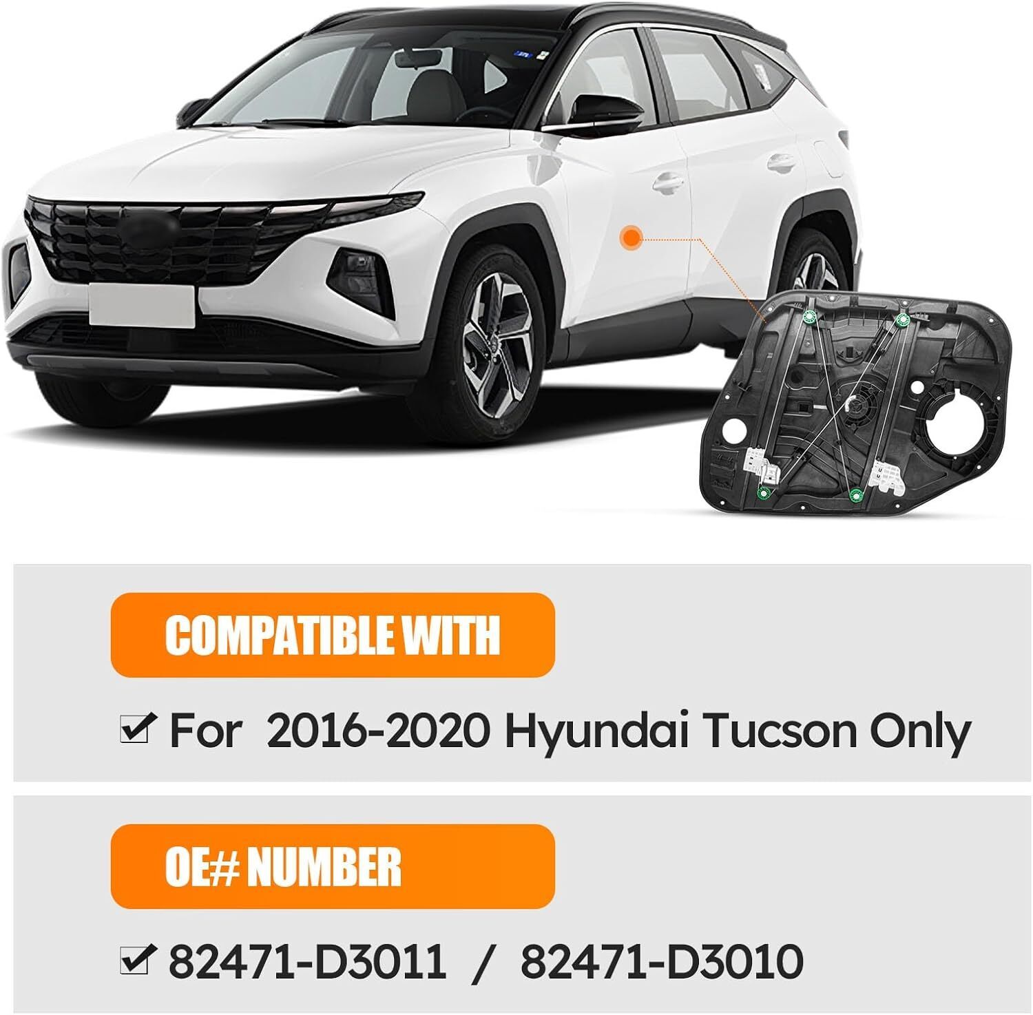 ?Compatible with: For 2016-2020 Hyundai Tucson, OE# 82471-D3011, 82471-D3010. Placement on vehicle front left driver side. Window motor NOT Included. ?Good function: The window regulator designed for advance torque and speed, high efficiency plastic roller and slide, engineered to match original equipment regulator mounting. ?High-quality: The diameter of the steel wire rope is 1.5mm, composed of thick 316 steel wire, have a strong bearing capacity. The glass bracket is made of high-quality material to ensure stable lifting without shaking and long service life. ?Good value: This is your best option and good value replacement compatiable with your rebuild, repair, and maintenance needs - an OE replacement product compatiable eith your damaged or aged factory part. ?After-Sales Service: We offer 24 hours customer service and 1 year product service, If you are encounter product installation, product quality and other problems, please feel free to contact us.