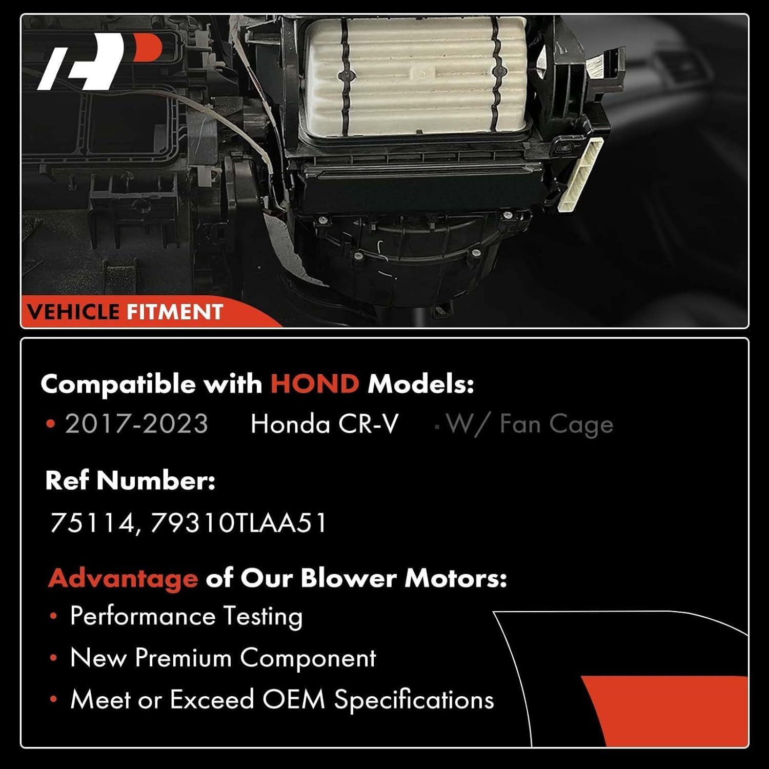 [Vehicle Fitment]: Compatible with Honda CR-V 2017 2018 2019 2020 2021 2022 2023 [Reference Number]: 75114, BM10092C, 79310TLAA51---You can select the "Year/Make/Model" or other parameters of your car at the top of the list and click "Confirm" before purchasing. Check if this blower is suitable for your car [Package Contents]: 1x Heater Blower Motor Assembly (Included: Fan Cage); Packaging Type: Box [Reliable Replacement]: This air conditioner blower motor is made from motor-specific silicon steel and premium enameled copper wire and is manufactured to OE specifications for direct installation without modification. Perfect replacement for old blower motors [Buy with Confidence]: A-Premium offers a one-year unlimited-mileage guarantee on our meticulously crafted heater blower motor. We offer a wide variety of automotive accessory categories, ensuring that you can hit the road with peace of mind.