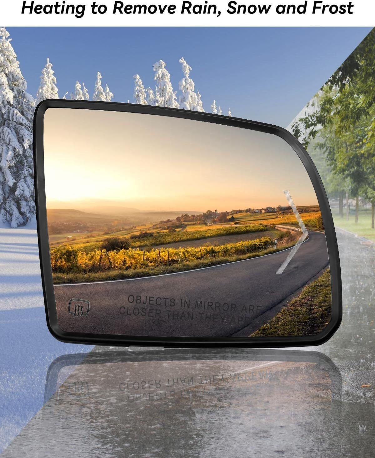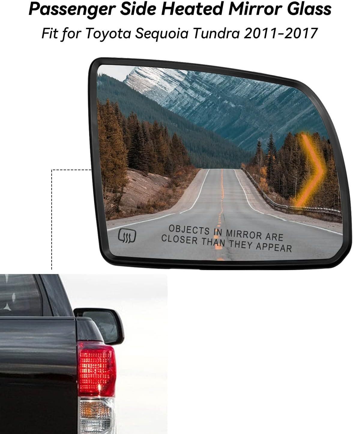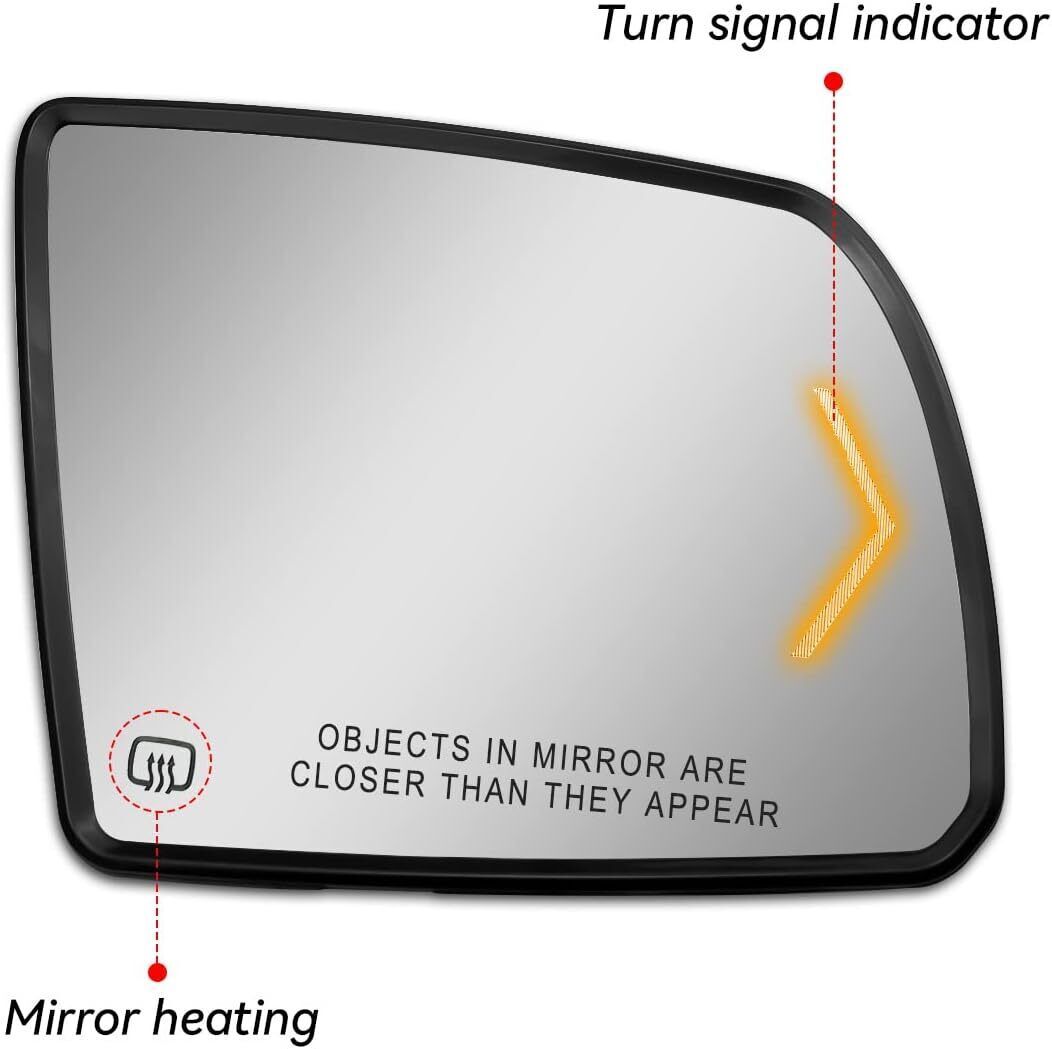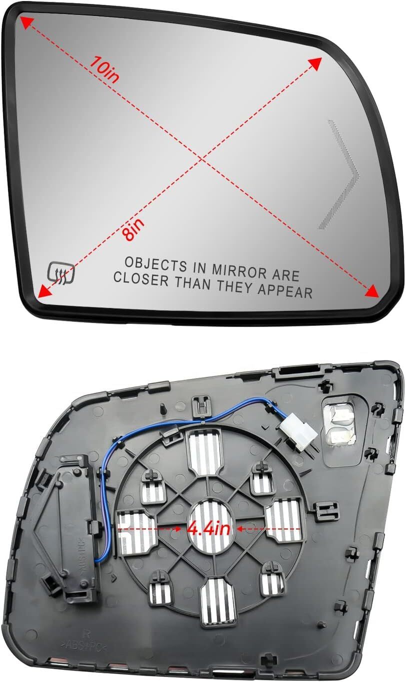 Fit Models: Driver side mirror glass fit for Toyota Sequoia 2008 2009 2010 2011 2012 2013 2014 2015 2016 2017, fit for Toyota Tundra 2007 2008 2009 2010 2011 2012 2013 2014 2015 2016 2017 2018 2019 2020 Replace Part Number: 87903-0C030, please kindly check the fitment and part number to ensure this will fit your model before ordering Heating function: The rear view mirror glass with heating function allows you to see the vehicle behind you more clearly in rainy and snowy weather, fog and frost weather, providing better visibility and improving your safety Upgrade Design: The thickness of glass lens frame has been upgraded and thickened to better protect the lens, but only the thickness of the frame has been changed, and the size of the rear bracket is the same as that of the original vehicle Durability and Visibility: This rear-view mirror is equipped with a turn signal lamp, which can clearly remind the vehicles behind, and facilitate and quickly change lanes. Professional design, can be replaced directly, ensuring accurate fit, without any installation modification