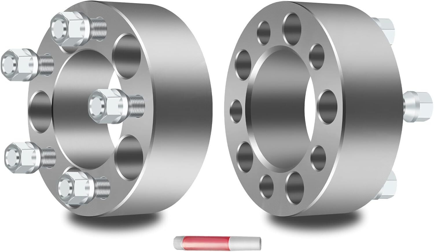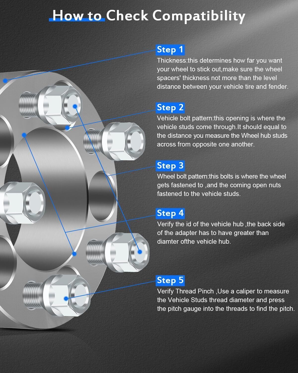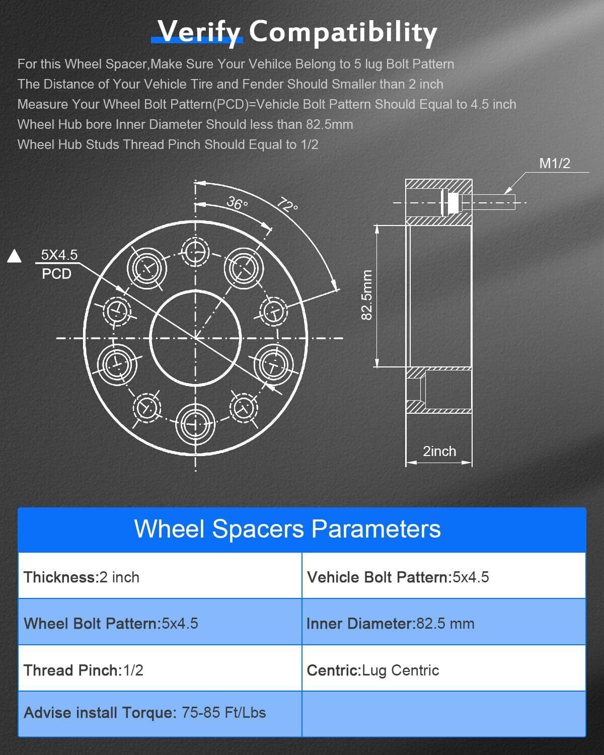 GARAGE CHECKING--50mm Wheel Spacers 5 lug REQUIRED that you Check your vehicle compatibility in Product Description BEFORE buying. The Buyer is responsible for making sure that they choose the correct thickness so as to not cause the wheel/tire to rub against the fender of the vehicle SPECIFICATIONS--The 5x114.3 to 5x114.3 Wheel Spacers adapter Brand New Wheel Spacers. Thickness:2",Bolt Pattern 5x4.5 to 5x4.5,Wide Hub Bore Size:82.5mm,Thread Pitch 1/2"x20 Wheel Studs Includes Open Ended Lug Nuts to install wheels to Spacers (additional lugs may be required to install onto vehicle) 82.5mm Center Bore 6061 T6 Billet Aluminum EASY INSTALLATION-- These 5x4.5 Wheel Spacer 2 inch come with everything you need,featuring 100% simple bolt-on installation,requires no strut pre-loading,cutting,or modification of factory installed parts MANUFACTURE--The 5 LUG WHEEL SPACER Made from the great true T 6 billet aluminum,with heat treated and hardened 10.9 grade bolts pre-installed VERIFY FITMENT--Even if a vehicle is listed as being compatible, buyers still need to check: 1) Wheel studs are 1/2 threads; 2) You have more than 2 inch of space between your fender and your wheel/tire; 3) Your factory wheel studs are shorter than 2 inch (NOTE: If your wheel studs are too long, you may need to grind/trim the stud down to fit); 4) Wheel center bore needs to be no smaller than 82.5mm,advise torque specs at 75-85 Ft/Lbs