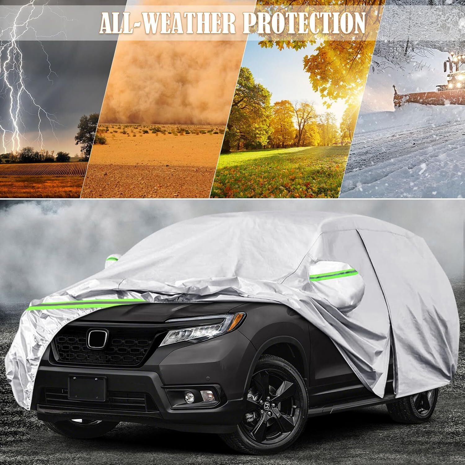 Applicable model: Waterproof All Weather Full Car Cover Custom-fit for 2019-2024 Honda Passport. Fully protects your car like a mobile garage. Confirm your car model and dimensions before ordering, It can be used if your vehicle dimensions are within 191(L)*79(W)*72(H)in. Practical Design: 6-Layer car cover suitable for use in all seasons. Driver side door zipper design for easy access. Windproof Bands at front rear to fix your car cover In heavy wind weather. 6pcs reflective stripes remind other people at night. Pretty Mirror Pockets perfectly protect your mirror form scratching. And the adjustable length buckle strap is designed to secure the cover inplace during windy conditions. Come with a waterproof bag you can easily fold the cover and carry it with you. Heavy Duty Material: Full car cover is made of high-quality spunlace cotton, it feels soft and keeps the environment inside the cover dry. Anti-scratch soft cotton layer protects vehicle finish, and also has fire retardant, water proof, anti-static effects, providing gentle protection for your car. Complete Protection: LEZZYRUCK thick weatherproof car covers provide overall protection of vehicle from all-weather elements. The strengthful material keeps your car safe from sun, snow, rain, sand, dust, leaves, branches and birds dropping. What You will Get: 1x Car Cover, 1x Storage Bag. Each Item is thoroughly and rigorously tested. If you have any problems during use, please free feel to contact us, we will give you a satisfactory customer service.