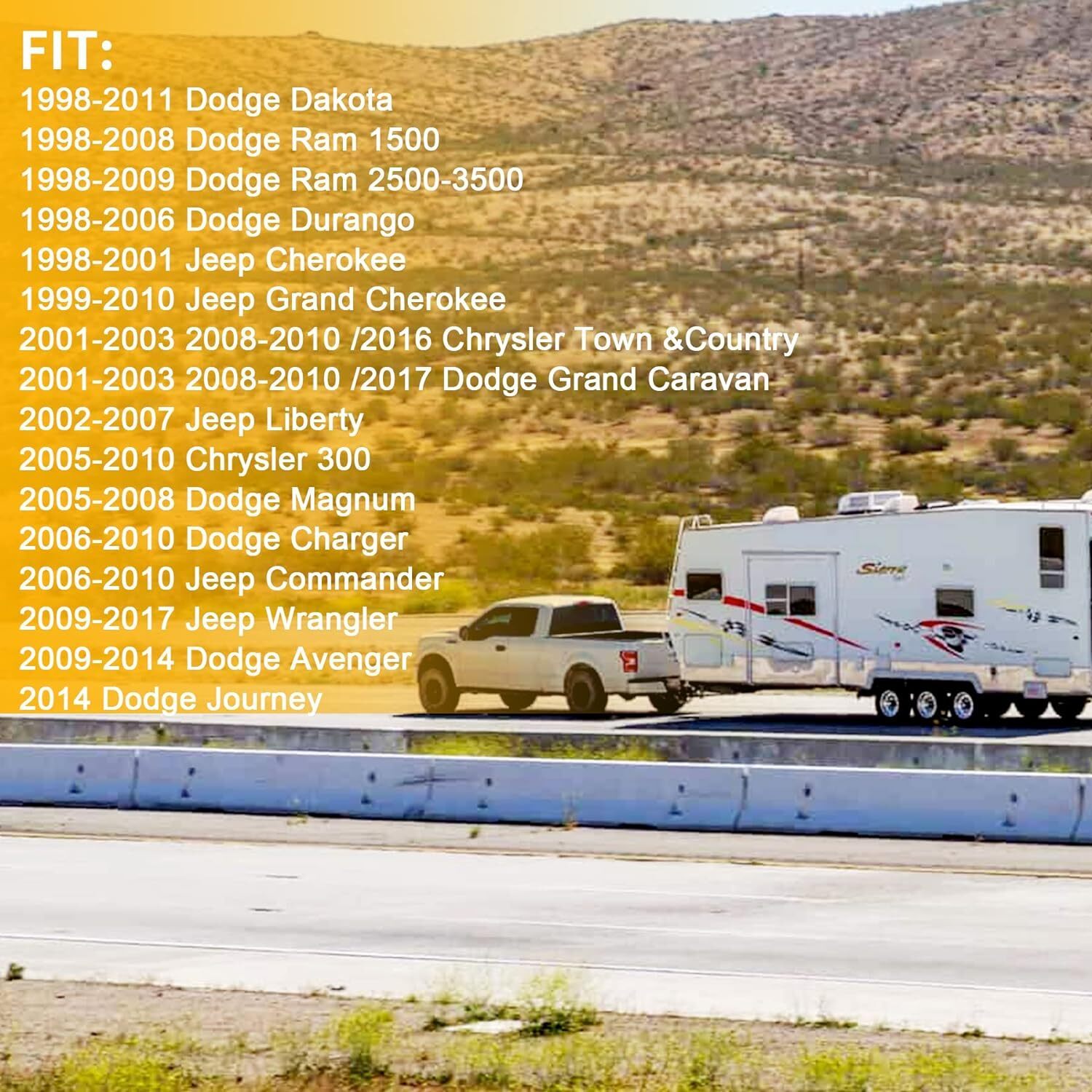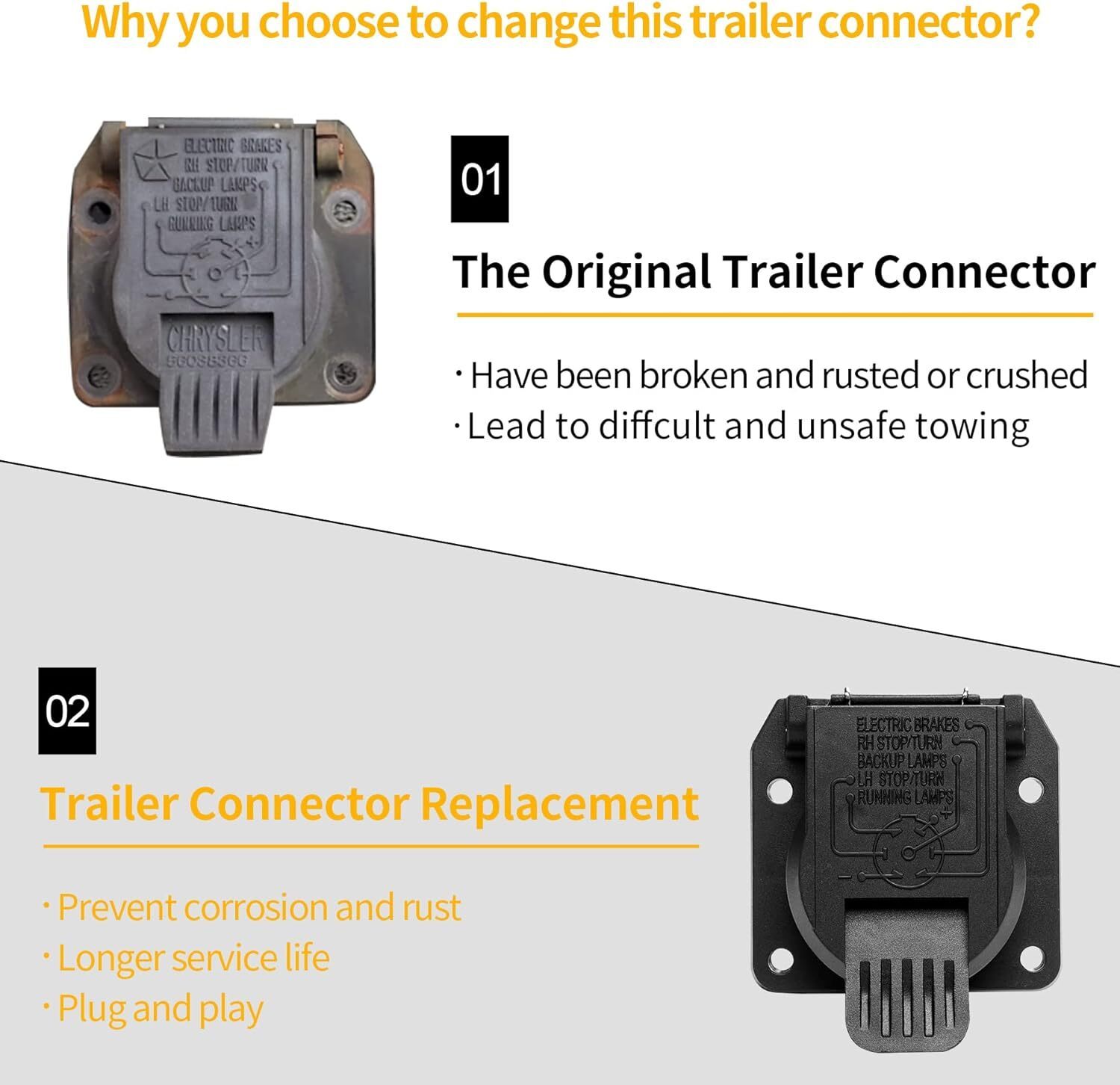 ?NEEDS? Over time, the dust cover of your towing connector has broken and rusted, or the trailer connector plug has been crushed, making it very difficult for the trailer due to poor connector contact. Simply replace this heavy duty connector and you can resume easy towing and enjoy a wonderful travel time. ?PLUG and PLAY?There is no need to feel the trouble of purchasing additional adapter converters, plug and play, which is a perfect replacement for OEM parts. Just unplugging from old one and pluging into the new one, taking about 5 minutes to install. ?PREMIUM QUALITY?Long life-span matters, that is why our 7-Way towing connector is composed of high quality plastics and metals, which can effectively prevent corrosion and rust, even if it is necessary to drive frequently on rainy days. ?FITS?Replace # 56038366AB, Supersession(s): 56038366; 56038366AC. Fits 1998-2011 Dodge Dakota, 1998-2008 Dodge Ram 1500, 1998-2009 Dodge Ram 2500-3500, 1998-2006 Dodge Durango, 1998-2001 Jeep Cherokee, 1999-2010 Jeep Grand Cherokee, 2001-2003 2008-2010 /2016 Chrysler Town Country, 2001-2003 2008-2010 /2017 Dodge Grand Caravan, 2002-2007 Jeep Liberty, 2005-2010 Chrysler 300, 2005-2008 Dodge Magnum, 2006-2010 Dodge Charger, 2006-2010 Jeep Commander, 2009-2017 Jeep Wrangler, 2009-2014 Dodge Avenger, 2014 Dodge Journey. ?12-MONTH WARRANTY? If for any reason at all, you are not fully satisfied with the trailer connector, simply contact us through amazon message at any time. We will provide comprehensive quality assurance for our product.