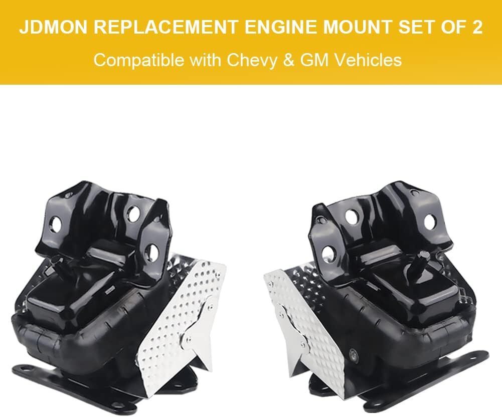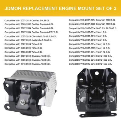 Benefits of Replacing Broken Engine Mounts: Reduce the engine noise and shock. Protect the engine and prolong its service life. Keep your car engine stable, which will improve your driving comfort, smoothness and driving safety. Fitment: JDMON Engine motor mount compatible with Cadillac Escalade 6.0L, 6.2L 2007-2014, Compatible with Escalade ESV 6.2L 2008-2014 , Compatible with Avalanche 2003-2014 , Compatible with Silverado 1500 5.3L, 6.0L, 6.2L 2007-2013, Compatible with Suburban 1500 5.3L, 6.0L 2007 - 2014, Compatible with Tahoe 2007 - 2014 , Compatible with Sierra 1500 2008 - 2013, Compatible with Yukon Yukon XL. Please check the fitment carefully before purchasing. Replacement for Part Number: JDMON Engine motor mount replaces 15854941, 15854939, A5365 , MK5365 5365. Package Includes: 2* Engine mounts High Strength and Durable: Our engine mounts are made from premium iron, aluminum and rubber, which has good durability and can withstand long-term use and various complex working conditions, reducing the frequency of maintenance and replacement. Recommendation and Services: The installation of auto parts is a very professional work, we strongly recommend that you install it under the guidance of professionals. If you have any questions, please feel free to contact us.