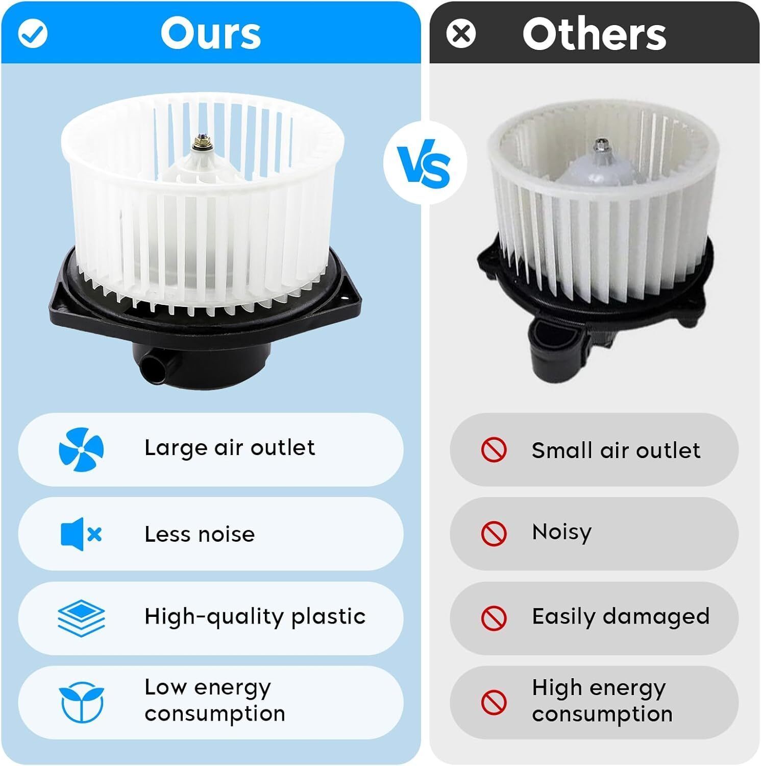 ?Vehicle Fitment?Compatible with 2002-2004 Infiniti I35 /2000-2003 Nissan Maxima /2003-2006 Subaru Baja /1996 Subaru Impreza OLD STYLE /1993-1995 Subaru Impreza /1995-2004 Subaru Legacy /2000-2004 Subaru Outback ?Reference Number?Compatible with 272202Y910, 615-58316, 615-58410, 615-58459, 615-58516, 615-58518, 700050, 72223AE000, 72240FA000, SU1326101 ?Premium Quality?Designed to keep your vehicle's HVAC system in top shape; Durable Material: Material of rotor punching plate is silicon steel. Enameled wire is used copper enameled wire. ?Easy to Install?Same Dimensions as your part, Directly Fit; Stable characteristics and high reliability; Larger Air Volume and Lower Noise ?Attention?Please check the descriptions and compatibility chart to ensure that the replacement fits your auto before your purchasing.