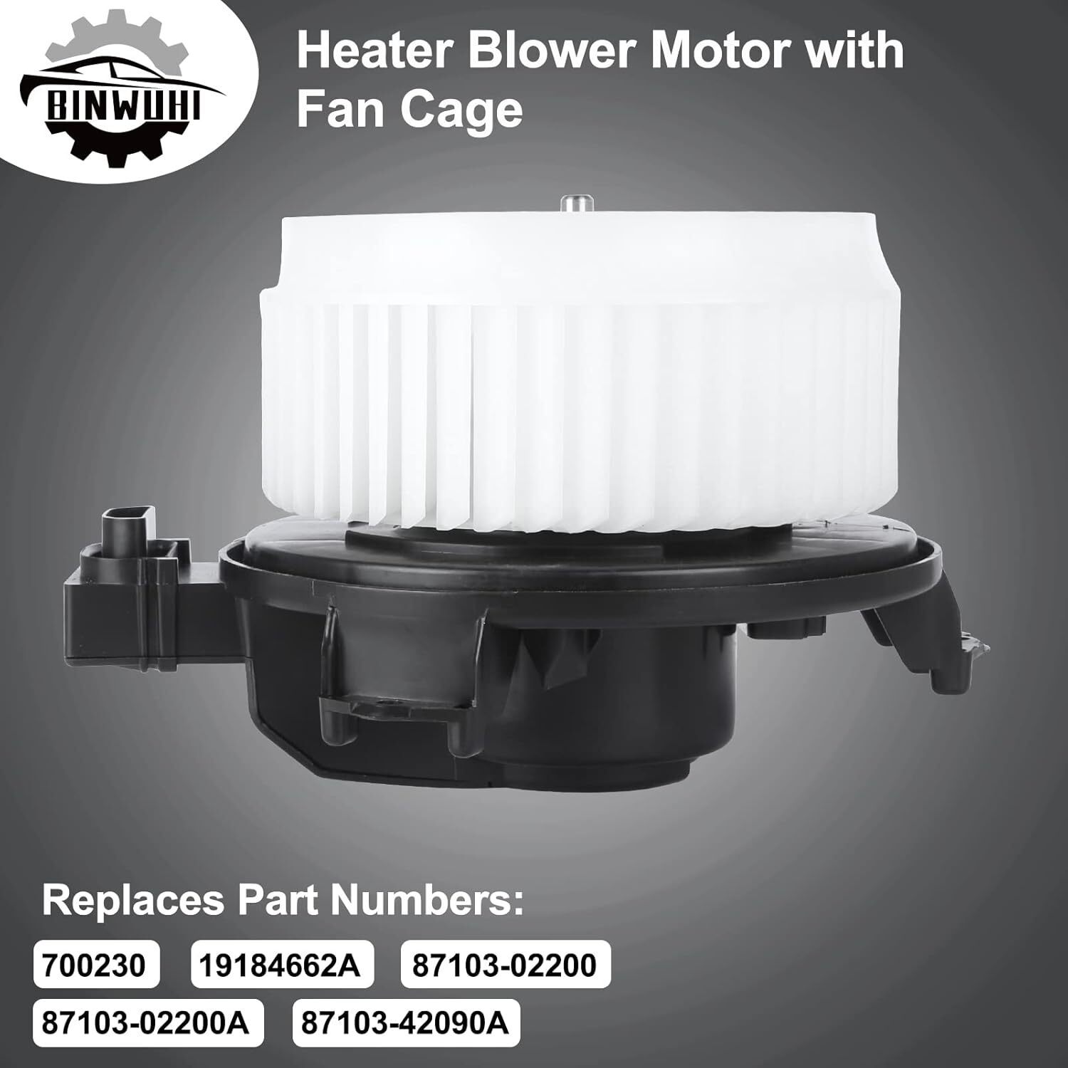 ?Compatibility?This HVAC Heater Blower Motor Replacement for 2009-2013 Toyota Corolla | 2009-2013 Toyota Matrix | 2006-2018 Toyota Rav4 | 2008-2015 Scion Xb | 2011-2016 Scion tC.?NOTE?Please check the description or use the year/make/model drop down bar and interchangeable part numbers to confirm the compatibility before purchase this Blower Motor. ?Replaces Part#?This AC Blower Motor with Fan Cage Replaces 700230, 87103-02200, 87103-42090, 19184662 fit for Toyota, Scion Pontiac vehicle. ?OEM FIT EASY INSTALLATION?Direct replacement for your factory Blower Motor Fan Assembly .The blower motor can be installed easily with no special tools required and just by removing a few screws on the passenger side of the vehicle under the glove box.This blowers motor will get your air conditioning system up and running again in no time.While this is not a genuine OEM part it is a direct replacement. ?ASSURED QUALITY?Similar to OE, uses higher heat resistant materials to ensure longevity when operating under high ambient temperatures.All of our motors exceed OE design and allow your heat and air conditioning to run at top-notch quality again. Each ac blower motor must be inspected and tested multiple times before shipping. ?Two-year Warranty?BINWUHI blower motor comes complete with two-year warranty,once any quality problems or installation/using problems with the ac resistor, Click "ASK SELLER " besides your order from us and let us solve your problem!