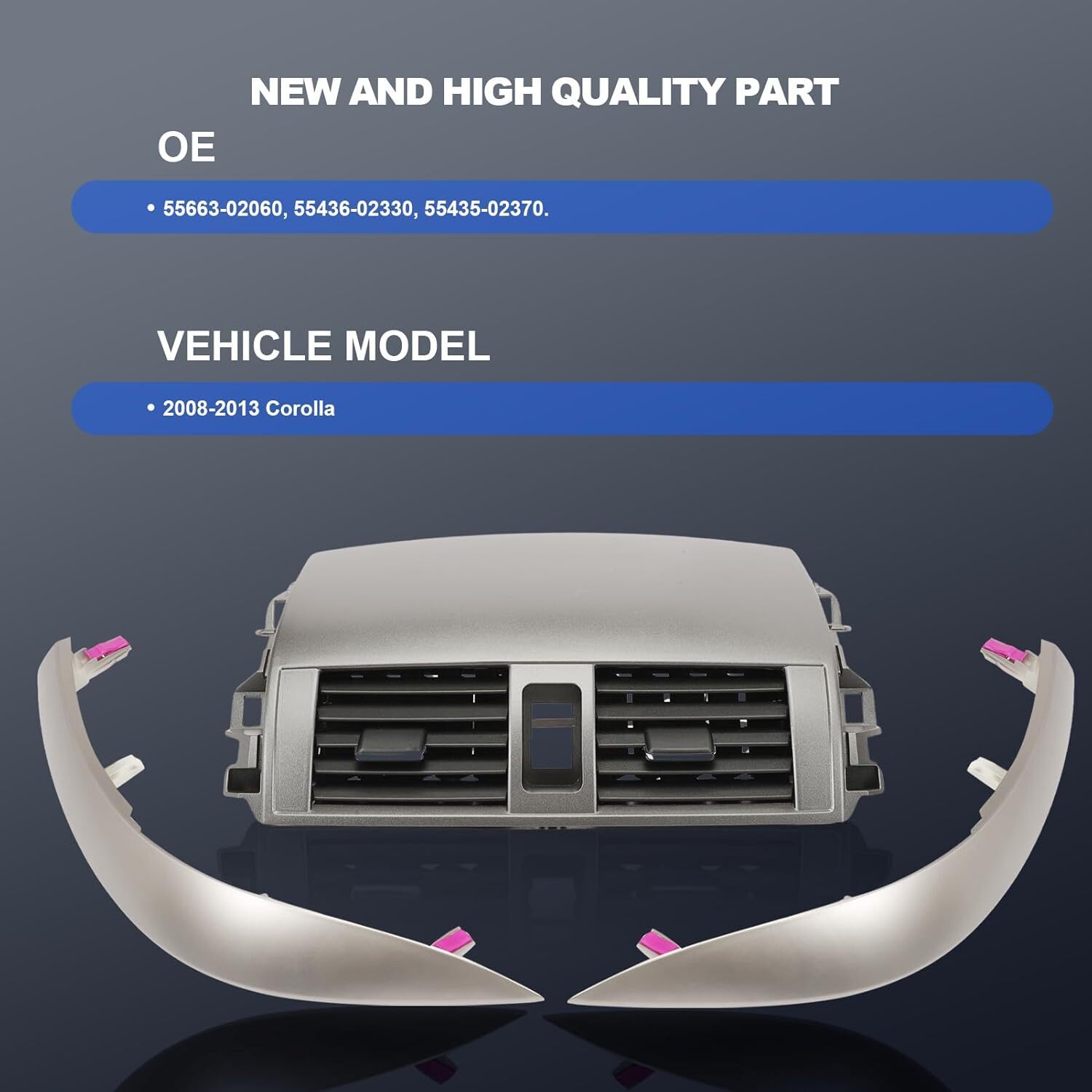 Compatibility: Compatible with 2008 2009 2010 2011 2012 2013 Corolla Replacement Part Number: A/C Vent ( 55663-02060, 5567002160, 55663-02060, 5566302060 ); navigation side trim ? Left Side( 55436-02330, 55436-12040, 5543602330, 5543612040 ) ?Right Side( 55435-02370, 55435-02370) Package Included: 1 Pcs Center Dash A/C Outlet Air Vent Panel; 1 Pair Left Right Upper Side Central Dashboard Cover Strips Qulity: Made from PC ABS plastic materials, this trim cover is built to resist fading and cracking. It retains its pristine appearance despite prolonged exposure to sunlight temperature variations Service: If you encounter any questions, we will answer you promptly