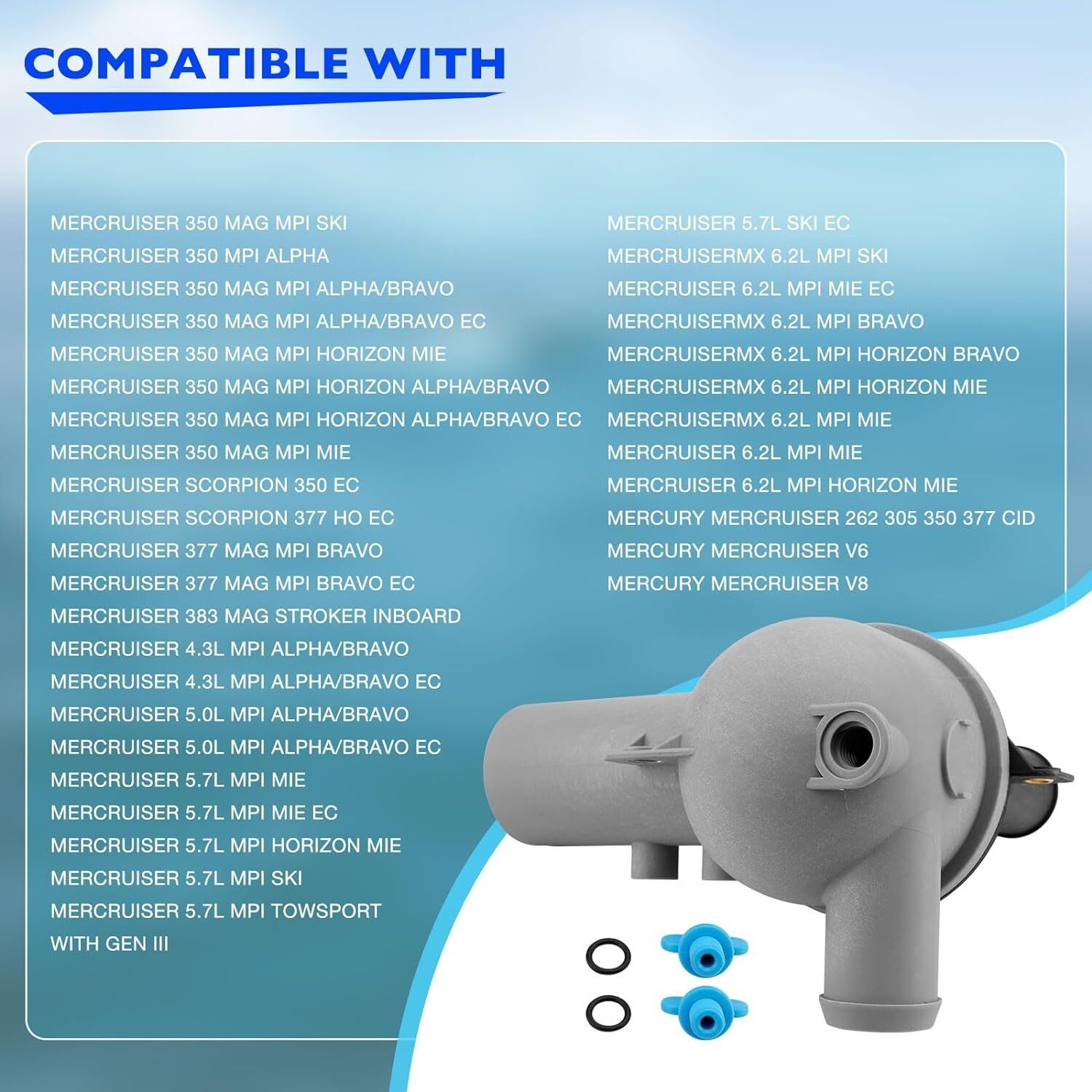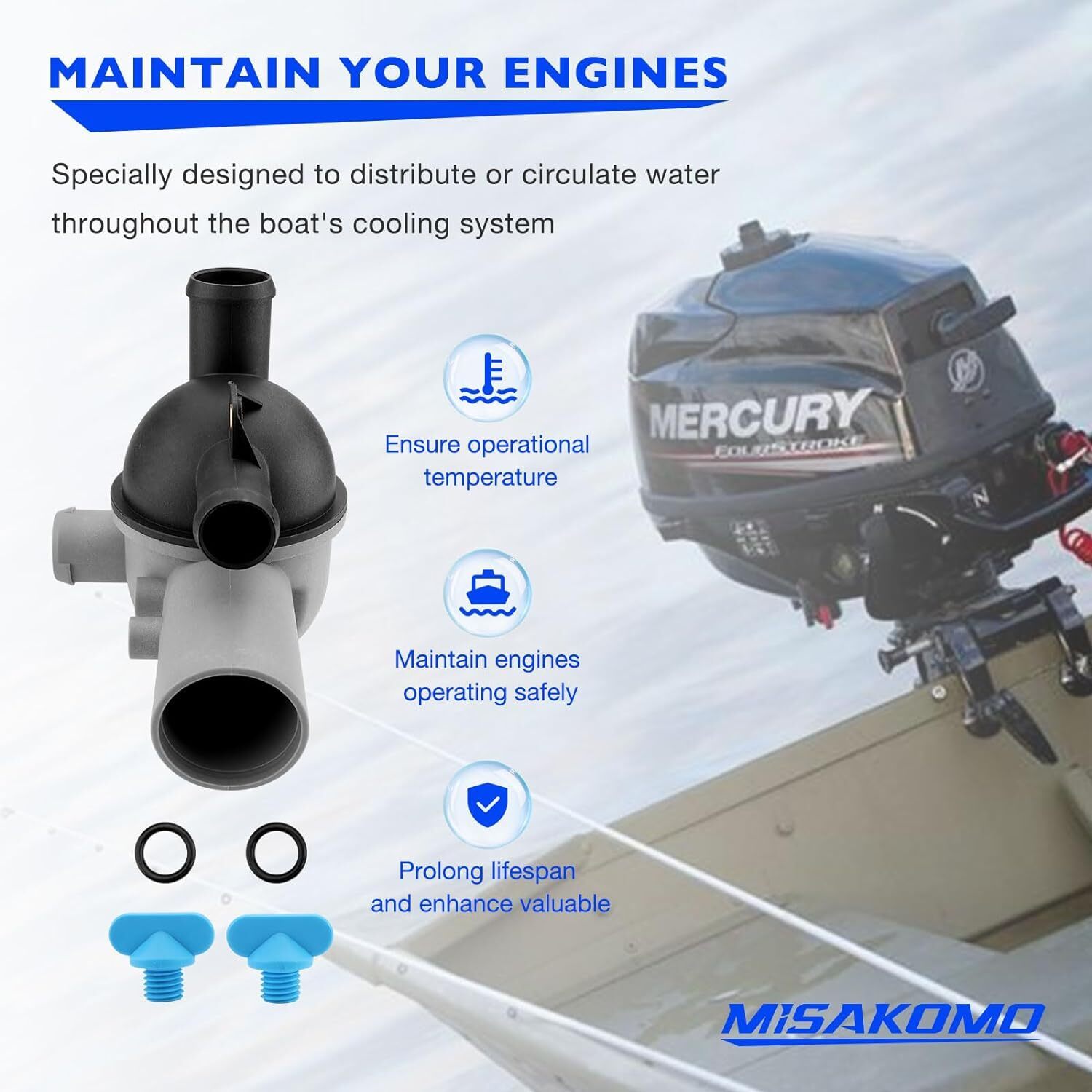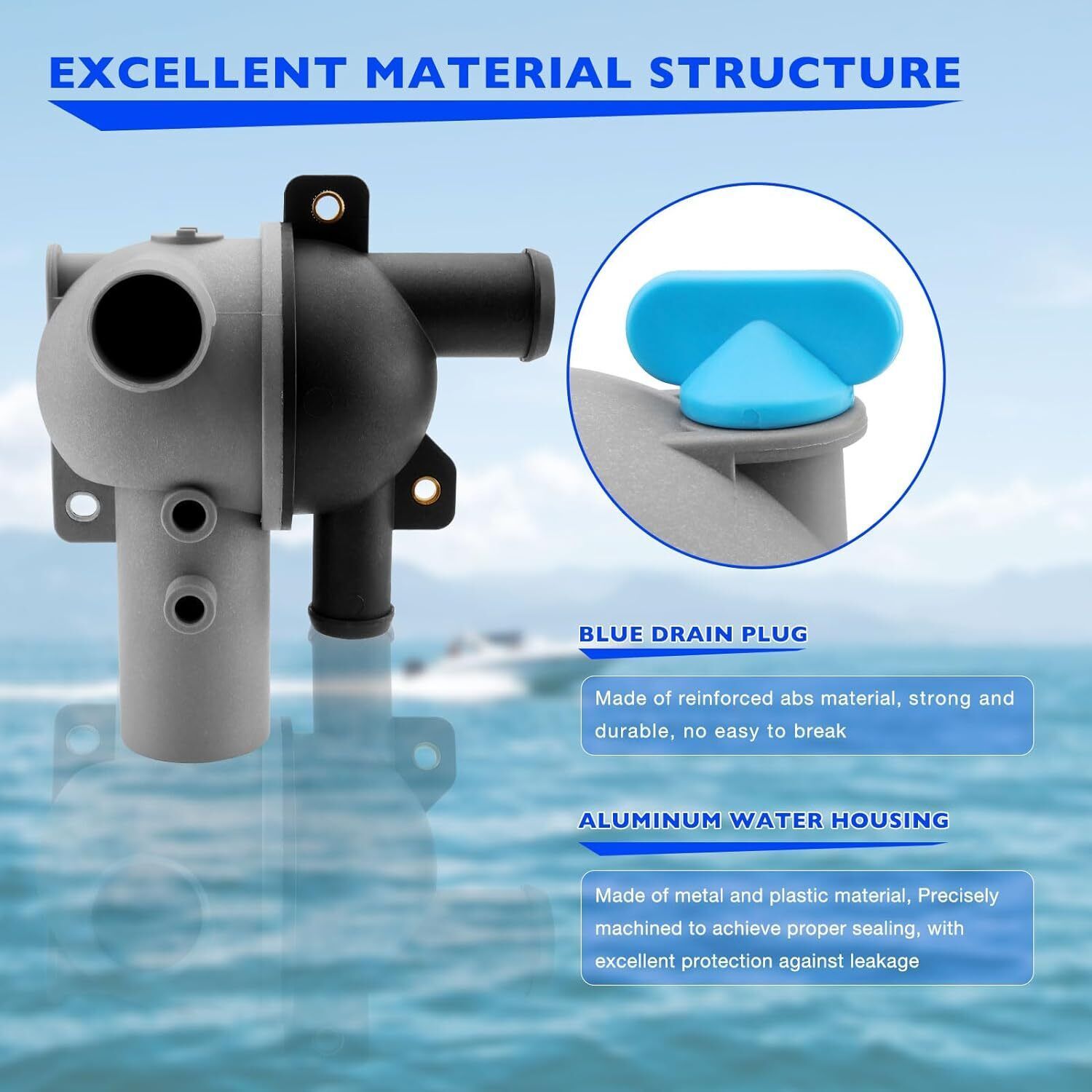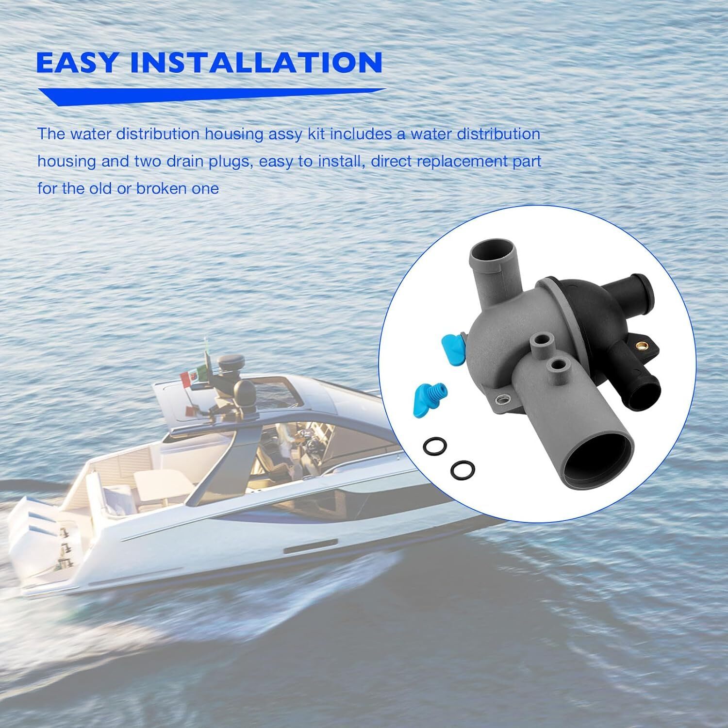 ? ?PERFECT FITMENT?This drain distribution housings assembly compatible with mercury mercruiser Alpha and Bravo year 1998 stern drives and inboard gas engines 350 377 383 4.3l 5.0l 5.7l 6.2l 262 305 350 377 cid v6 v8, make it a versatile and reliable choice for various boats ? ?IDEAL REPLACEMENT?It's same performance and quality as the original parts, perfect match and alternate to mercury mercruiser inboard parts 863631T1 863802T2 863444T2, you can use our water outlets assembly with confidence so that save your money ? ?MAINTAIN YOUR ENGINES?The water drain assembly is specially designed to distribute or circulate water throughout the boat's cooling system, ensure that operational temperatures remain safe and regulated. Choosing this water drain distributor helps maintain your mercruiser stern drives or inboard gas engines operating safely while prolonging their lifespan, make it a valuable investment for long-term use ? ?DURABLE AND RELIABLE?The water drain distribute is made of metal and plastic material, which is wear-resistant, scratch resistant, impact resistant, corrosion. The aluminum water housing is precisely machined to achieve proper sealing and can achieve excellent protection against leakage. The drain plugs are made of reinforced ABS material, strong and durable, not easy to break ? ?EASY TO INSTALL?This drain distribute housings is easy to install, direct replacement part for the old or broken one. This package includes one water distribution housing and two drain plugs, make installation easy and hassle-free for boat owners and mechanics alike