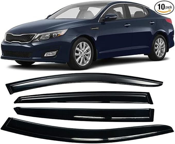 Compatible with 2011-2015 Kia Optima. Package Content: 4 pcs Window visors. High quality acrylic PC Full-size Side Window Deflectors ? This 4-piece set includes passenger and driver side rain guards that create a seamless look that protects you from sun rays, rain drops, and wind while you?re driving with the window down. Made of PMMA and Manufactured With Injection Moulding Process That Ensures Heavy Duty Strength Smooth Look Warranty: 1 year Limited Warranty. Long lasting material designed to withstand the rigors of the elements.