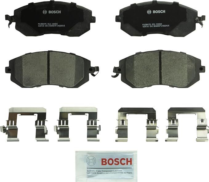 ? See more product details Today, one of every three Asian, Domestic, and European vehicles on the road in North America includes Bosch braking components. That's because Bosch has been a key player in the braking industry since applying for its first brake system design patent in 1936. The Bosch QuietCast line draws on this robust experience to deliver OE quality performance, industry-leading strength and durability, and exclusive innovations including Molded Shim Technology (MST). QuietCast pads feature the industry's best pre-attached OE style multilayer rubber core shims, ensuring the highest quality bond between rubber and steel, for lower noise, increased strength, and superior corrosion resistance. The proprietary Ceramic friction material is meticulously engineered to achieve superior performance, exceptional stopping power, and quiet operation with low dust. Corrosion and rust resistant powder-coated backing plates deliver increased product life. OE style slots and chamfers ensure premium quality, fit, and function. Set includes pads for 1 axle (2 wheels), hardware kit (where available), and synthetic lubricant for reduced resistance on sliding contact points. Compatible with select vehicles (Note: vehicle trim level may affect fitment - verify specific vehicle fitment details with fit checker above).
