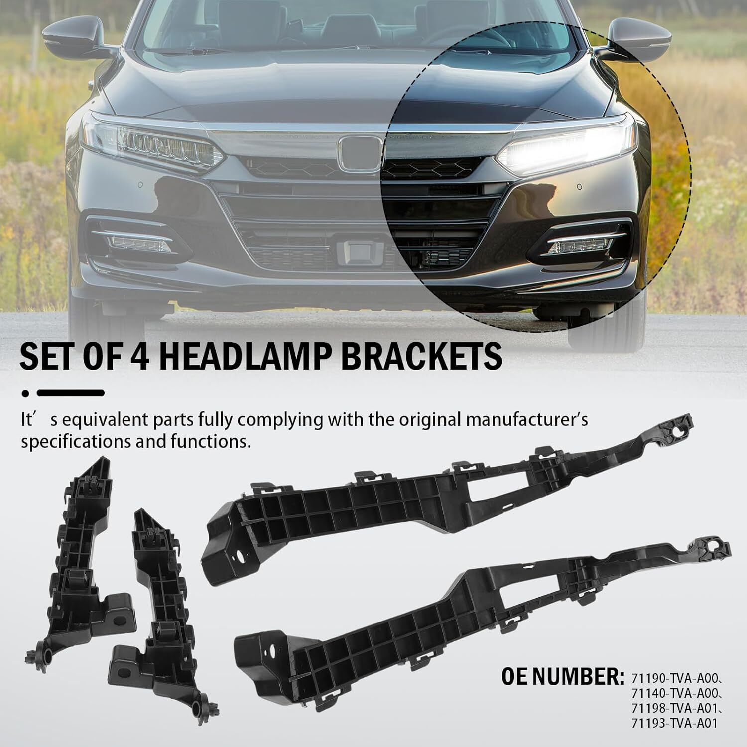 Direct Replacement: This bumper bracket serves as a direct replacement for the 2018-2020 Honda Accord, ensuring a hassle-free installation process High-Quality Construction: Crafted from steel, these brackets guarantee durability and reliability, meeting or exceeding compliance standards Exact Fit: Designed to match OEM numbers 71190-TVA-A00 and 71198-TVA-A01, along with numbers 71140-TVA-A00 and 71193-TVA-A01, for precise compatibility and fit Optimal Safety: Purchasing as a pair ensures a matching look and optimal safety for your vehicle, offering peace of mind on the road Package Contents: Each package includes 4pcs of front driver and passenger headlamp bumper support brackets, providing comprehensive coverage for your Accord