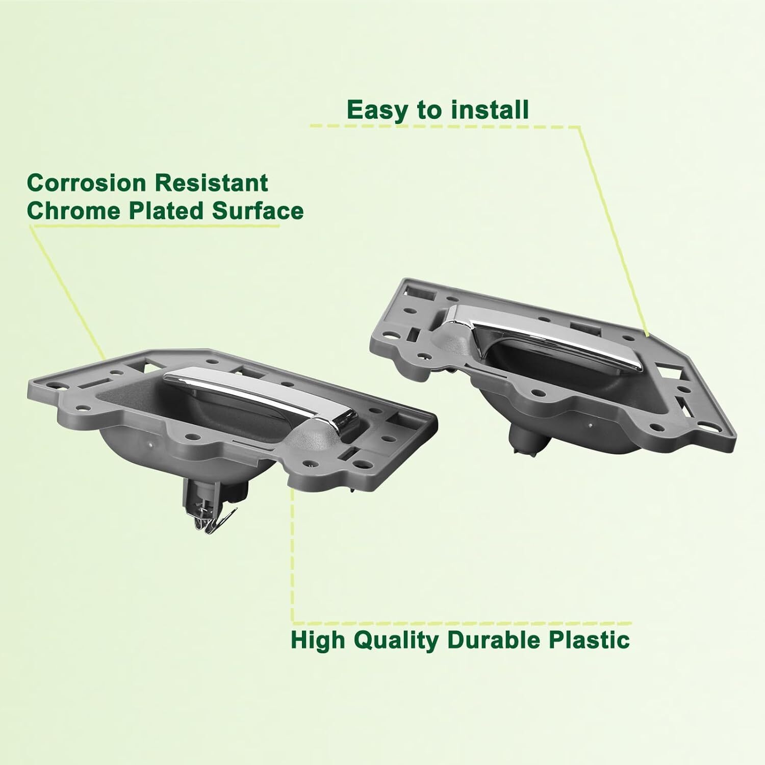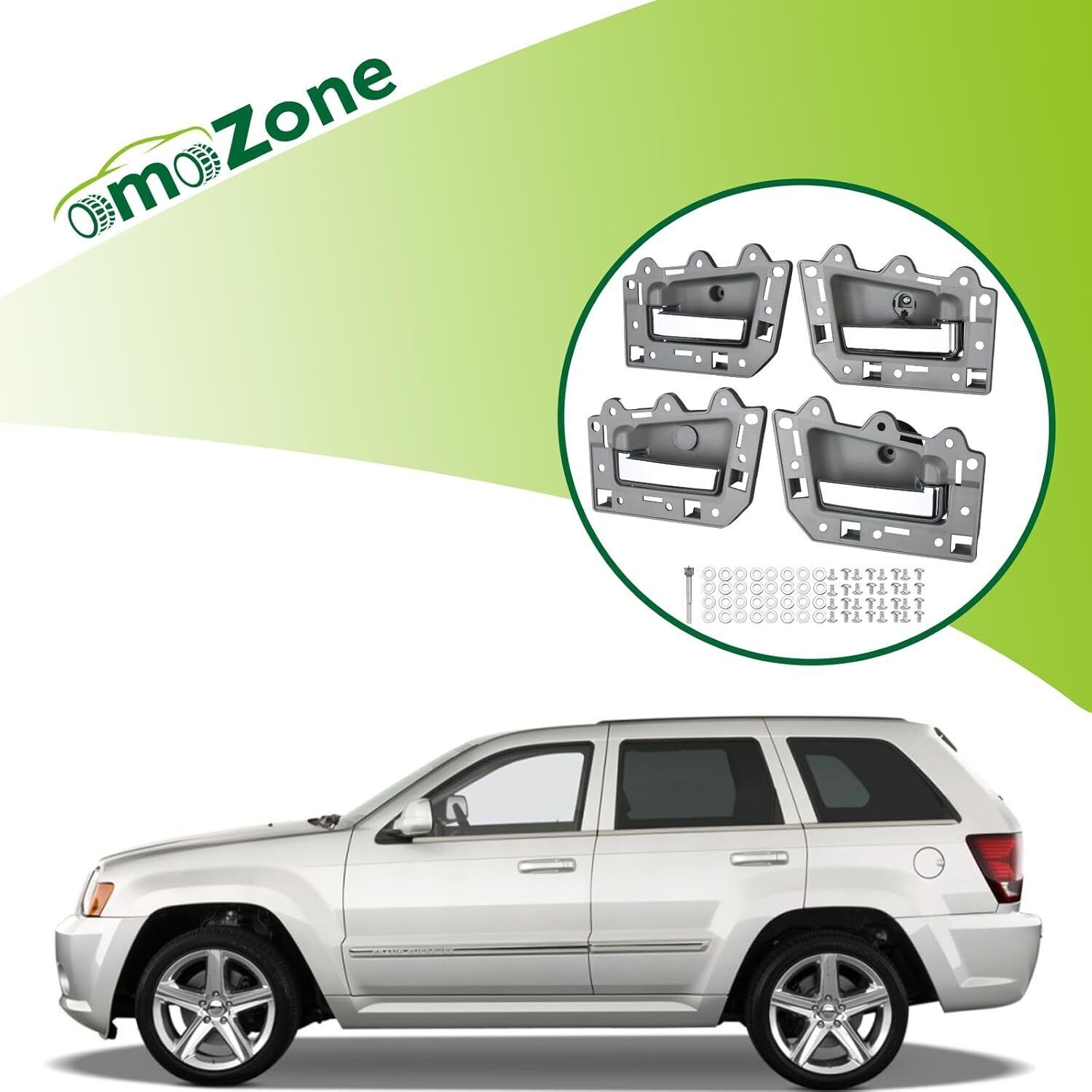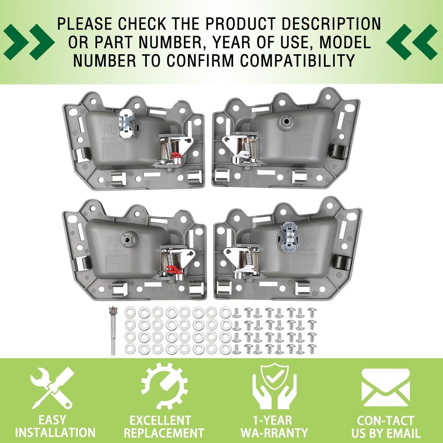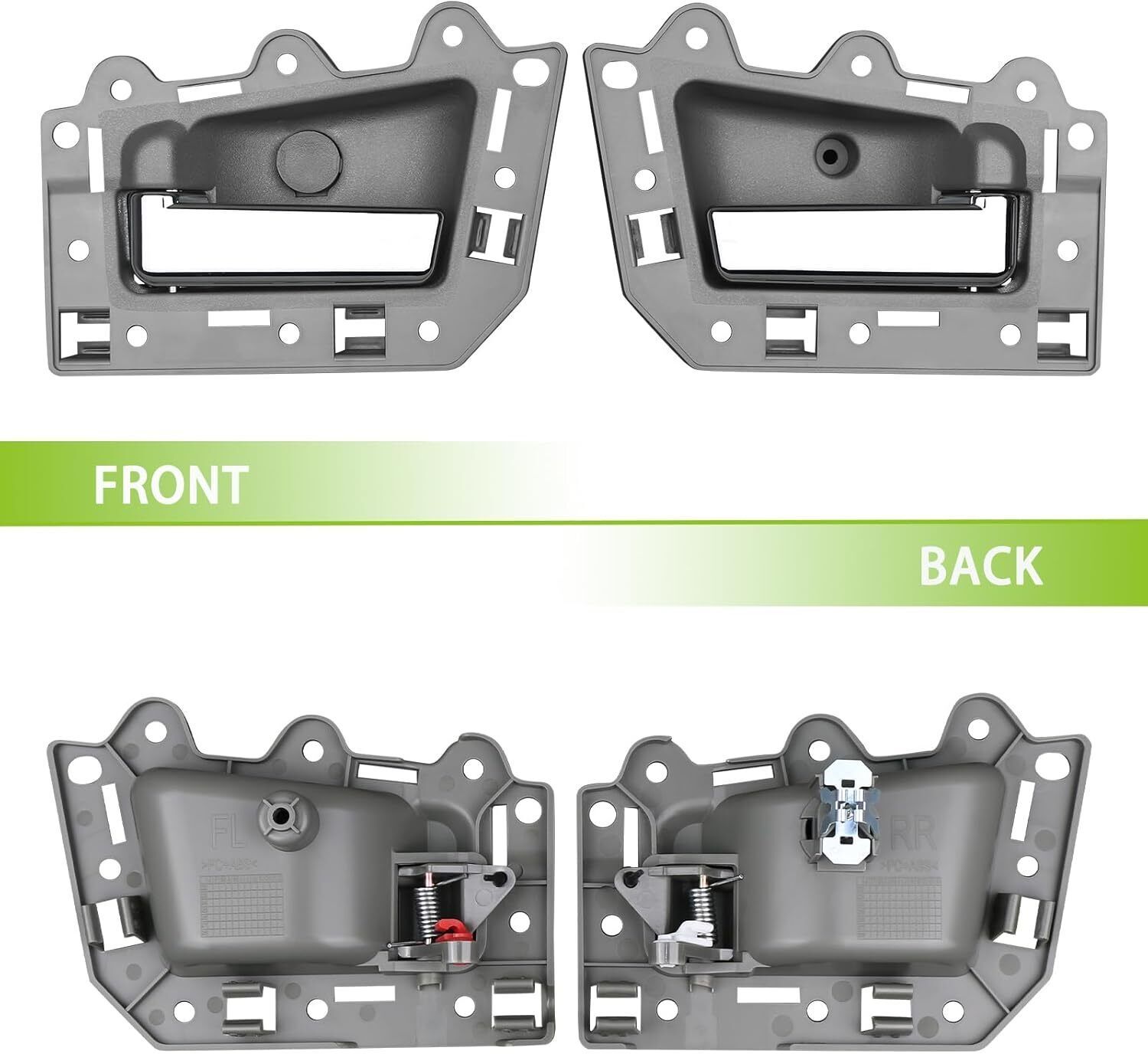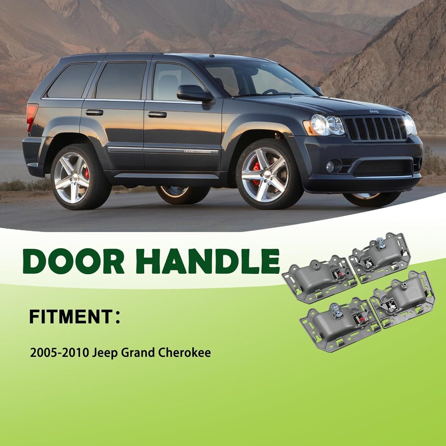 REPLACEMENT PART NUMBER:1JV471DVAA 1PE89XDVAA 1QE071DVAA 1JV461DVAA 1PE88XDVAA 1QE061DVAA 5HR381D5AG 82166 82167 82296 COMPATIBLE WITH:This Inside door handle kit fit for Jeep Grand Cherokee 2005 2006 2007 2008 2009 2010 05 06 07 08 09 10. Please refer to the vehicle compatibility above to ensure proper part. FEATURES:The Inner door handle with upgraded plastic process,high hardness,oxidation resistance,heat resistance, corrosion resistance,replacement of new parts and car perfect fit,Solve your safety problems while making your car look new and more beautiful SERVICE LIFE EASY INSTALLATION:This pull handles are not the real original parts,but it uses advanced technology and good materials in line with oem standards,more effective extension of service life,directly replace the old handle, easy to install can save you time and money BUY WITH CONFIDENCE:If you have any questions or concerns about the Interior door handle set of 4,please tell by email and we will provide you with satisfactory service support