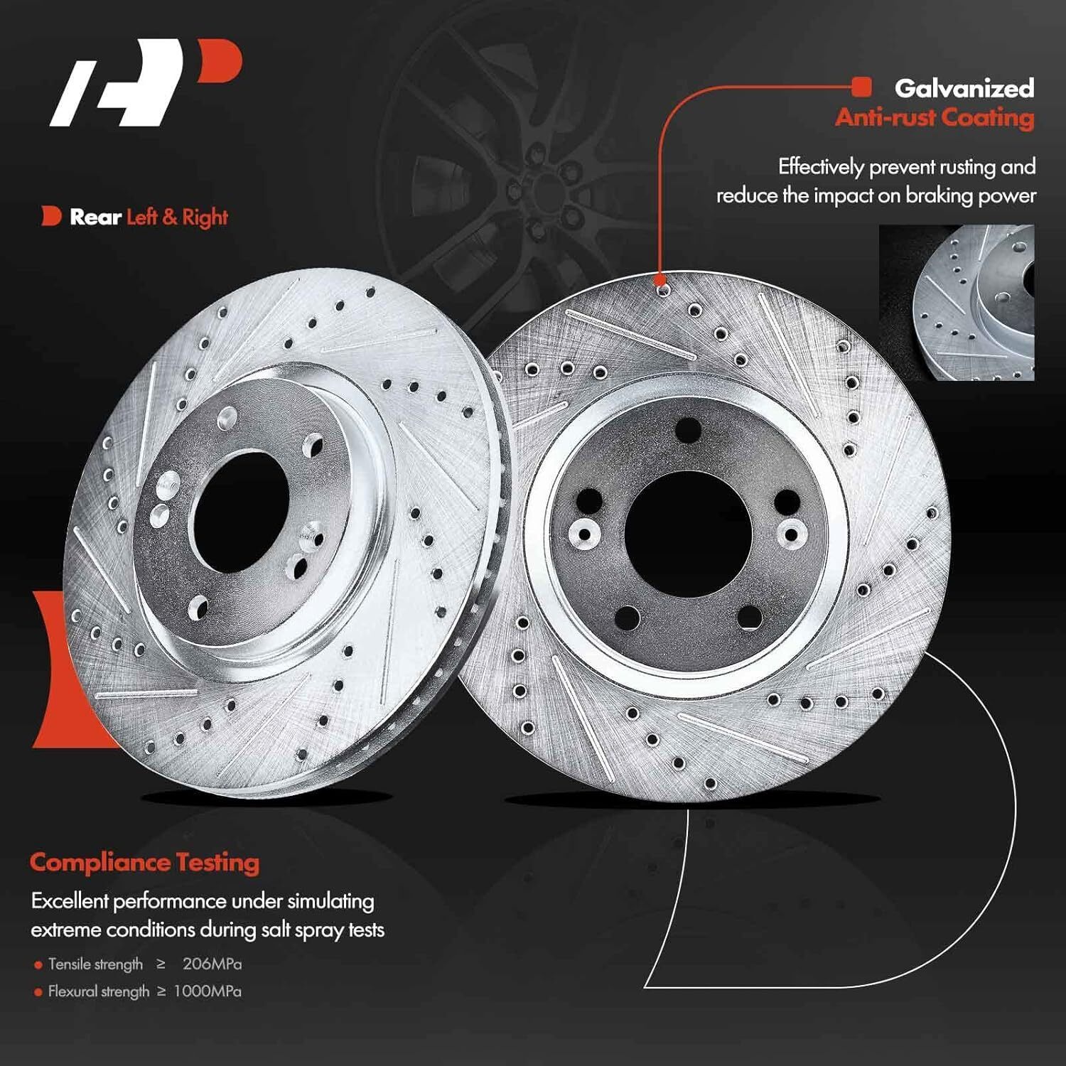 [Perfect Fitment]: Compatible with Hyundai Sonata 2011-2014, Sonata 2015 (Hybrid, Hybrid Limited); Compatible with Kia Optima 2011-2014 (2.4L Only), Optima 2015 (EX, Hybrid EX, Hybrid LX, LX, SX), Optima 2016 (Hybrid, Hybrid EX)---Front Left and Right, Driver and Passenger Side [Reference Number]: The A-Premium Drilled and Slotted Brake Rotors' reference number: S-31427, S31427 + Disc Brake Pads' reference number: P-1444, P1444 ---Please enter your vehicle information in the top left corner of listing and check our "Special Note" before ordering [Specification]: ROTORS: ?Material: G3000 Metallurgy, ?Mounting Bolt Hole Quantity: 5, ?Outside Diameter (mm): 300, ?Discard Thickness (mm): 26.42; PADS: ?Material: Ceramic, ?Thickness (mm): 17.27, ?Pad Wear Indicator Included: Yes [Package Details]: 2x Drilled and Slotted Disc Brake Rotor + 4x Disc Ceramic Brake Pads + Brake Lubricant (High-temperature Grease) + Installation Hardware. Complete kit purchase for more time-saving and peace of mind. [Buy with Confidence]: A-Premium offers a one-year unlimited-mileage guarantee on our meticulously crafted drilled and slotted disc brake rotors and ceramic pads. We offer a wide variety of automotive accessory categories, ensuring that you can hit the road with peace of mind.