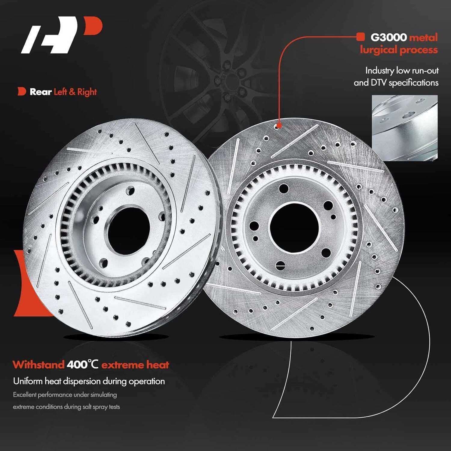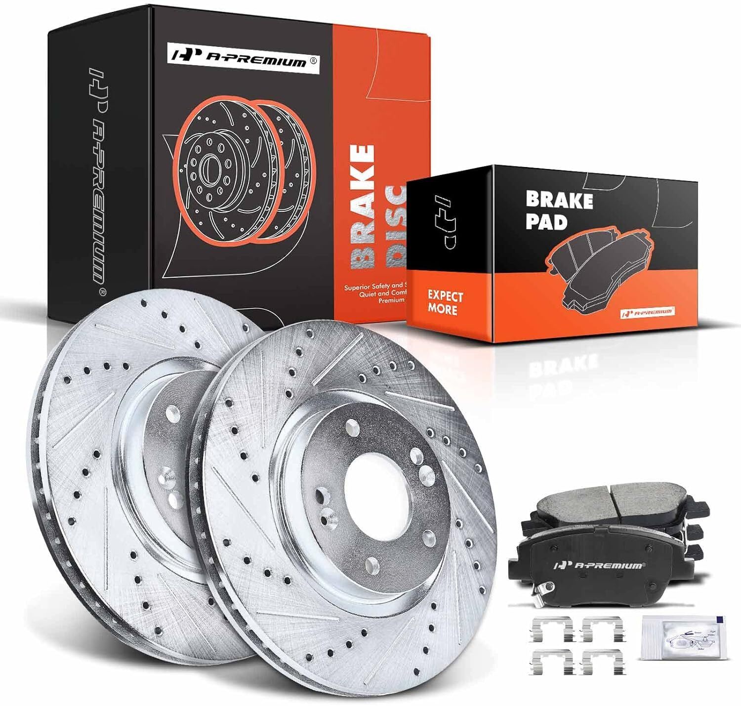 [Perfect Fitment]: Compatible with Hyundai Sonata 2011-2014, Sonata 2015 (Hybrid, Hybrid Limited); Compatible with Kia Optima 2011-2014 (2.4L Only), Optima 2015 (EX, Hybrid EX, Hybrid LX, LX, SX), Optima 2016 (Hybrid, Hybrid EX)---Front Left and Right, Driver and Passenger Side [Reference Number]: The A-Premium Drilled and Slotted Brake Rotors' reference number: S-31427, S31427 + Disc Brake Pads' reference number: P-1444, P1444 ---Please enter your vehicle information in the top left corner of listing and check our "Special Note" before ordering [Specification]: ROTORS: ?Material: G3000 Metallurgy, ?Mounting Bolt Hole Quantity: 5, ?Outside Diameter (mm): 300, ?Discard Thickness (mm): 26.42; PADS: ?Material: Ceramic, ?Thickness (mm): 17.27, ?Pad Wear Indicator Included: Yes [Package Details]: 2x Drilled and Slotted Disc Brake Rotor + 4x Disc Ceramic Brake Pads + Brake Lubricant (High-temperature Grease) + Installation Hardware. Complete kit purchase for more time-saving and peace of mind. [Buy with Confidence]: A-Premium offers a one-year unlimited-mileage guarantee on our meticulously crafted drilled and slotted disc brake rotors and ceramic pads. We offer a wide variety of automotive accessory categories, ensuring that you can hit the road with peace of mind.