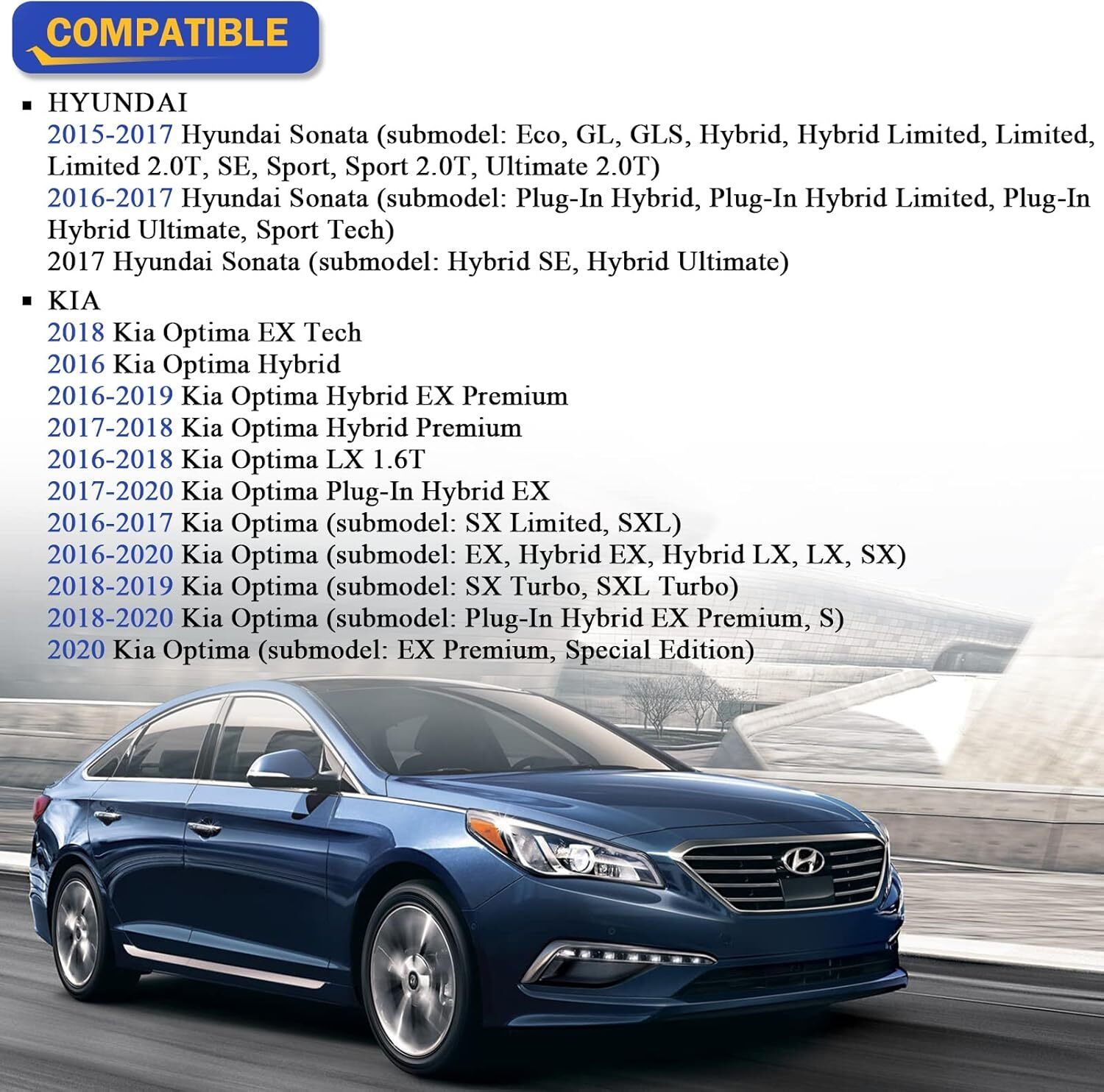 2015-2017 Hyundai Sonata (submodel: Eco, GL, GLS, Hybrid, Hybrid Limited, Limited, Limited 2.0T, SE, Sport, Sport 2.0T, Ultimate 2.0T)