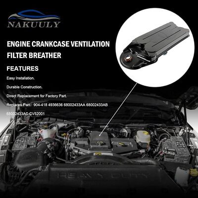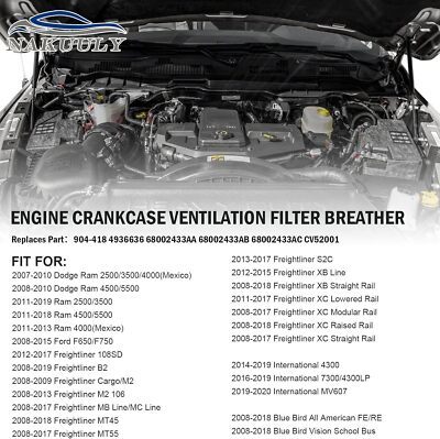Replaces Part: CV52001, 68002433AA 68002433AB 68002433AC , 4936636, 904-418.While this is not a genuine OEM part, it is a direct replacement. See below for the full vehicle compatible list Fitment: The crankcase filter compatible with 2008-2021 Dodge Ram 2500 3500 4500 5500 , 2008-2015 Ford F650 / F750 , 2008-2018 Blue Bird All American FE/RE, 2008-2018 Blue Bird Vision School Bus, 2012-2017 Freightliner 108SD, 2008-2019 Freightliner B2, 2008-2009 Freightliner Cargo/M2, 2008-2013 Freightliner M2 106, 2008-2017 Freightliner MB Line/MC Line, 2011-2014 Freightliner MCL, 2008-2018 Freightliner MT45, 2008-2017 Freightliner MT55. Any Vehicle Using The Cummins 6.7L ISB Engine. Filter replacement interval: The recommended replacement interval for the crankcase ventilation filter is 67,500 miles, or when a message appears on your overhead console to remind you that the crankcase ventilation filter is clogged OEM Fit: Crankcase ventilation filter breather element is manufactured in full accordance with the standards of OE parts, and 100% factory inspection is carried out to ensure that the product is safe and durable Customer Support: The crankcase ventilation filter from BNakuuly comes complete with great customer support. If there are any problems with installation or use, we'll solve it in time