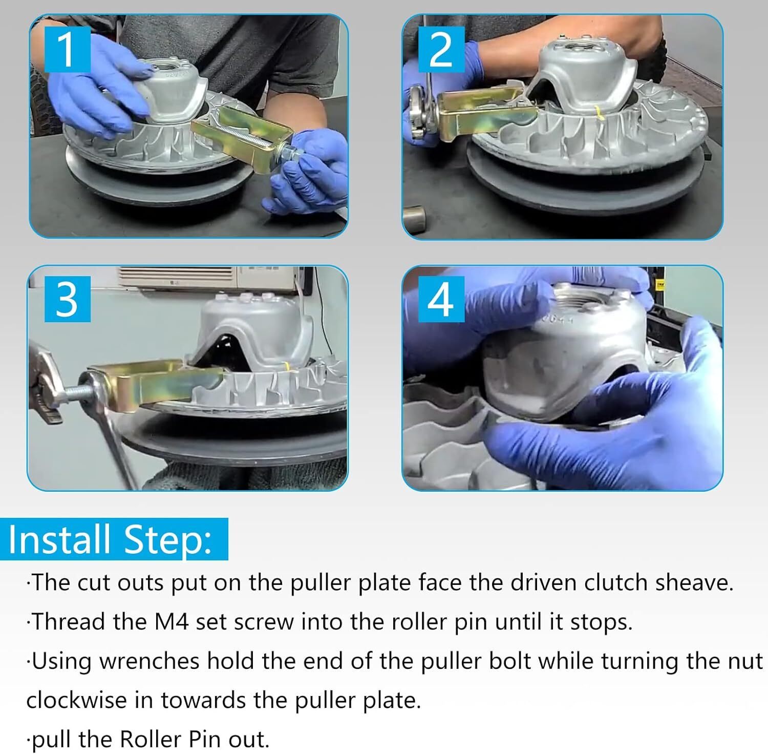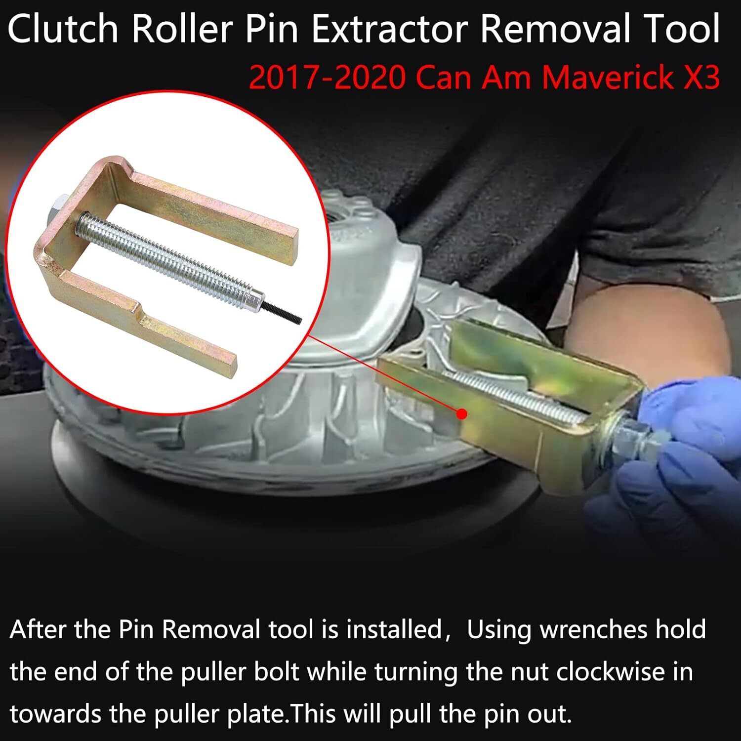 ?????Clutch Roller Pin Extractor Removal Tool Compatible With Can Am Maverick X3 2017 2018 2019 2020. ?????????This Roller Pin Removal Tool allows easy replacement of roller pins without damaging the clutch(No slide hammer necessary for removal.) ???????????????After the Pin Removal tool is installed, Using two 3/4" wrenches hold the end of the puller bolt while turning the nut clockwise in towards the puller plate.This will pull the pin out. ?????????????Our Removal Tool is made of high quality aluminum for increased strength,and anodized surface that is highly resistant to any bad weather,greatly prolong the service life. ???-?????????????If for any reason at all,you are not fully satisfied with the Roller Pin Removal Tool,you can contact us through amazon message for carefree REPLACEMENT or REFUND.