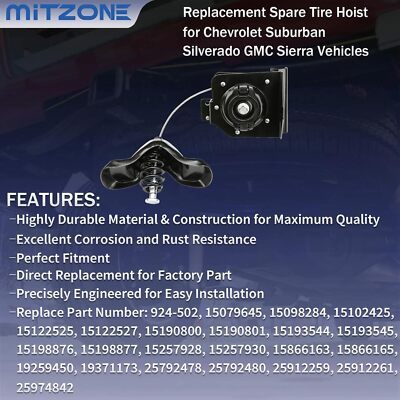 Spare Tire Hoist, Spare Tire Carrier Compatible with GM 2003-2010 Heavy Duty Pickup CORROSION RESISTANT: The surface of this spare tire winch is specially coated to prevent future rust and corrosion EXACT FIT: Compatible with Chevrolet: 2003-2010 Silverado 2500 HD; 2003-2006 Silverado 3500; 2007 Silverado 3500 Classic; 2007-2010 Silverado 3500 HD; Compatible with GMC: 2003-2010 Sierra 2500 HD; 2003-2006 Sierra 3500; 2007-2010 Sierra 3500 HD; 2007 Sierra 3500 Classic OE NUMBER: 924-502, 15079645, 15098284, 15102425, 15122525, 15122527, 15190800, 15190801, 15193544, 15193545, 15198876, 15198877, 15257928, 15257930, 15866163, 15866165, 19259450, 19371173, 25792480, 25912261, 25974842, 25974844 PURCHASE WITH CONFIDENCE: If you are not sure about the vehicle fitment or any questions or concerns, please message us via amazon. We will resolve the issue to meet your satisfaction