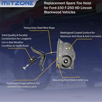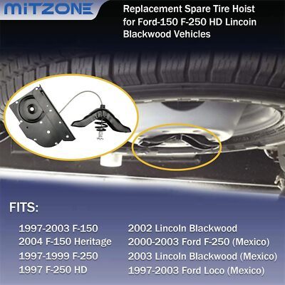 VALUABLE CHOICE: Manufactured from high-quality materials for durability. This part has undergone a rigorous inspection to ensure high quality. Direct replacement - this spare tire hoist is precisely engineered to replace the original hoist. Easy installation simply remove the spare tire, unbolt the original part, and bolt on this replacement CORROSION RESISTANT: The surface of this spare tire winch is specially coated to prevent future rust and corrosion EXACT FIT: Compatible with 1997-2003 Ford F-150, Compatible with 2004 Ford F-150 Heritage, Compatible with 1997-1999 Ford F-250, Compatible with 1997 Ford F-250 HD , Compatible with 2002 Lincoln Blackwood OE NUMBERS: 924-526, 1L3Z1A131AA, 2L3Z1A131AA, F65Z1A131AC, F75Z1A131BC PURCHASE WITH CONFIDENCE: In BSOC AUTO Store, right parts are guaranteed. If you are not sure about the vehicle fitment or the part ever fails on your vehicle after purchase, please contact us and we?ll take care of it. 30 Days money back and one years replacement warranty within 12hours response At BSOC AUTO (Exclude Sunday), zero purchase risk guaranteed is for our every customer's smile