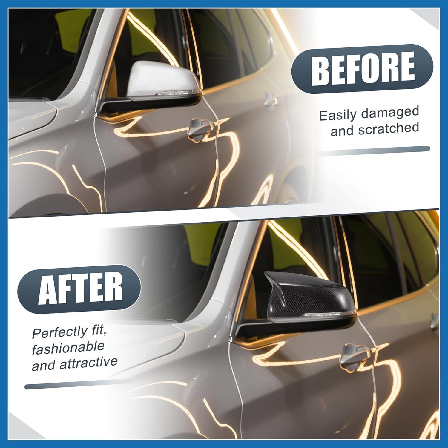 Precise: [OEM Fit] Brand new replacement of mirror cover for BMW X1 F48 (06.2015-2019), for BMW X1 F48 LCI (05.2019-up), for BMW X1 xDrive 25e plug-in hybrid (09.2019-up), for BMW 2 Series Active Tourer F45 (2014-up), for BMW 2 Series Active Tourer F45 LCI (2018-up), for BMW 2 Series Gran Tourer F46 (06.2015-up) Tough: [Dutable Material] Made of durable real carbon fiber, protect the mirror caps from scratches and dirts for a good look. Sturdy: [Cool Appearance] Black carbon fiber pattern design, enhances your exterior style, and creates your car a sporty look. Suitable: [Easy to install] These are replacement mirror cover units, you need to remove the old mirror caps and replace them with these new ones, and clip into place for simple installation. Made to stay applied and brilliant for the life of your vehicle. Convenient: [Package Included] 1 Pair Door Rearview Mirror Cover Caps (Driver Side Passenger Side), 1 Pcs Removal Tool.