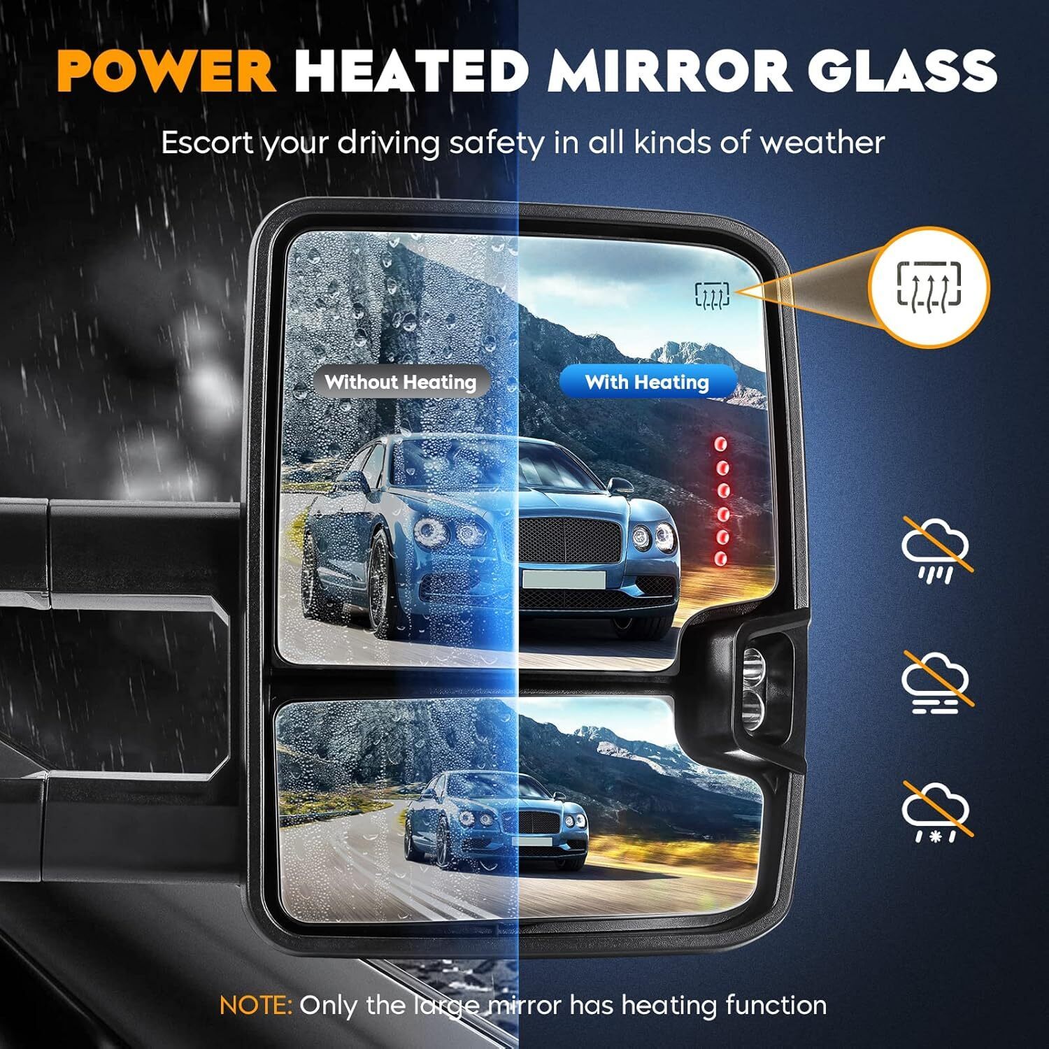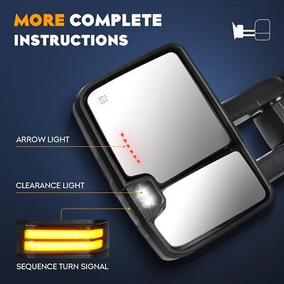 ?Towing Mirrors Fitment: For Chevrolet 2002 Avalanche 1500 2500; 1999 2000 2001 2002 Silverado 1500 / 1500 HD / 2500 / 2500 HD / 3500; 2000 2001 2002 Suburban 1500 2500; 2000 2001 2002 Tahoe ?Towing Mirrors Fitment: For GMC 2001 2002 Sierra 1500 / 1500 HD / 2500 / 2500 HD / 3500; 2000 2001 2002 Yukon / Yukon XL 1500 / Yukon XL 2500 ?Function: Arrow light; Sequence turn signal running light; Clearance light; Manual telescoping; Manual folding; Powered mirrors; With heated function ?What Included: A Pair of Towing Mirrors (Including driver left side and passenger right side). These towing mirrors are made of high-quality glass and ABS material, which provide clear visibility even in bad weather to ensure your travel safety. ?This product involves a variety of functions such as indicators, heating, telescoping, etc. Please contact me if you do not know how to wire, I will send electronic wiring diagram.
