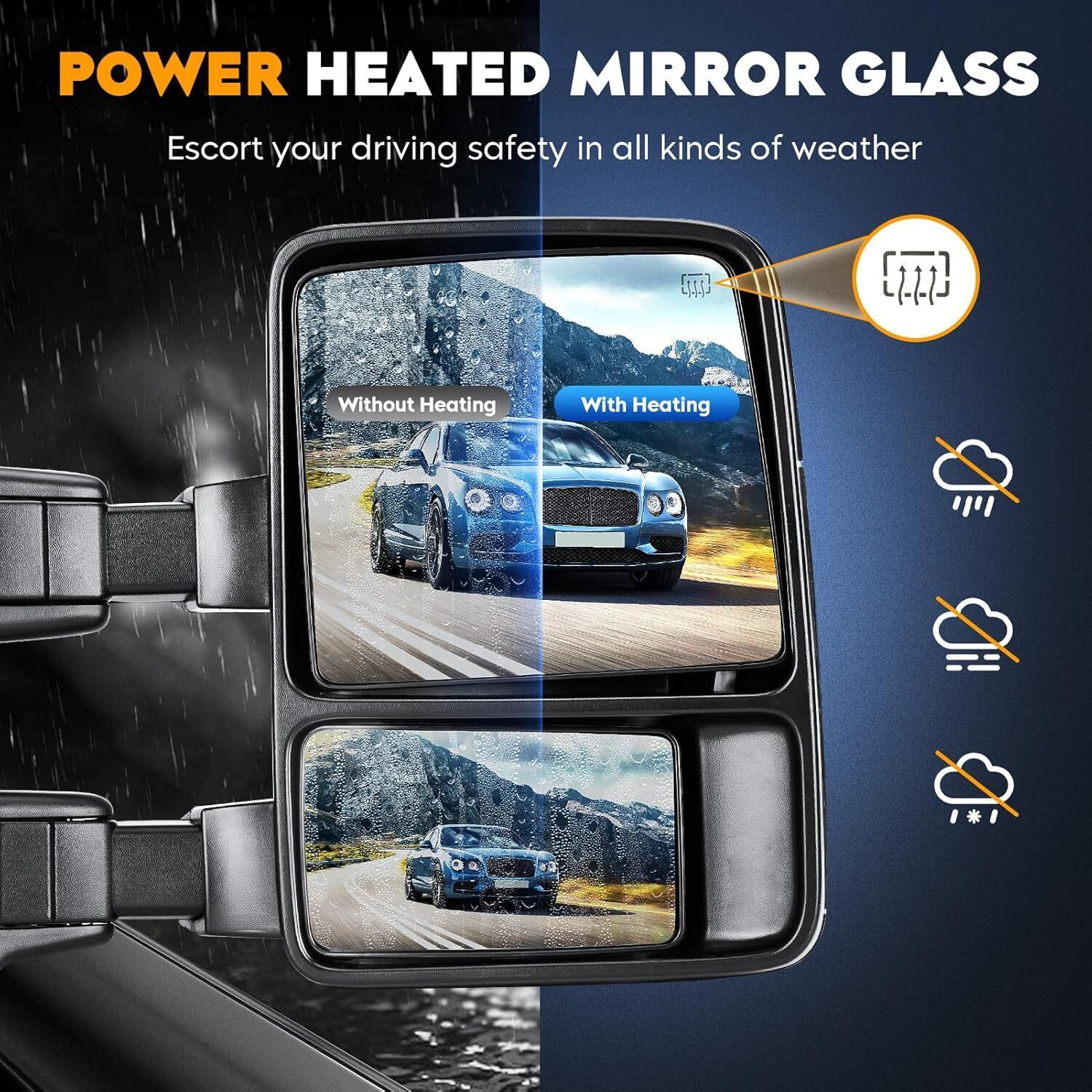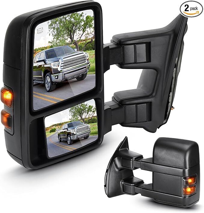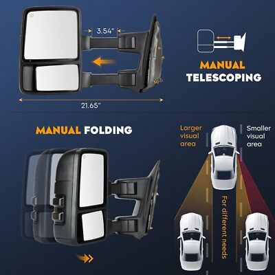 ?Towing Mirrors Fitment: For Ford F-250 Super Duty / F-350 Super Duty 1999 2000 2001 2002 2003 2004 2005 2006 2007 ?Function: Power heated; Smoke-Turn signal; Manual folding; Manual telescoping; Large glass can be adjusted electrically up and down, left and right; The small glass can be manually adjusted ?What Included: A Pair of Towing Mirrors (Including driver left side and passenger right side). These towing mirrors are made of high-quality glass and ABS material, which provide clear visibility even in bad weather to ensure your travel safety. ?Note: More comprehensive product information is available in the vehicle model list, pictures, and descriptions. To avoid any inconvenience, kindly confirm that this product is suitable for your vehicle and meets your needs before placing an order. ?If any problems, feel free to contact us.