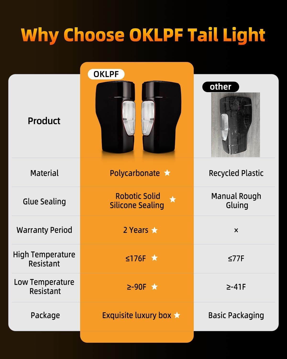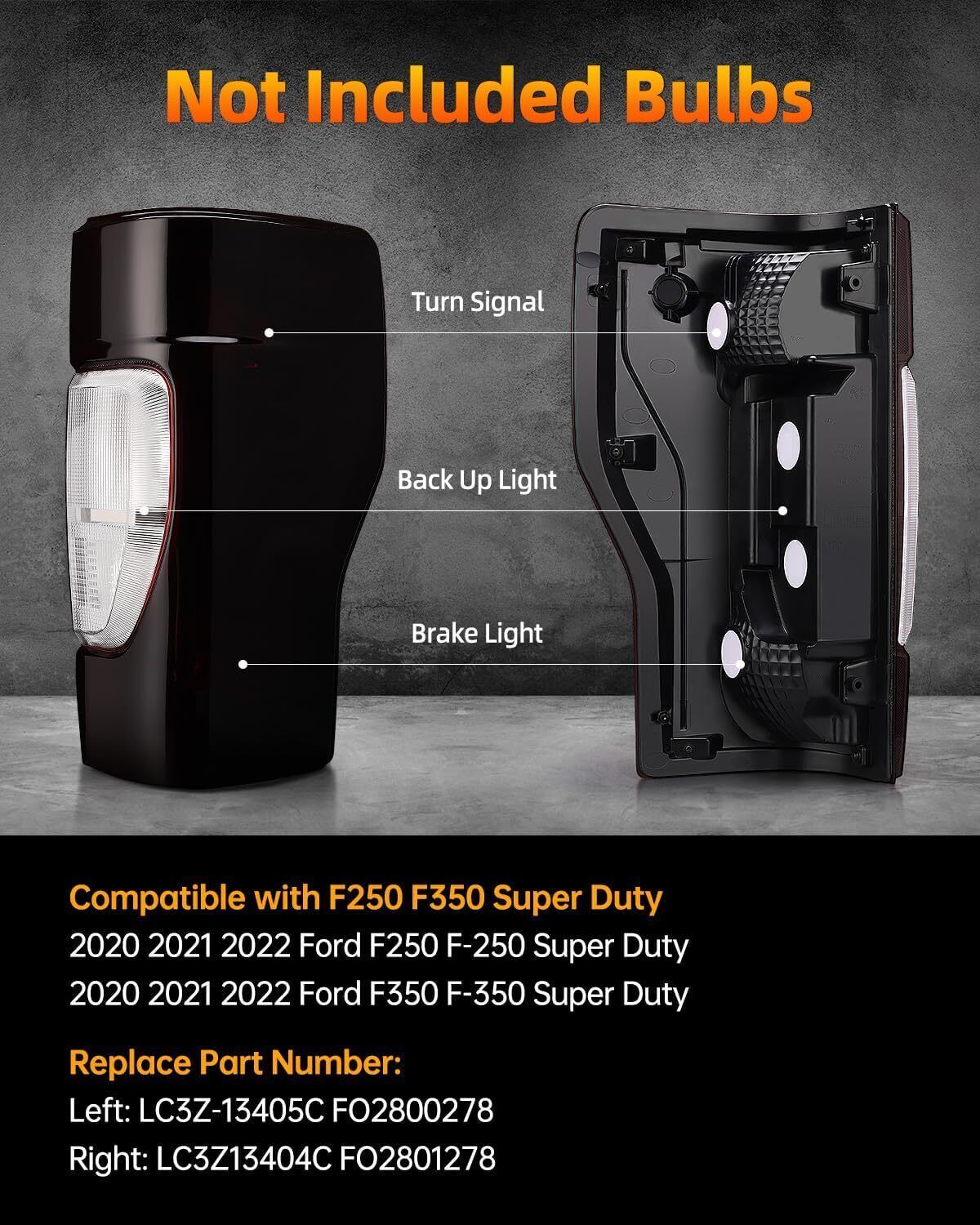 Compatible with: 2020 2021 2022 ford f250 super duty,2020 2021 2022 ford f350 super duty ?Replace part number: Left: LC3Z-13405C FO2800278,Right: LC3Z13404C FO2801278 Premium quality: The F250 smoked taillights are carefully designed and manufactured by us,using high quality materials for durability Multiple tests: Oklpf F350 smoked tail light undergoes temperature,humidity,dust,salt spray and water testing to make your everyday driving safer Easy to install: Oklpf F250 smoked tail lights installation process is simple and convenient.It's direct plug and play saving you valuable time and effort