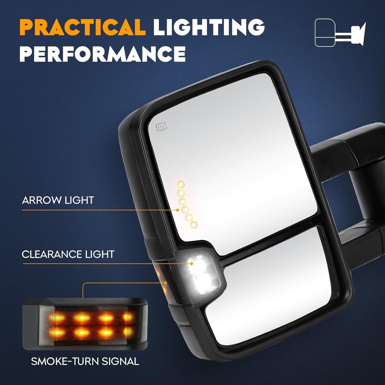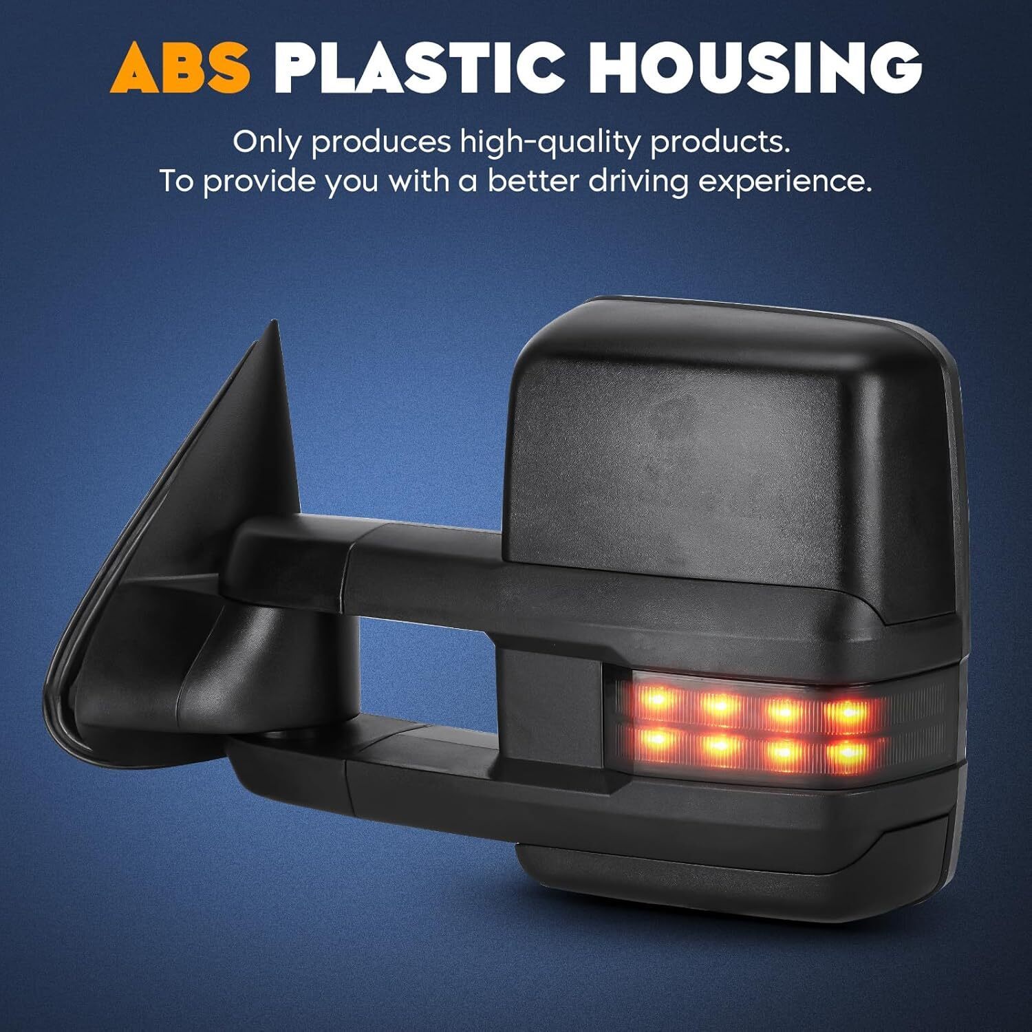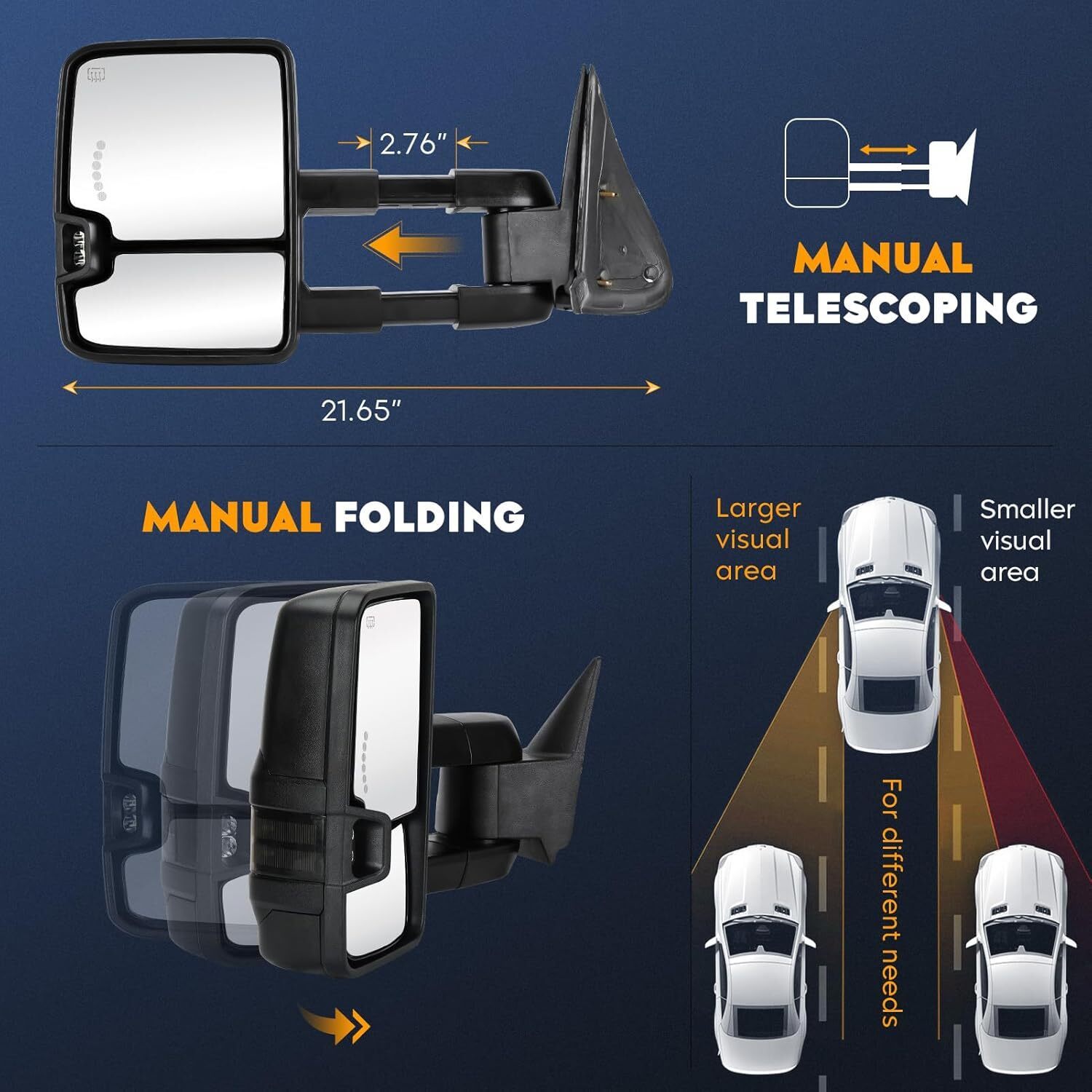 ?Towing Mirrors Fitment: For Chevrolet 2003-2006 Silverado 1500 3500 / Silverado 2500 HD; 2007 Silverado 1500 Classic / 1500 HD Classic / 2500 HD Classic / 3500 Classic; 2005-07 Silverado 1500 HD; 2003-2004 Silverado 2500; 2003-06 Suburban 1500 2500 Tahoe ?Towing Mirrors Fitment: For GMC 2003-2006 Sierra 1500 3500; 2007 Sierra 1500 Classic; 2003 2005 2006 2007 Sierra 1500 HD; 2003-04 Sierra 2500; 2003-06 Sierra 2500 HD; 2007 Sierra 2500 HD Classic / 3500 Classic; 2003-06 Yukon / Yukon XL ?Function: Power heated; Arrow light; Mirror back-Smoke turn signal light; Clearance light; Manual Folding; Manual telescoping; Large glass can be adjusted electrically up and down, left and right; The small glass can be manually adjusted ?What Included: A Pair of Towing Mirrors (Including driver left side and passenger right side). These towing mirrors are made of high-quality glass and ABS material, which provide clear visibility even in bad weather to ensure your travel safety. ?Please confirm whether the towing mirrors is suitable for your vehicle before purchase. If any problems, feel free to contact us.