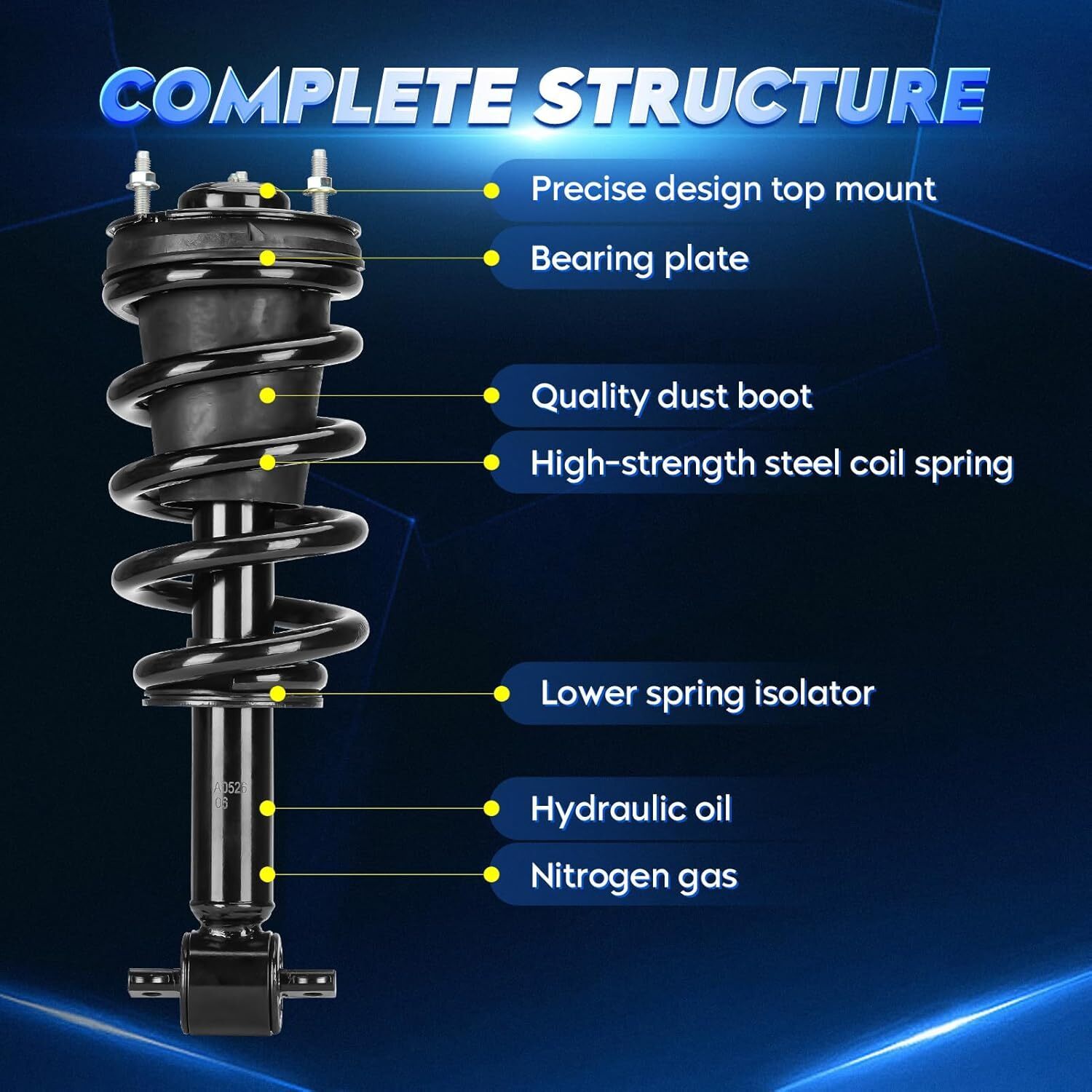 Compatible with: for Chevy Avalanche 2007-2013, for Chevy Suburban 2015-2018, for Chevy Suburban 1500 2007-2014, for Chevy Tahoe 2007-2019, for GMC Yukon 2007-2019, for GMC Yukon XL 2015-2019, for GMC Yukon XL 1500 2007-2012; For more details, please see the product description. Replace for Part Number: Replace 579104 4345073 Kit Includes: 2x front strut shock assembly w/ coil spring, 2x rear strut shock absorber Inflatable Design: Greater damping for greater work reliability; High-pressure gas and oil are separated by a floating piston, eliminating oil emulsification Quality Assurance: 12-month warranty! tested before shipping