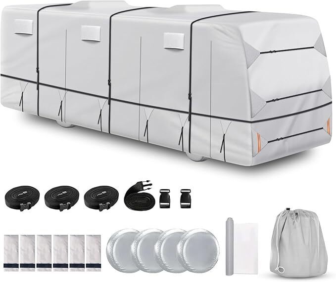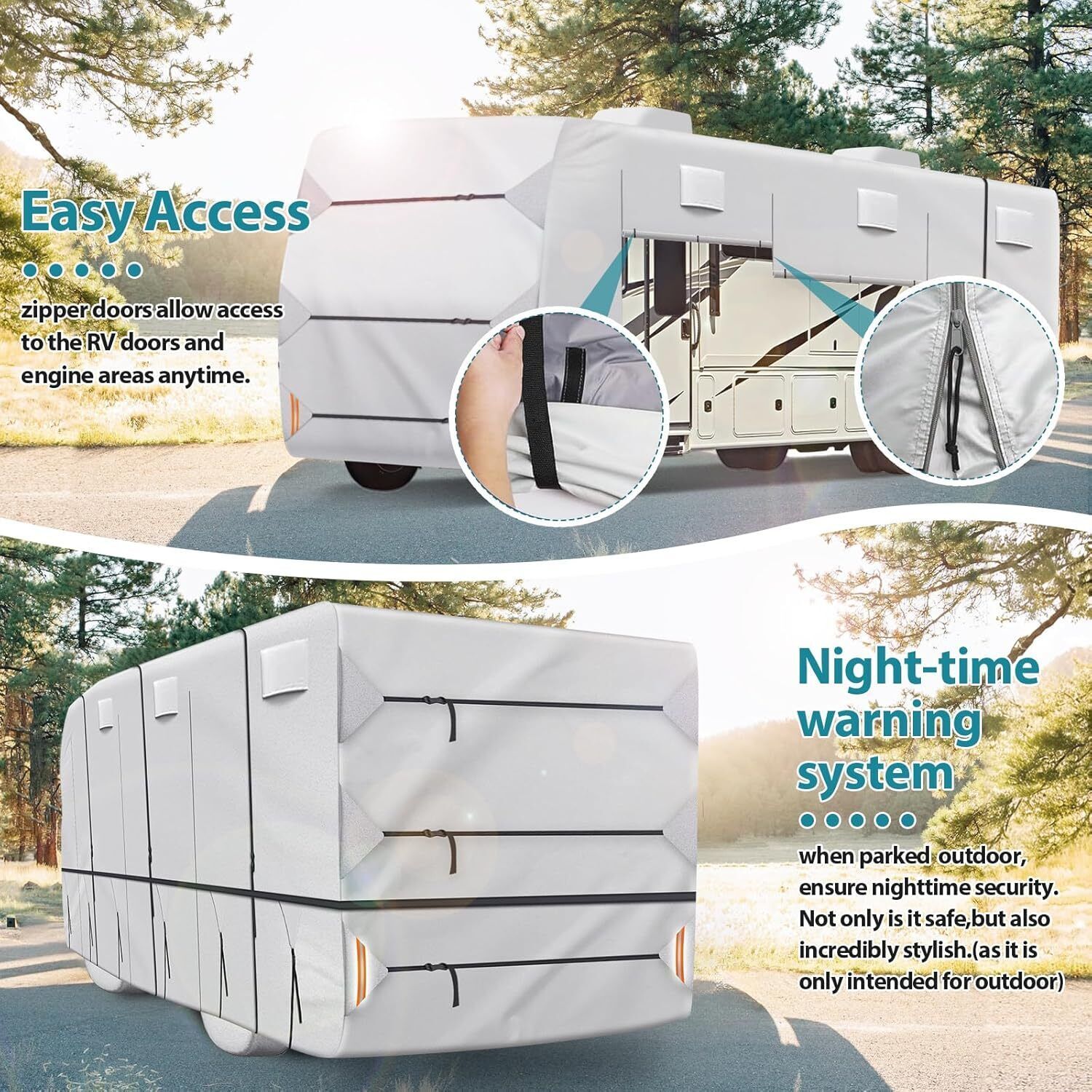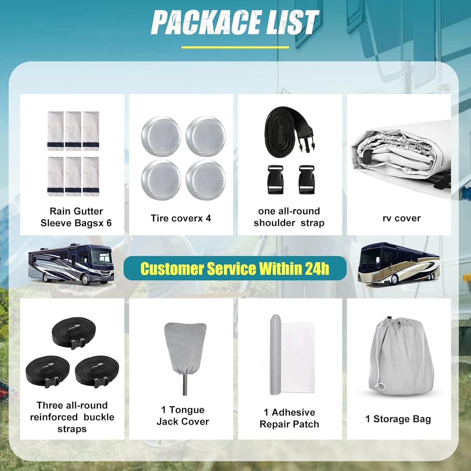 Dimension and Professional: Our RV Cover perfectly fits for 33-37ft motorhome,with dimensions of 450"L*110"W*125"H (please measure before purchasing).If you don?t know about the size of the RV, you can also get the suitable cover through the product description which has a bit of common models on the market.Special RV Cover for Winnebago, Tiffin Motorhomes, Thor Motor Coach, Coachmen and so on. Heavy Duty Material: Our cover is made of high-quality 420D oxford for the top and 300D oxford for the sides. The material is 100% waterproof, providing water resistance of up to 2500 mm due to the PVC coating.It offers a durability that lasts at least twice as long as non-woven covers. Wind and Sun Proof: The oxford cloth feels soft and keeps the environment inside the cover dry, repels all moisture, sun protection from damaging UV rays. Allows cover to breath preventing moisture build-up under the cover; Anti-scratch soft cotton layer protects vehicle finish, and also has fire retardant, water repellent, anti-static effects, providing gentle protection for your motorhomes. More Straps Designed: 6PCS Side Bottom Straps +3 Extra All-round Straps +3 Front Rear Tension Panel Straps to wrap the cover firmly on the RV, 4 reflective strip design can reflect the surrounding light at night, thereby providing a certain warning effect for pedestrians and drivers.The adjustable length buckle strap is designed to secure the cover in place during windy conditions. Come with a waterproof bag you can easily fold the cover and carry it with you. Accessibility Design: 3 rollable panels on both sides allow accessing to the trailer anytime, easy to view and check interior situation. The bottom features reinforced corners with 300D cloth to prevent wear. Front labels on the camper covers for easy installation.Our RV covers are specially designed with ventilation openings on each side, featuring a total of 6 ventilation ports, effectively reducing wind stress, expelling internal moisture Full Content: Class A RV Cover x1, Tire Cover x4, Lashing Strap x3, Gutter Spout Cover x6, Jack Cover x1, Adhesive Repair Patch x1, Storage Bag x1. Please measure before purchase. Measurement should include the bumper,ladder and spare tire, but not include the hitch. Please cover or tape any sharp edges with towels, rags or foam pads to prevent wear and tear on your cover No Worry Shopping: 30-day money-back with no questions asked. If there are any quality issues with the cover within two years, please CONTACT US first. We'll offer repair solutions or a replacement according to repairability.