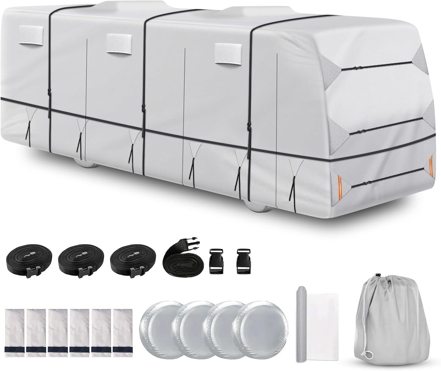 420D Top Class A RV Cover Fits 33'-37' Waterproof Rip-Resistant Anti-UV Motorhome Camper Cover for Winter Snow with Jack Cover 4 Tire Covers and Gutter Covers