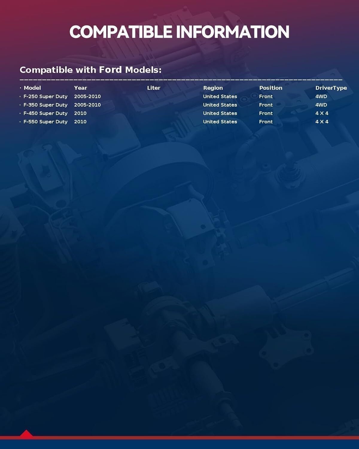 ?Compatible Vehicles?Front Wheel Bearing for 2005 - 2010 F250 Super Duty, 05-10 F350 Super Duty. OE / Interchange: 515081, 715081, 725-0357, WE61403 , 102017, BR930695, SP940200 ?Hub Specification? Front Hub Bearing Assembly For 4WD SRW Only, 8 Lugs, ABS System, Flange Diameter:7.99IN, Flange ?Material Quanlity?Wheel Hub Bearing Assembly with Quad Lip Seal Design is Specially Quality-Tested and Engineered to the Highest of Manufacturing Standards, Meeting or Exceeding OE Quality. The Induction-Hardened Raceway Provides Superior Load-Bearing Capacities And Service Life. Worry-Free of Abnormal Noises or Faulty Connections ?Easy Installation?The Wheel Bearing Assembly with Corrosion Protection is Easy to install with No Special Tools Required and it will Fit or Work like the Factory Wheel Hub Bearing ?Quality Guarantee?KAX Bearing Hub Assembly Provide 12 Months Warranty and 24 Hours Online Services. If You have Any Question, Please be Free to Contact us. Kit Includes: 2 x Bearing Hub Assmebly.