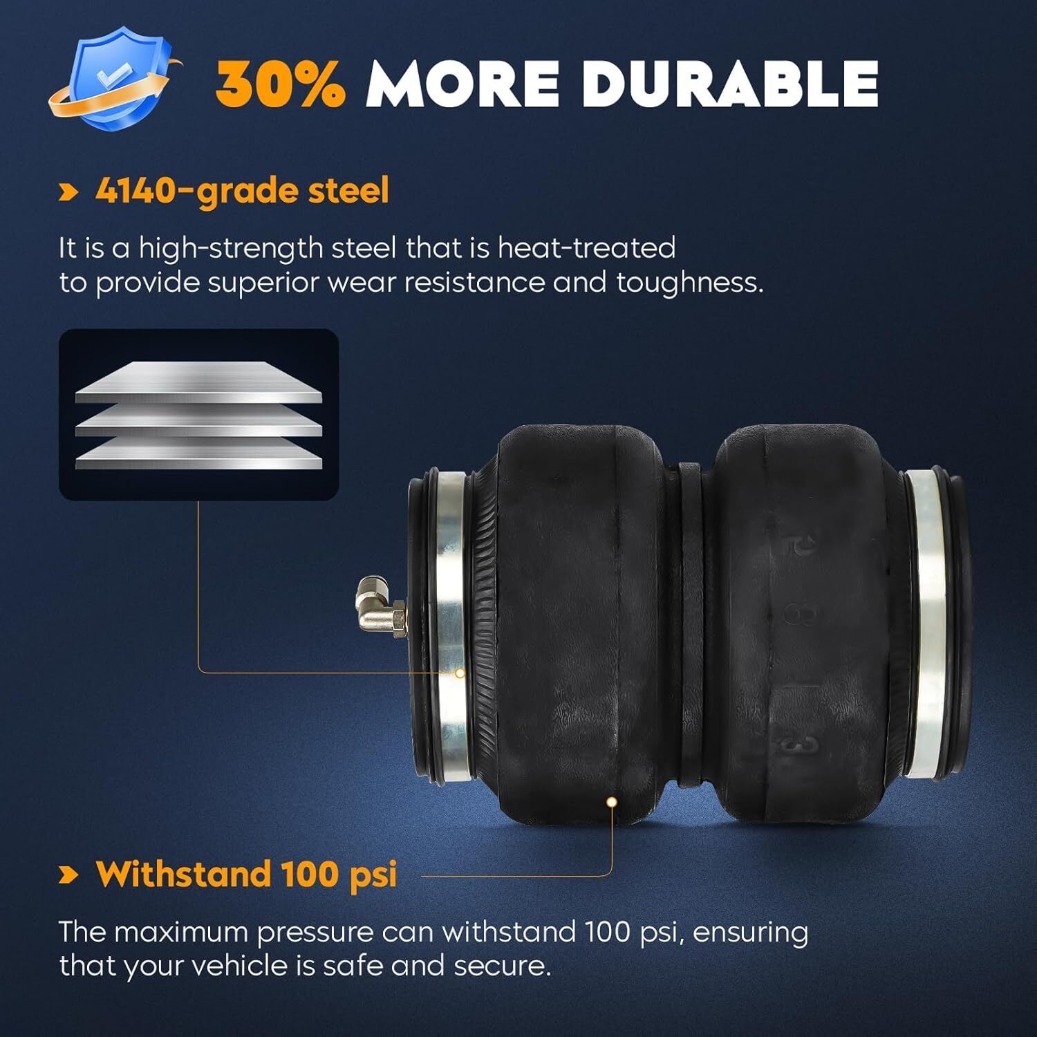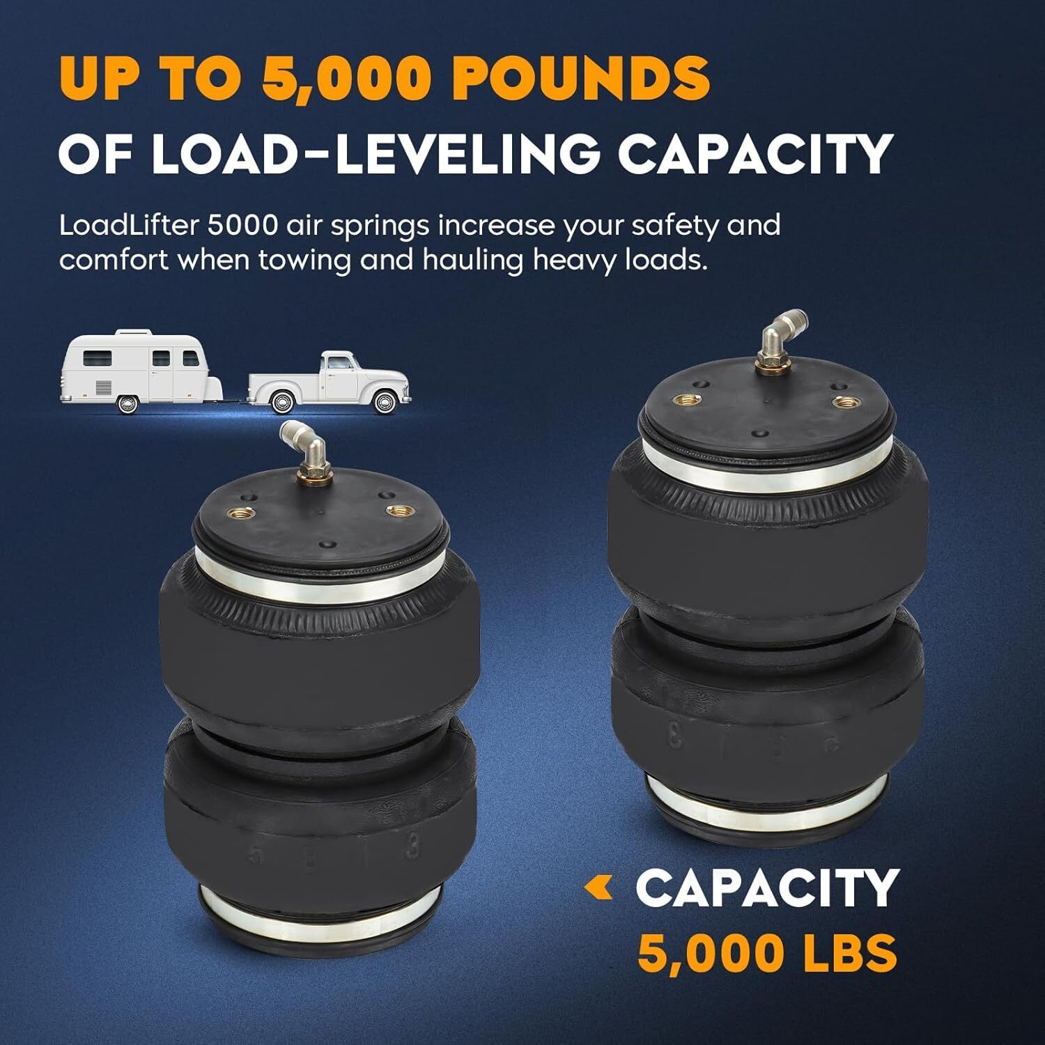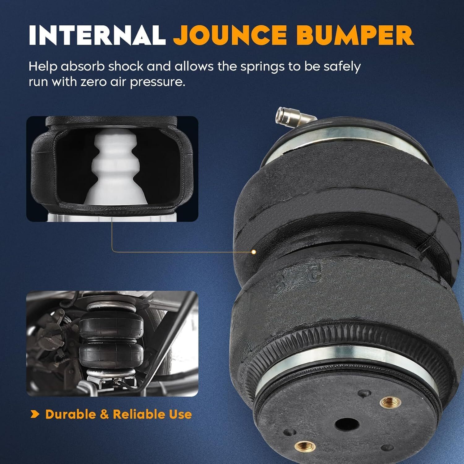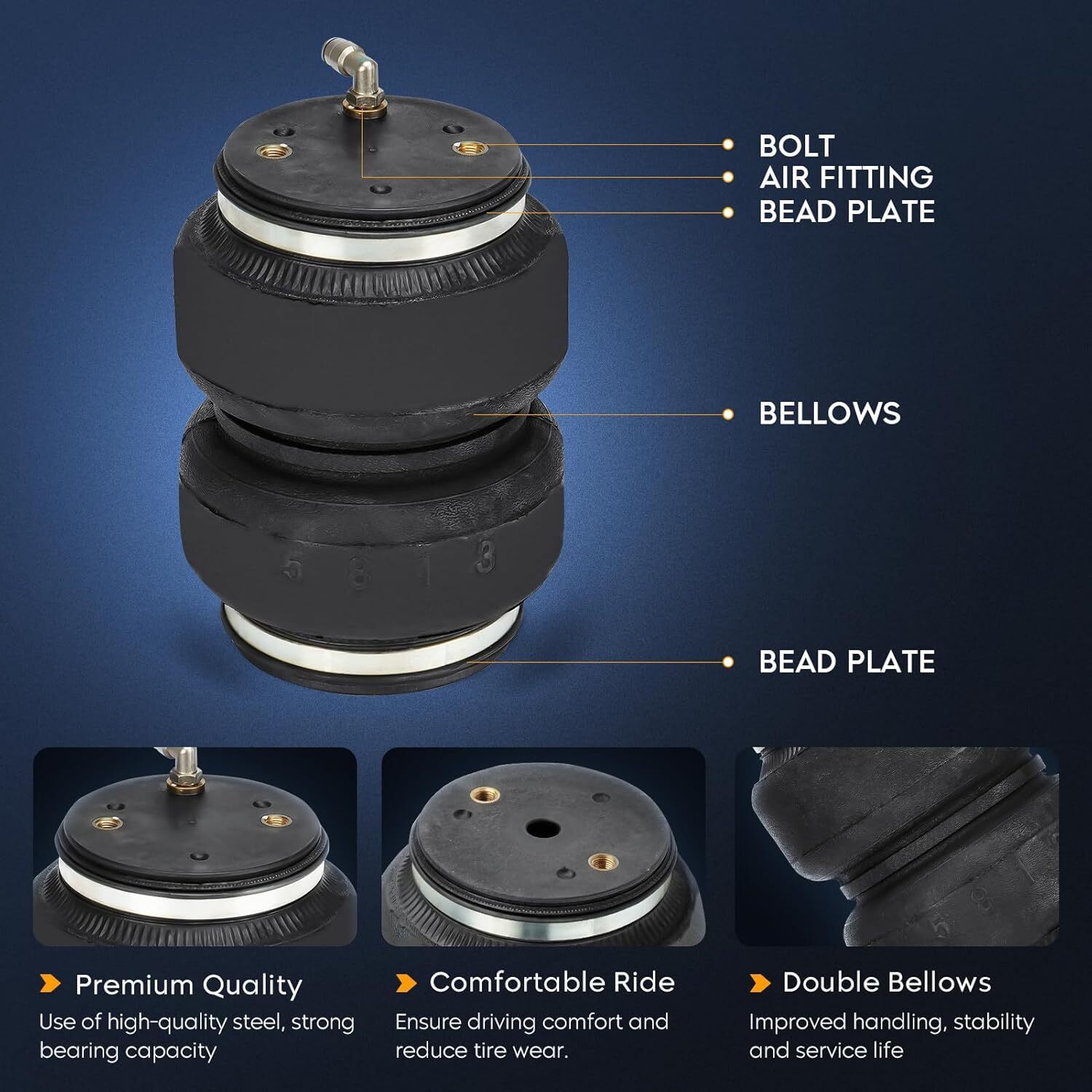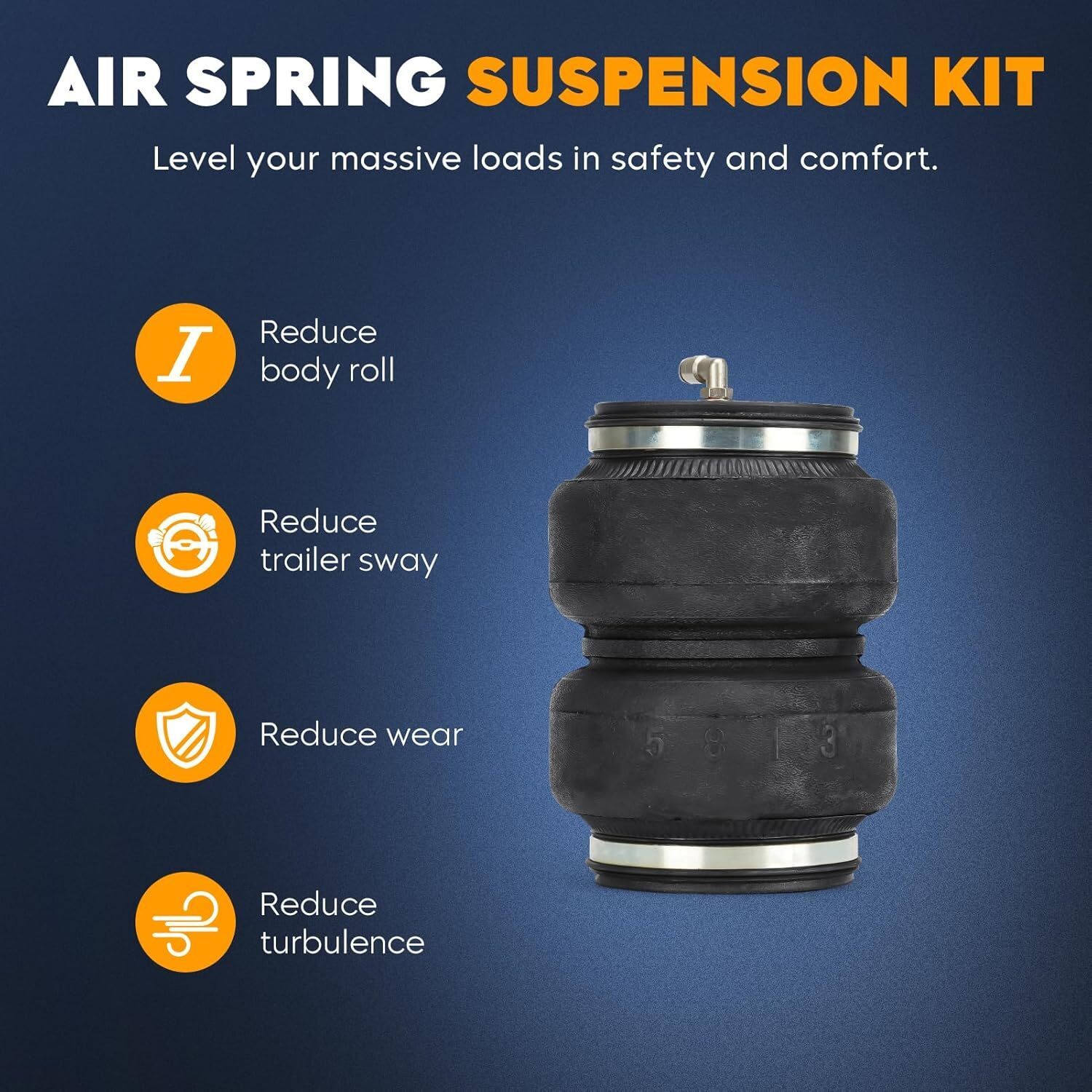 Compatible with: for Dodge D150 W150 1977-1993, for D200 D300 W300 W200 1975-1980, for D250 D350 W250 W350 1981-1993, for Ram 1500 1994-2001, for Ram 2500/ 3500 1994-2002, for RD200 1978 1980, for W100 1975-1977 1986-1989 Compatible with: for Ford F-100 1965-1983, for F-150 1975-1996, for F-250 1969-1999, for F-250/ F-350 Super Duty 1999-2004, for F-350 1970-1997; for Chevy C10 C20 C30 1975-1986, for R10 R20 R30 1987 Replace for Part Number: for 57215; Suitable for rear axle, no drilling required, 5000lbs capacity; One Year Warranty. High Performance: The air spring will absorb road shocks and adjust according to different load situations, reducing the frequency of vibration while driving for the desired ride comfort and providing you with a smooth and safe driving experience. Installation Notes: The airlines should be pushed firmly into the push-to-connect fittings with a slight side-to-side rotational twist. Pull on each line to check for a secure connection. In addition, you can refer to the instructions for specific steps.