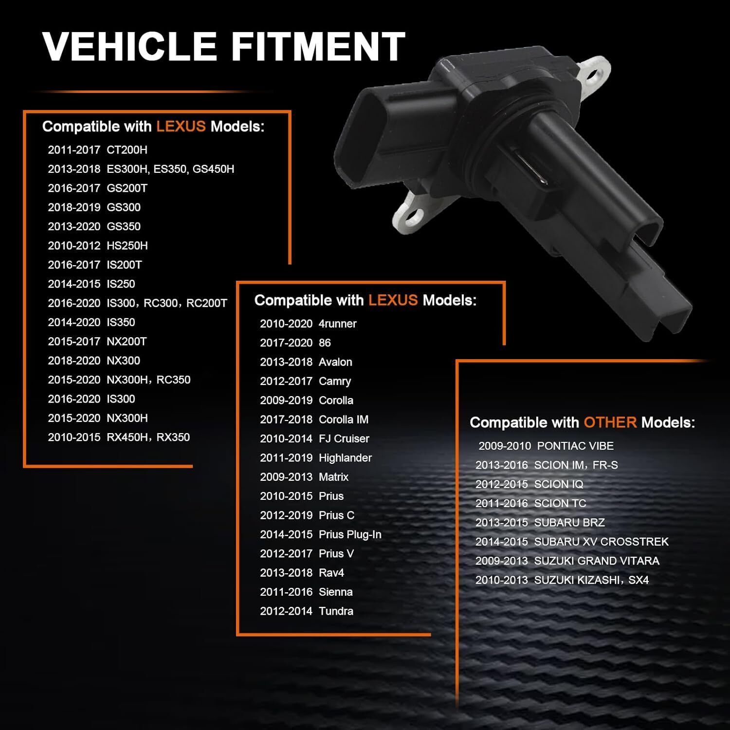 ?Universal Compatibility?This MAF sensor is designed to be a direct fit for a wide range of Toyota and Lexus vehicles, including the Camry, Corolla, Sienna, 4Runner, Prius, Lexus RX450h, HS250h, and the Scion tC from 2010 to 2020. It's also a suitable replacement for part numbers 22204-0V020 and 22204-28010, ensuring a hassle-free installation process and restoring your vehicle's engine performance. ?Enhanced Engine Performance? By accurately monitoring the airflow into your engine, this MAF sensor optimizes fuel delivery and ensures precise combustion. This results in improved throttle response, increased power output, and better fuel economy, giving your car a noticeable boost in performance. ?Durability Longevity?Made from high-quality materials, this MAF sensor is built to withstand the harsh conditions inside your engine bay. Its robust design ensures durability and longevity, reducing the need for frequent replacements and saving you money in the long run. ?Comprehensive 1-Year Warranty?We're confident in the quality of our products, which is why we offer a 1-year warranty on this Mass Air Flow Sensor. If you encounter any issues within the warranty period, we'll work with you to resolve them promptly, either through repair or replacement. ?24/7 Customer Support?Our dedicated customer support team is available 24 hours a day, 7 days a week, to assist you with any questions or concerns you may have. Whether you need installation guidance, troubleshooting assistance, or simply want to learn more about our products, we're here to help. With our 24-hour after-sales service, you can enjoy peace of mind knowing that help is always just a phone call or email away.