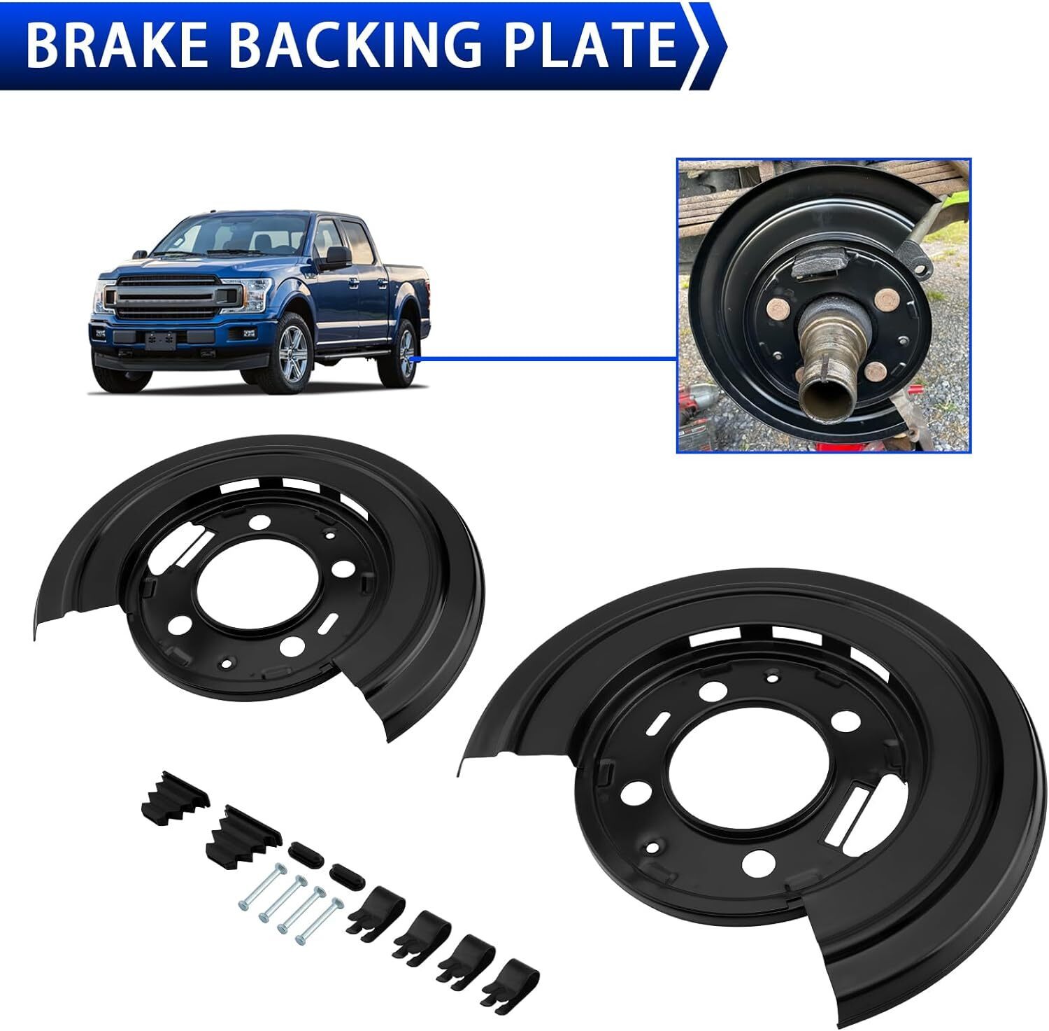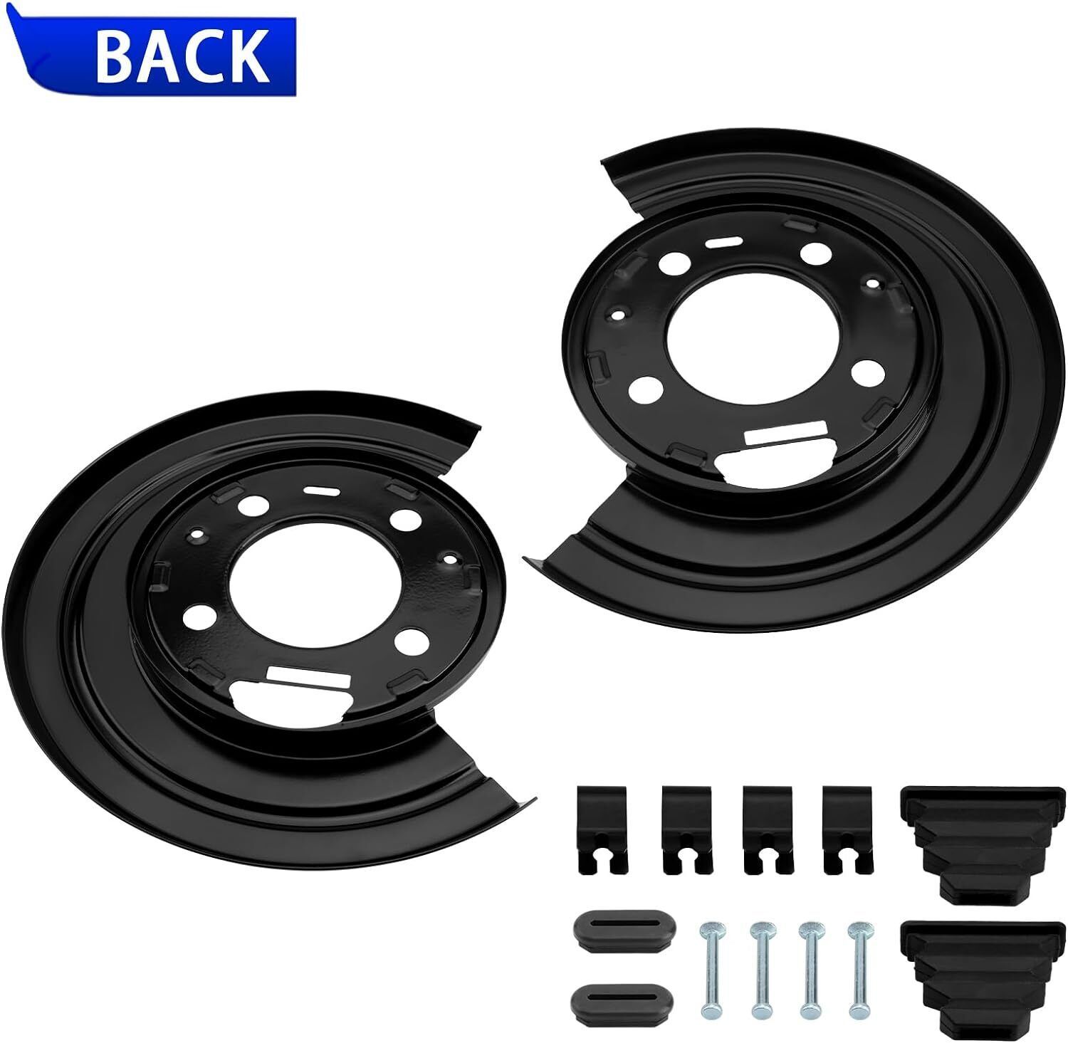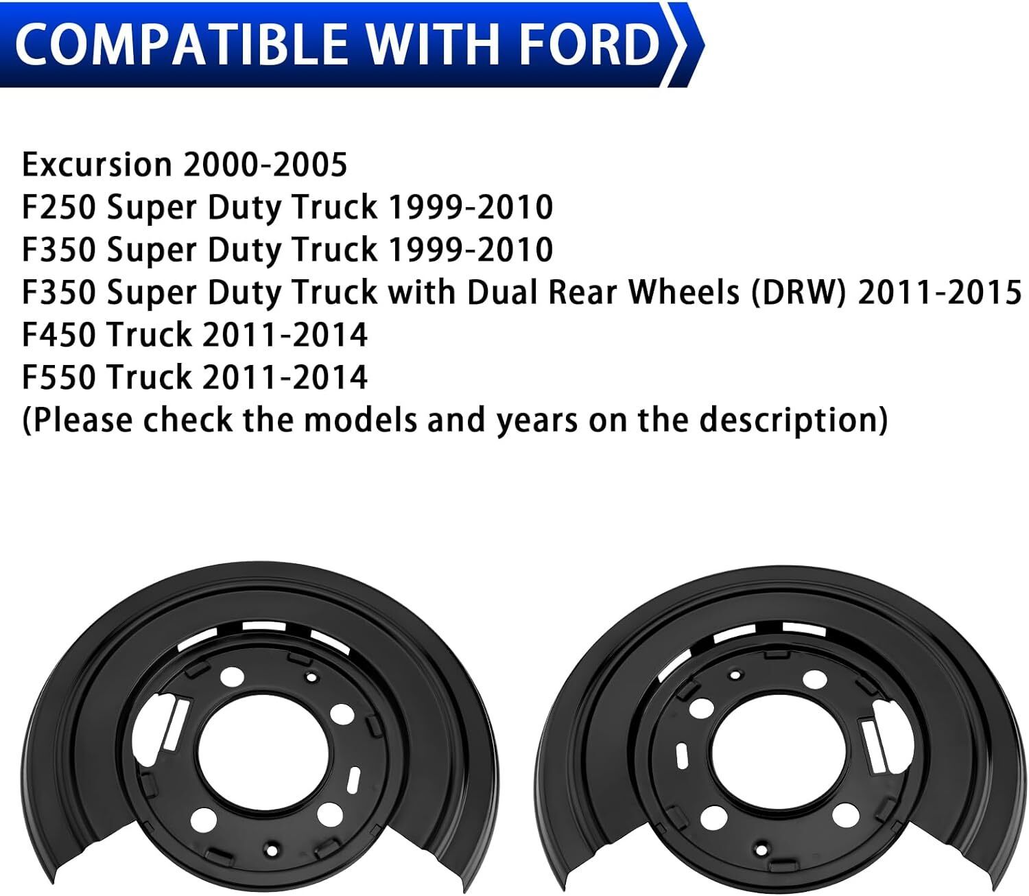 ?HIGH QUALITY?The brake plate dust shield is made of high-quality Steel, anti-rust, reliable, durable, and high strength for long service life. ?DURABLE DESIGN?This brake backing plate provides structure for the other components in the braking system, while also helping to keep debris from entering. It is designed with a rust-resistant coating that counters harsh winter weather conditions and humidity. ?FITMENT?Compatible with 2000-2005 Ford Excursion / 1999-2010 Ford F-250 Super Duty / 1999-2010 Ford F-350 Super Duty / 2011-2015 Ford F-350 Super Duty (DRW) / 2011-2014 Ford F-450 / 2011-2014 Ford F-550. ?OEM PART NUMBER?924212, 4C3Z-2209-AA, 4C3Z-2210-AA, 5C34-2209-A, 5C34-2210-A, 5C3Z-2B636-AA, 5C3Z-2B636-BA, 8C3Z-2209-A, 8C3Z-2210-A, YC3Z-2209-FA, YC3Z-2210-CA. Please Check the Model /Year /Part NO. before Purchasing. ?PACKAGE INCLUDED?1 x Pair of Brake Plates Dust Shield; 4 x Silver Screw; 2 x Black Cylindrical Rubber Pad; 2 x Black Rubber Pad; 4 x Black Side Buckle. Note: W/Left Brake Caliper Toward Rear of Axle, No Hole for ABS Sensor.