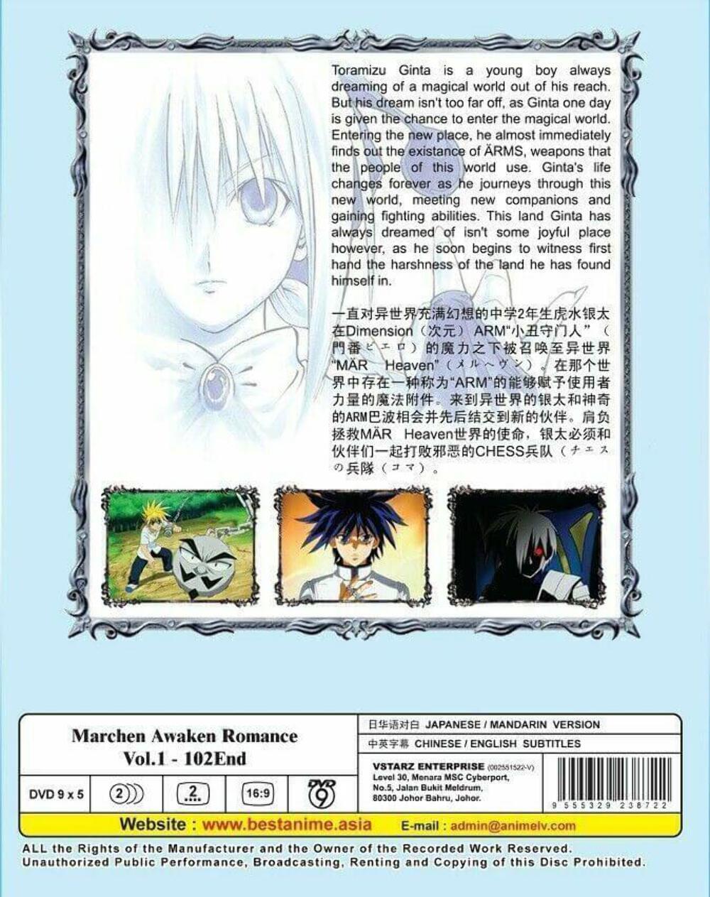 body { font-family: "Market Sans", Arial, sans-serif; } For detail of this set please view below only, and also to tell if this set has english or Japanese audio view below and check out the listing photo back side. If it shows as (Japanese / English Version means it has English audio but if it only shows Japanese Version no English Audio)All our set has at less English Subtitles if only Japanese audio. This set is all regions. TITLE : MAR : MARCHEN AWAKEN ROMANCE COMPLETE TV SERIES Number of Episode : 1 - 102 END Number of Disc : 5 Language : Japanese Subtitle : English / Chinese Format : PAL, REGION ALL Condition : NEW, ORIGINAL LICENSED ITEM Synopsis: Dreaming of a magical world every night, the young Toramizu Ginta yearns to be able to go there. With only his friend Koyuki believing in his dreams, Ginta remains positive despite the slander he receives from others over his dreams. But his wishes are answered, as one day a large door appears in front of Ginta, summoning him to the land of MAR Heaven. In this land, the weapons known as ARMS exist. While initially Ginta greatly enjoyed the discovery of this magical world, he soon learns of the terrible wars that have once plagued MAR Heaven and the upcoming war that may soon appear. - We Only Sell Original/Genuine DVDs. All DVDs I'm selling are from Licensed Publisher in Malaysia. All DVDs come with Original Sealed Authenticated Sticker / Hologram by Malaysia Censorship Board. ALL PACKAGE WILL BE SHIP OUT FROM USA CA SAN DIEGO AREA OCEANSIDE, SAN MARCOS. THIS MEAN WITH IN USA YOU SHOULD RECEIVE THE PACKAGE WITH IN 4-6 BUSINESS DAY AFTER SHIP OUT. We Only Sell Original/Genuine DVDs. All DVDs I'm selling are from Licensed Publisher in Malaysia. All our products are All region so it will play any dvd player in the world Any problem please contact us first so we can speed up taking care of you.