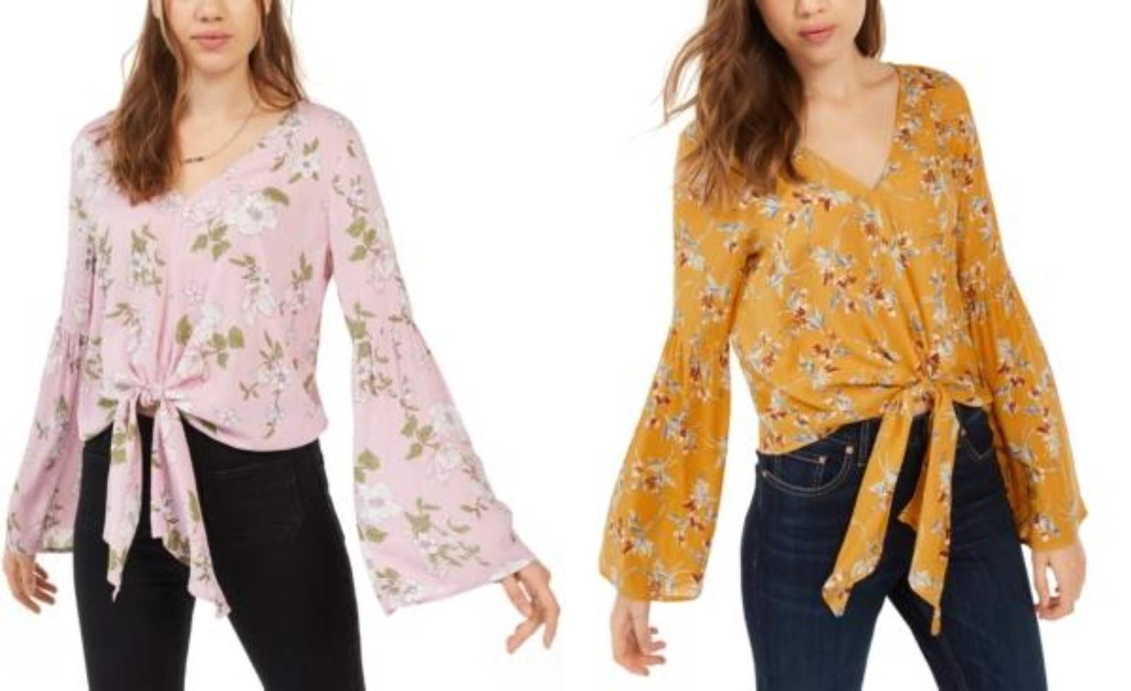 Polly Esther Juniors Tie-Front Bell-Sleeve Top
