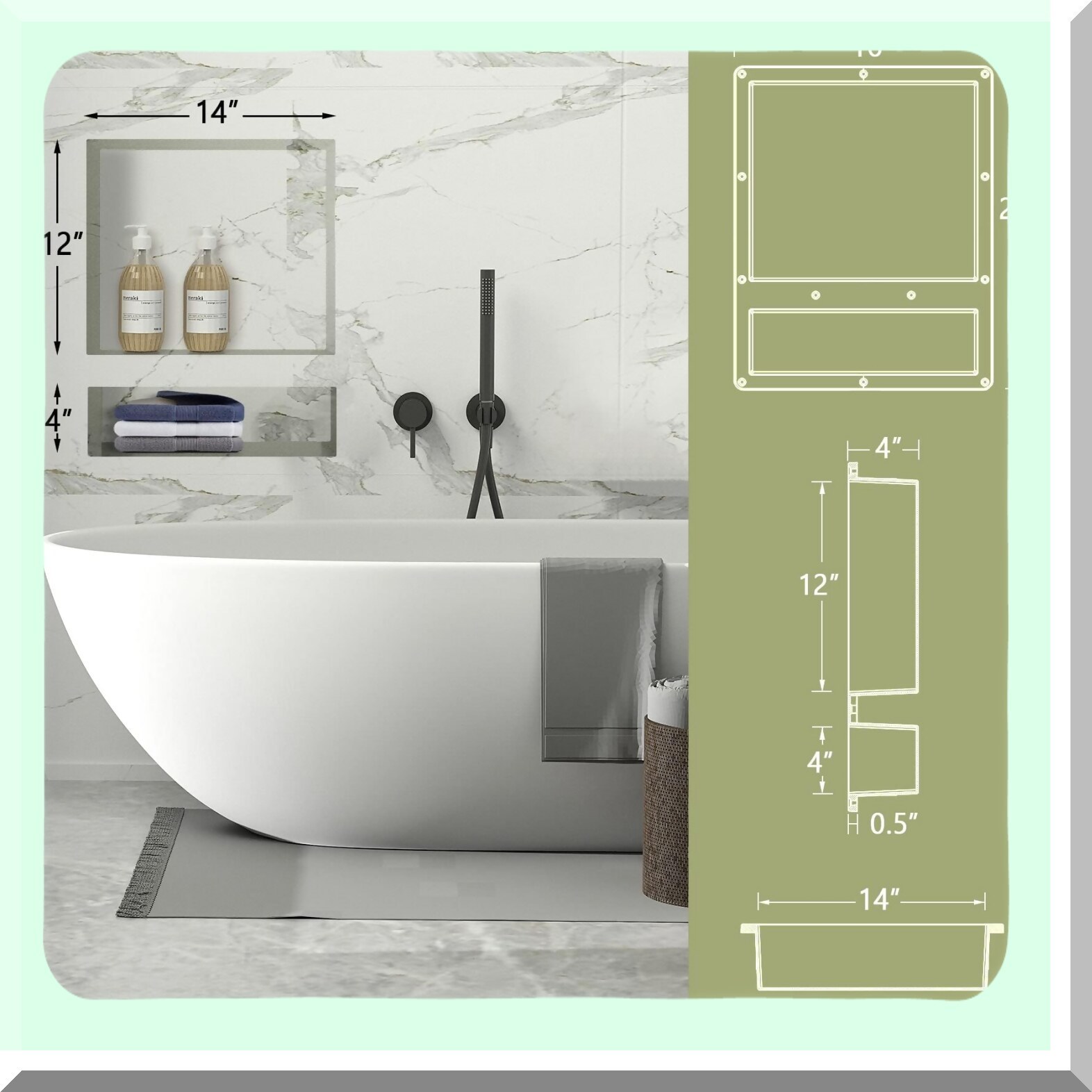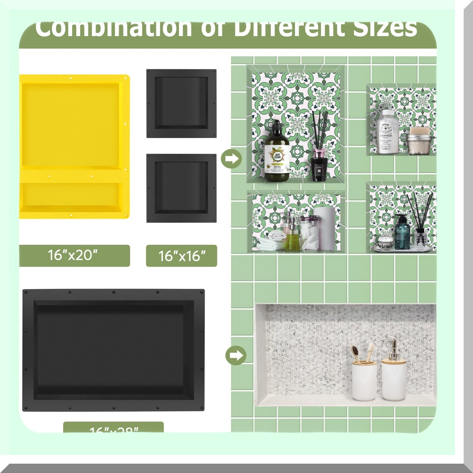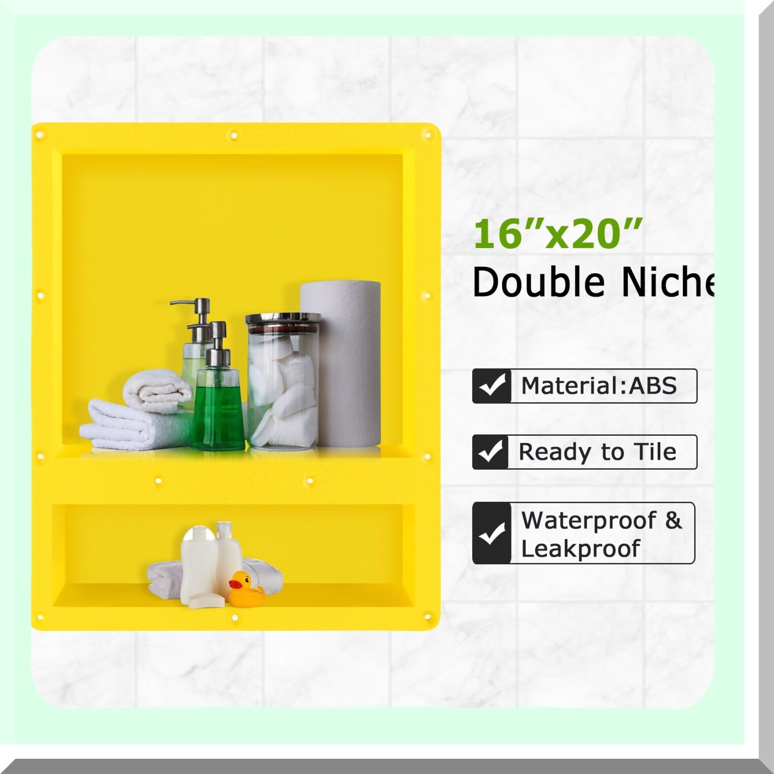 This 16" x 20" rectangular shower niche features a double shelf design, providing ample storage space for your bathroom essentials. Crafted from waterproof plastic injection molding, it resists mildew, rust, and leaks, ensuring durability and long-lasting performance. The niche is ready for tile installation, allowing seamless integration into your bathroom decor. Its streamlined design helps create clutter-free shower walls, enhancing the overall aesthetic. Suitable for various interior wall applications, this recessed shelf can also be used in cupboards or as a bookshelf, offering versatile storage options. The installation process is quick and straightforward, fitting standard wall framing for convenience. Its bright yellow rectangle shape adds a vibrant touch to your space while maintaining functionality. Perfect for both family and public environments, this shower niche improves the beautifying environment and maximizes your shower or bathroom storage. Package includes one shower niche ready for tile.