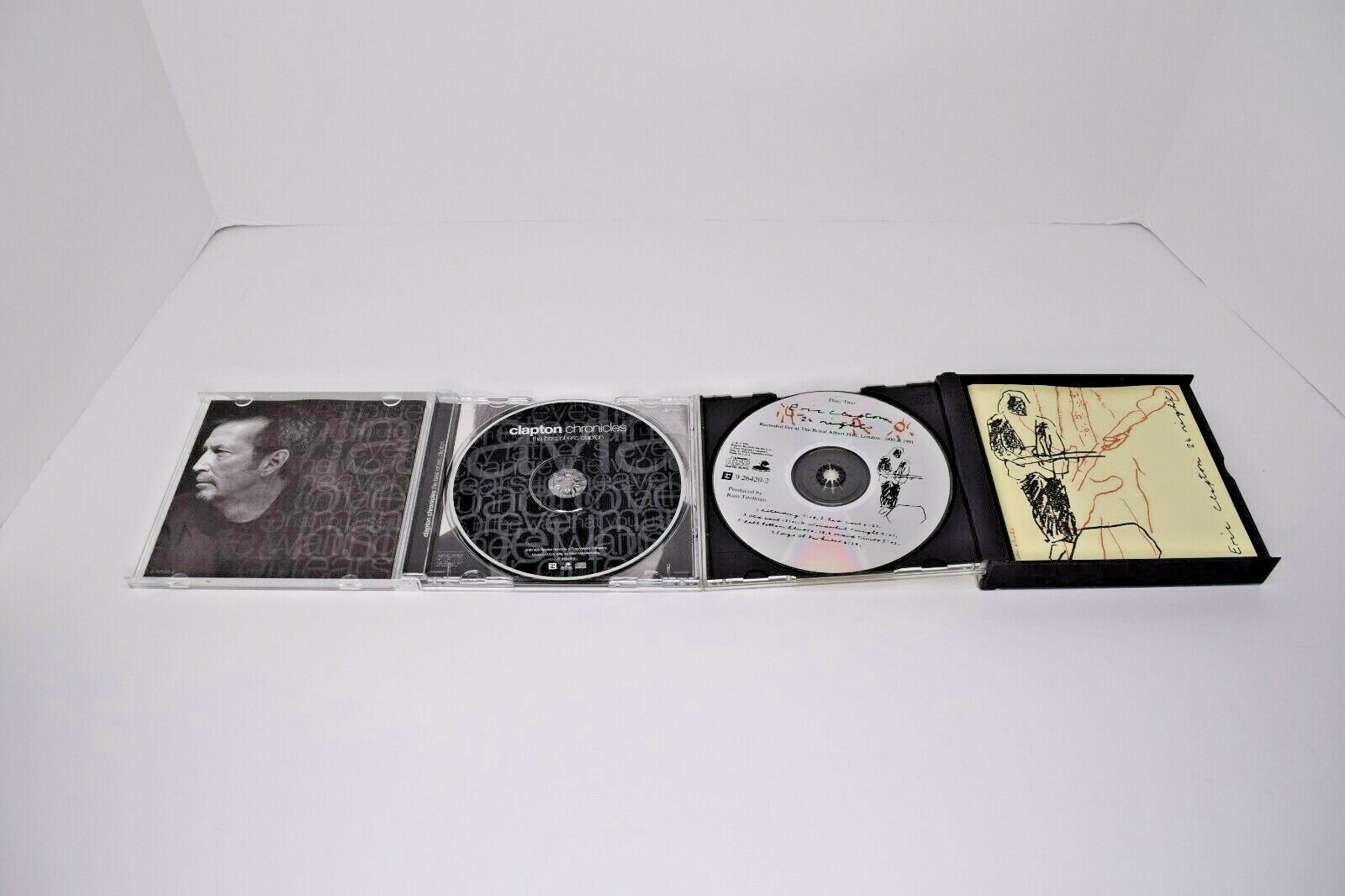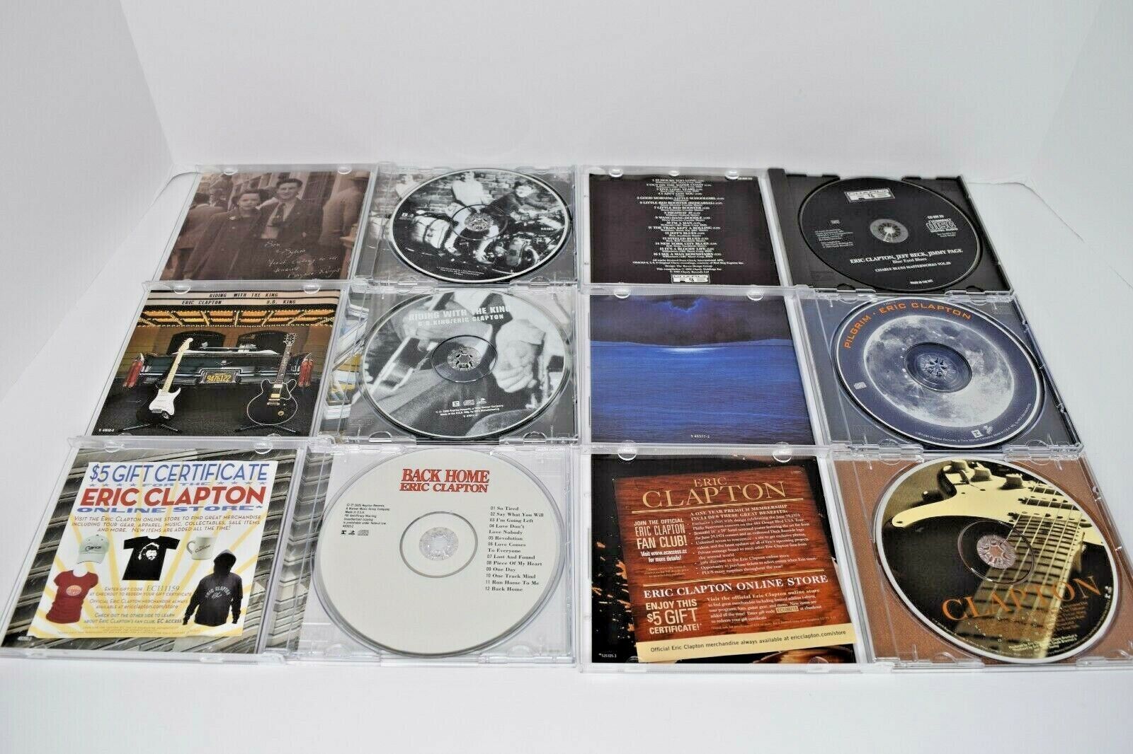 Lot of 8 Eric Clapton CDs. Titles are: 24 Nights, Reptile, Clapton Chronicles, Pilgrim, Back Home, Clapton, B.B. King Eric Clapton Riding with the King, and Clapton, Jeff Beck, Jimmy Page Blue Eyed Blues. All are pre-owned in Good or better condition. All discs play fine, some have more wear than others. All have nice liner notes. Cases are all good with some wear, no cracks. See all photos for details and condition. Will ship USPS Media Mail.