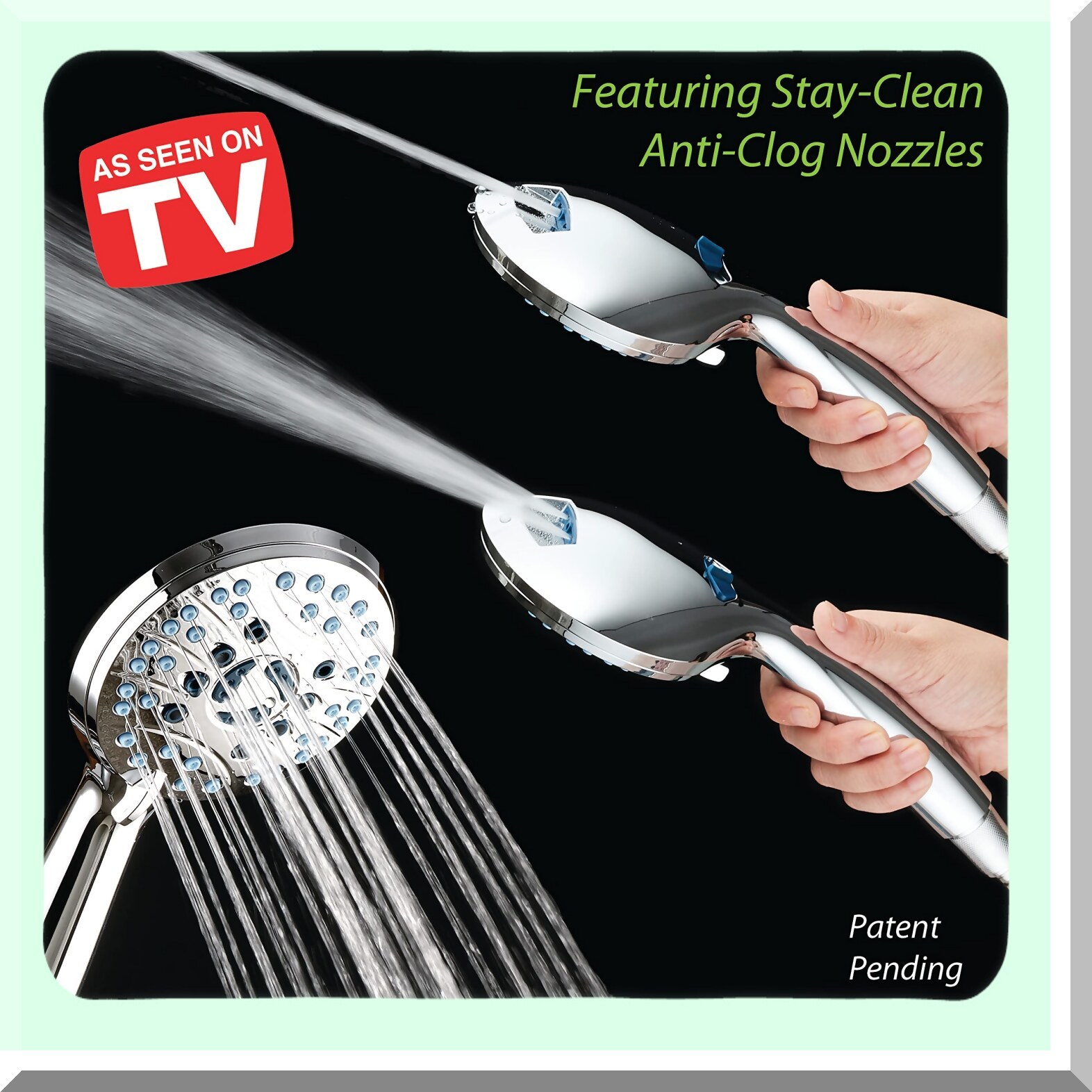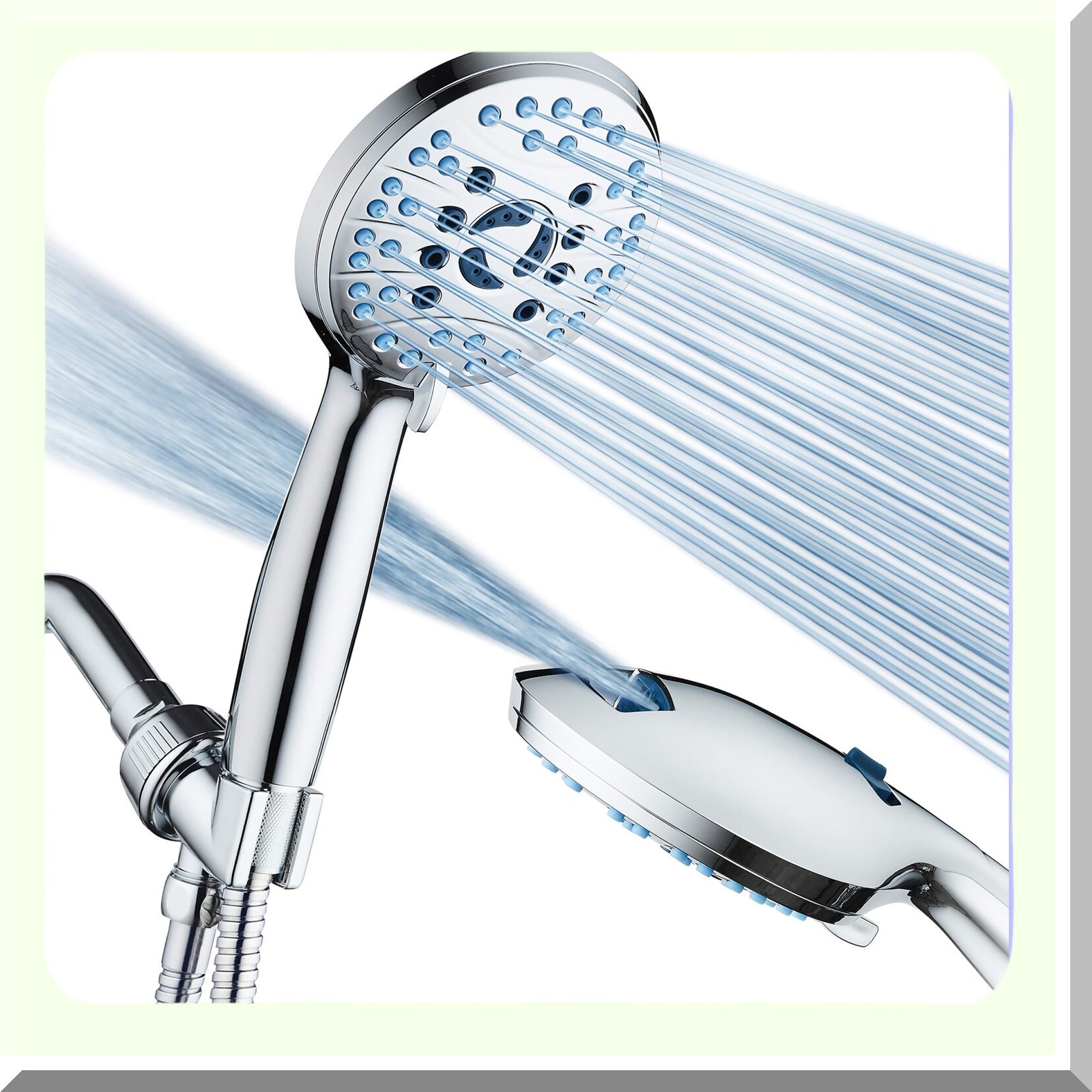 The AquaCare High Pressure 8-mode Handheld Shower Head offers enhanced water pressure and reduced cleaning effort with its advanced 8-setting, 5-zone Powerhead featuring self-clean anti-clog nozzles that resist grime buildup. Designed in the USA by top shower experts, it ensures long-lasting performance by preventing clogging and maintaining consistent water flow. The built-in two-mode tub and tile power wash allows quick cleaning of soap scum, dried hair, and grime from up to 6 feet away-simply flip the handle to switch between wide fan and point jet modes for efficient rinsing. Its extra-long 6-foot stainless steel hose and wall overhead brackets provide flexible positioning and ease of use. Ideal for cleaning tubs, tiles, and pets, the shower head's powerful spray easily rinses out shampoo and dirt, making pet bathing quick and effortless. This versatile shower head combines high pressure, easy cleaning, and pet-friendly features in a durable, user-friendly design.