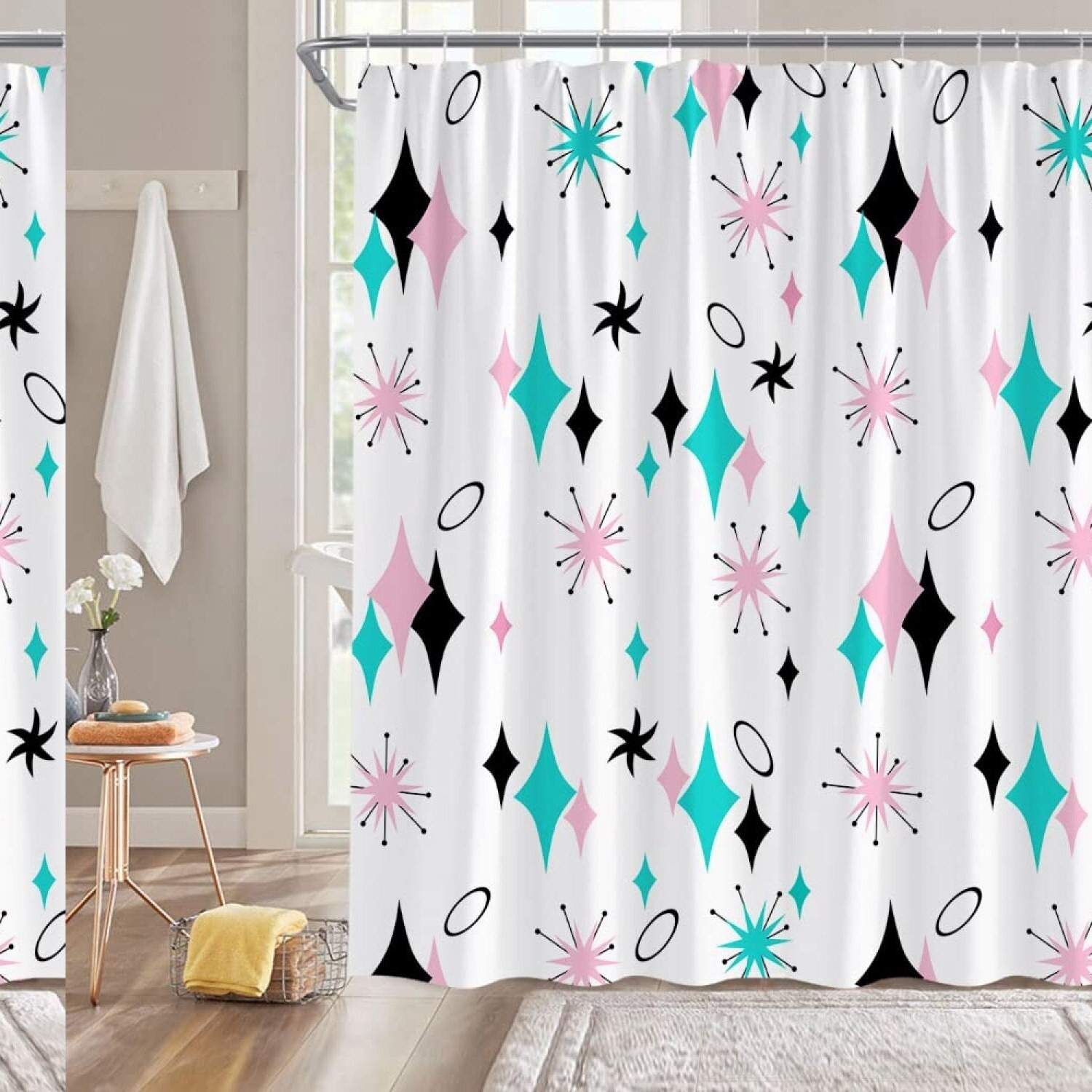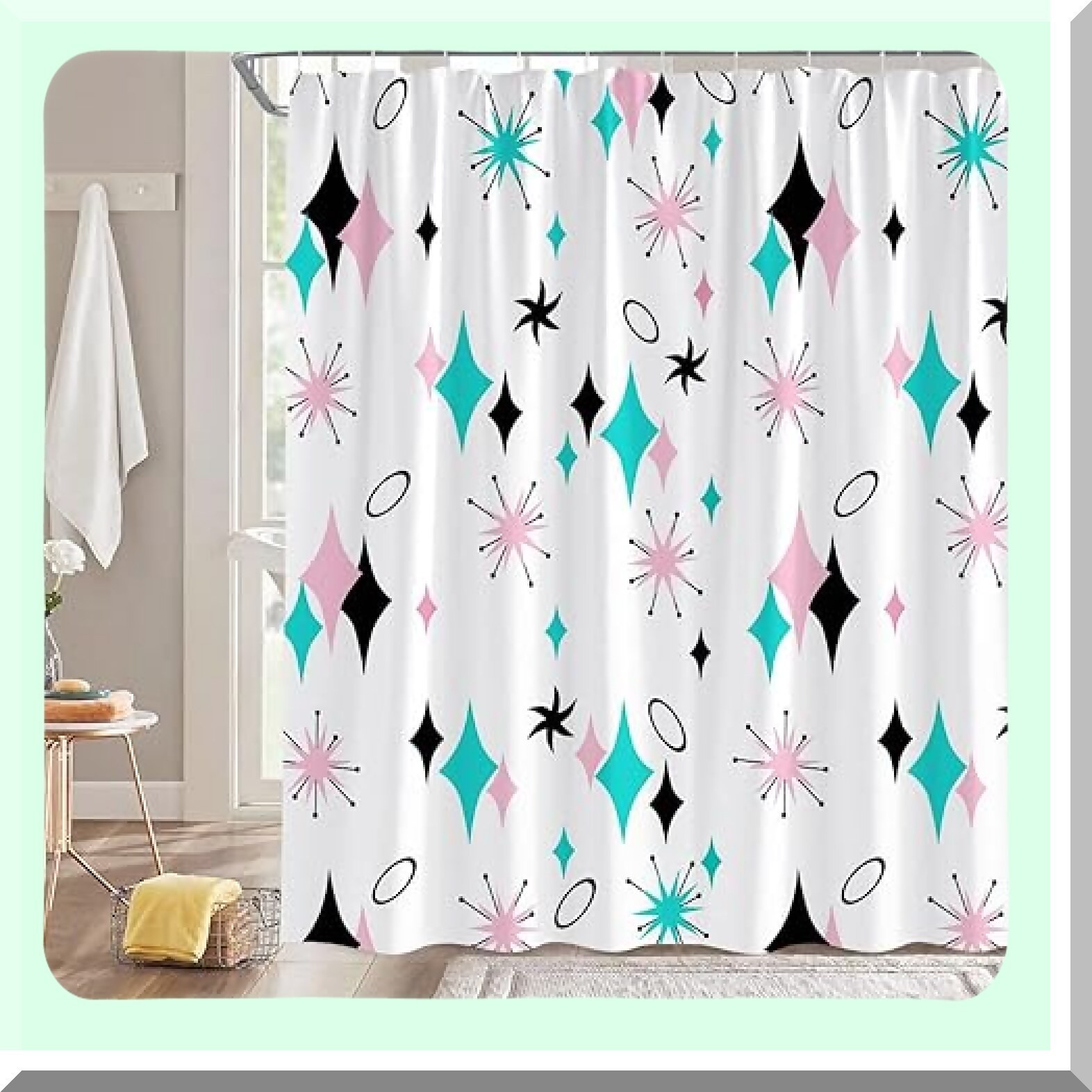 This shower curtain features a vintage-inspired design with turquoise diamond and atomic starburst patterns, showcasing a minimalist mid-century modern aesthetic. Crafted from waterproof and breathable polyester fabric, it offers durability and vibrant, clear printing that resists fading over time. The advanced 3D high-definition printing technology ensures beautiful, vivid patterns with perfect color matching. The curtain can filter 30%-50% of light, darkening the room and providing privacy, making it suitable for various spaces such as bathrooms, bedrooms, living rooms, kitchens, offices, and outdoor patios. Its no-coating, odor-free construction makes it healthier and safer, especially for children. Please note the pattern is only on one side, with the other side being white. Care instructions advise against hot water washing and chlorine bleach. Slight color differences may occur due to lighting and screen settings. Proper measurement before purchase is recommended to avoid returns. Customer satisfaction is prioritized with a full refund or replacement for quality issues.