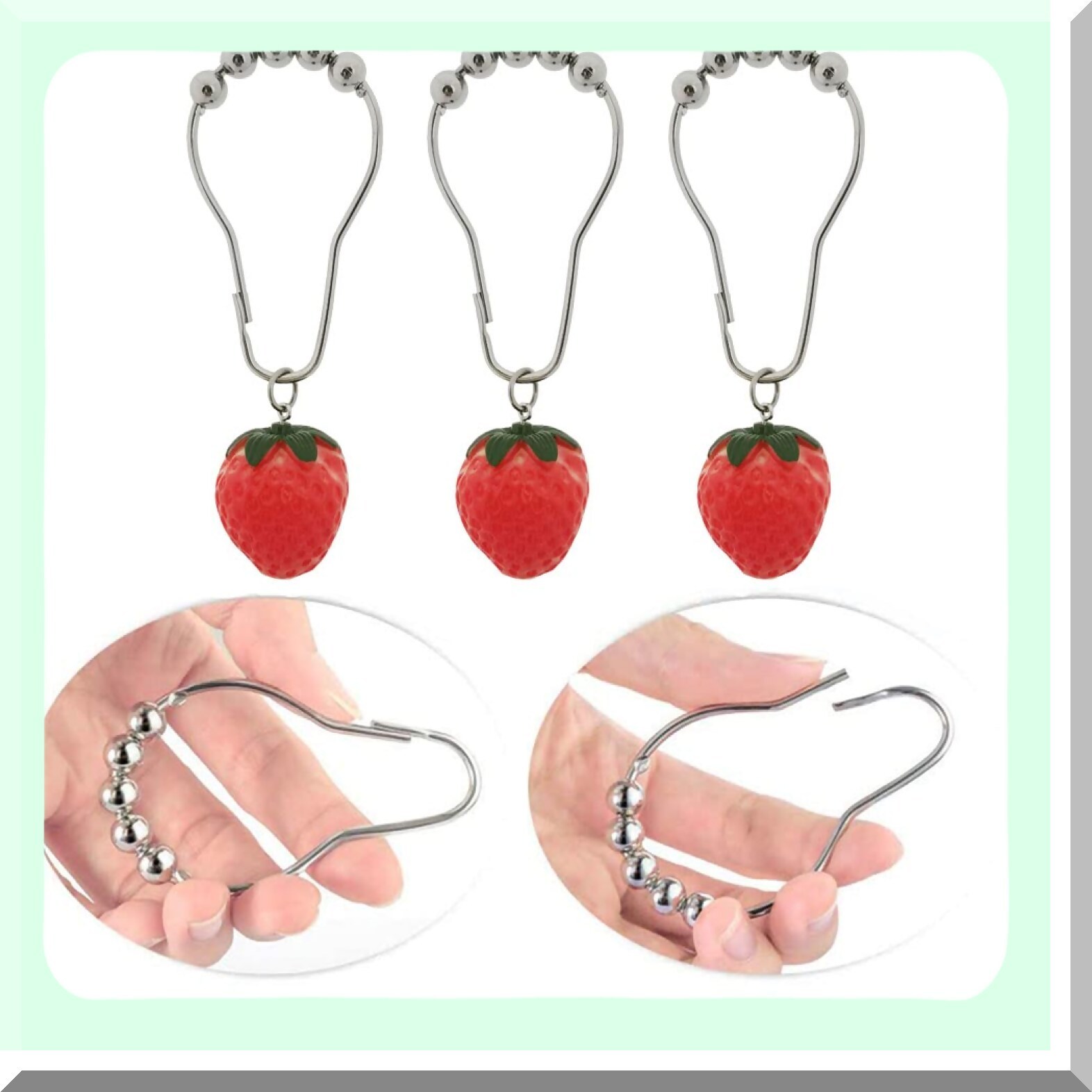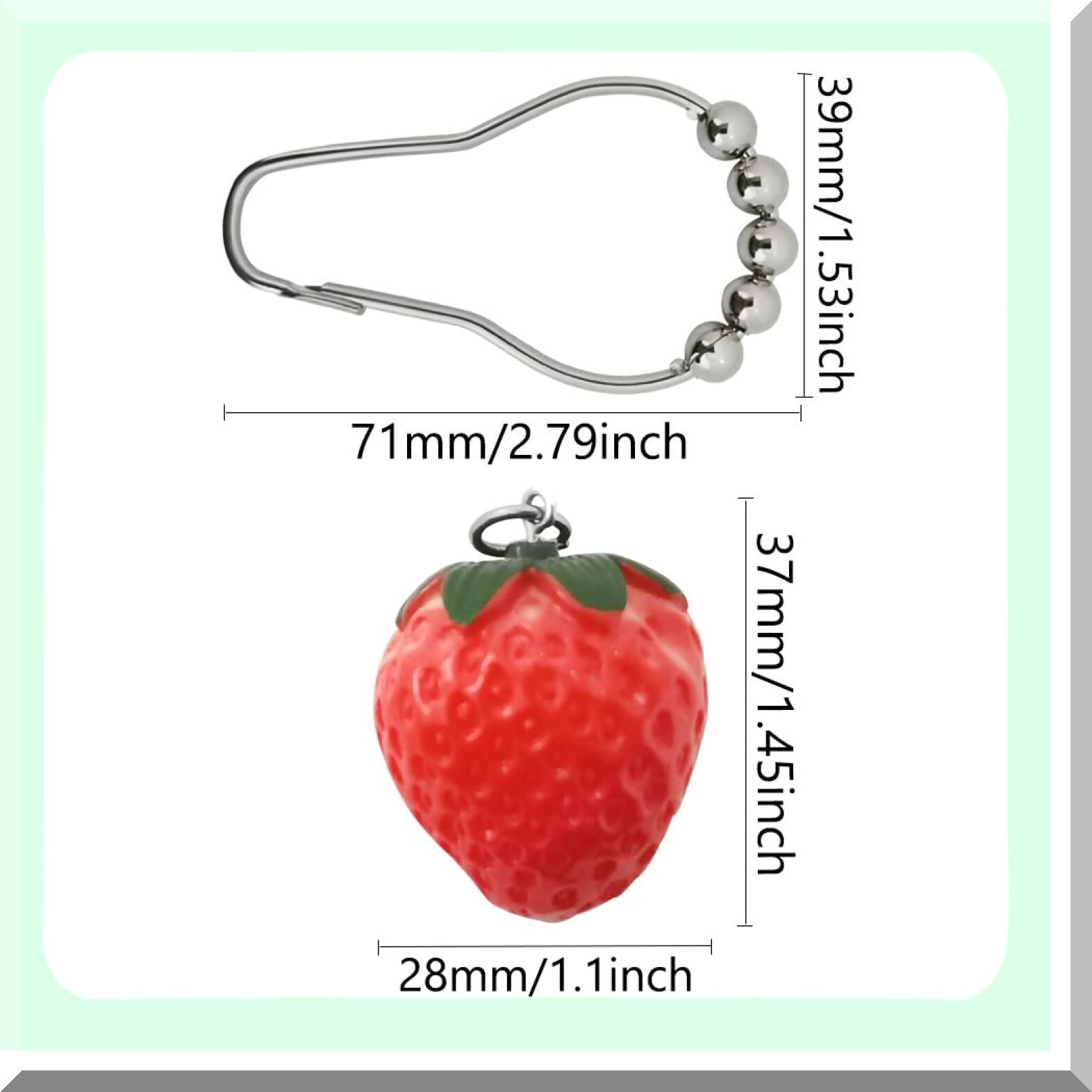 This set includes 12 decorative shower curtain hooks crafted from durable 304 stainless steel, featuring a shiny, rust-proof finish achieved through plating. Each hook is designed with a five-axis rolling ball to ensure smooth sliding, reduce friction, and minimize noise. The hooks are adorned with charming strawberry resin pendants, adding a playful and colorful touch to any shower curtain or curtain rod. Suitable for use in bathrooms, living rooms, bedrooms, reading rooms, or outdoor patios, these hooks bring a fresh, unique look to your space. The environmentally friendly resin strawberries enhance the aesthetic appeal, making your decor more lively and inviting. Please note that due to manual measurement, slight size and weight variations of 1-3 mm may occur. Color differences may also be present due to lighting and monitor settings. Designed to be sturdy and stylish, these hooks are a delightful addition to any home decor.