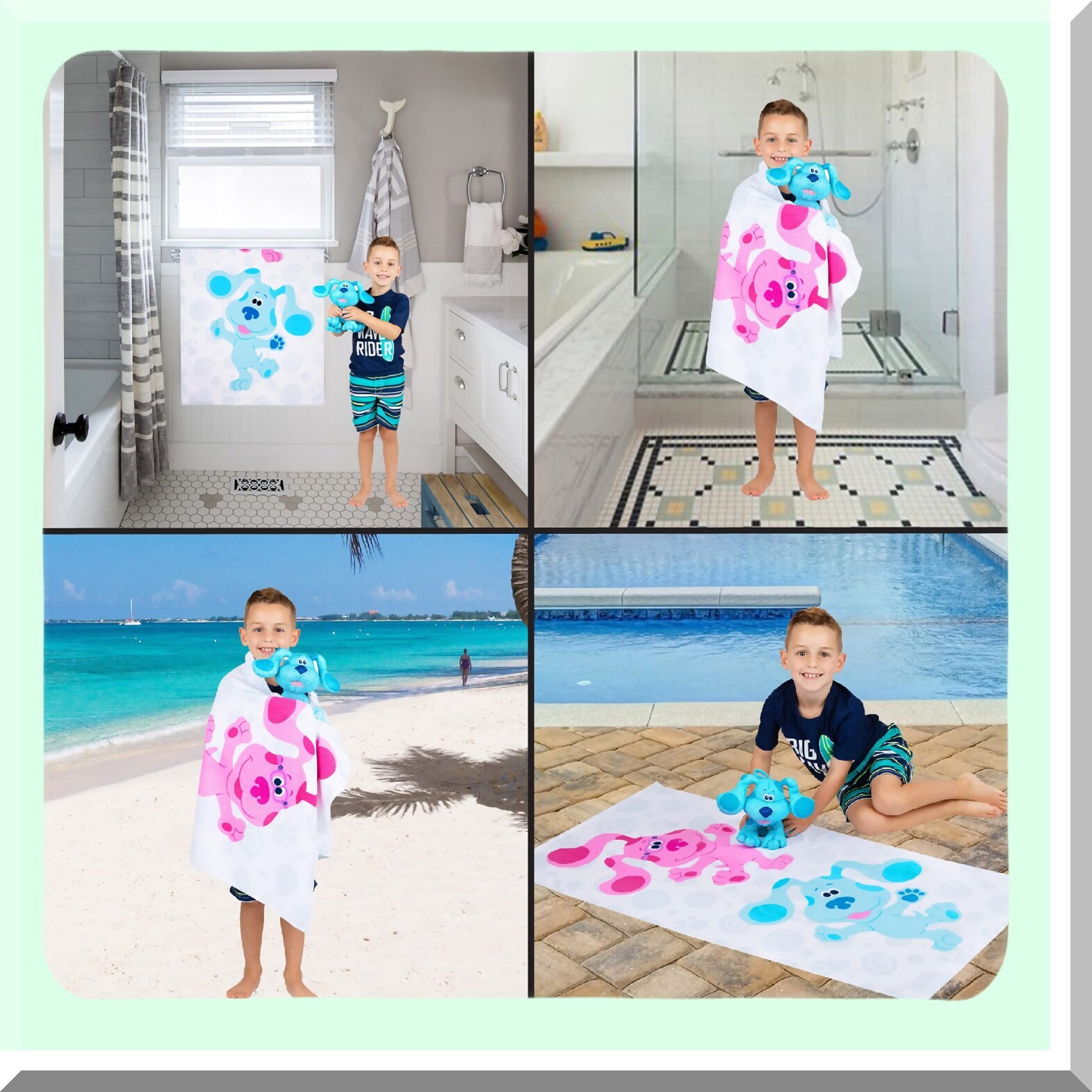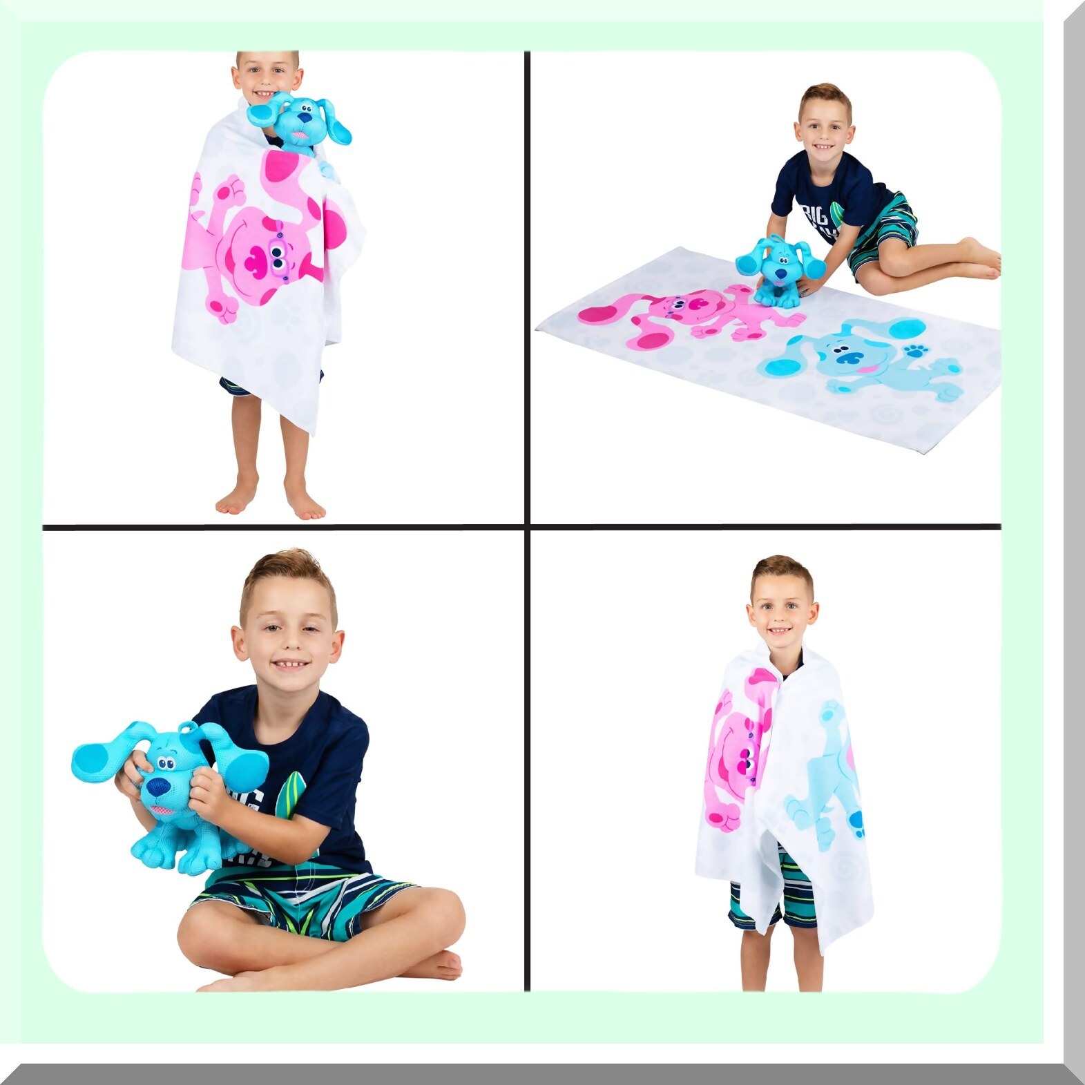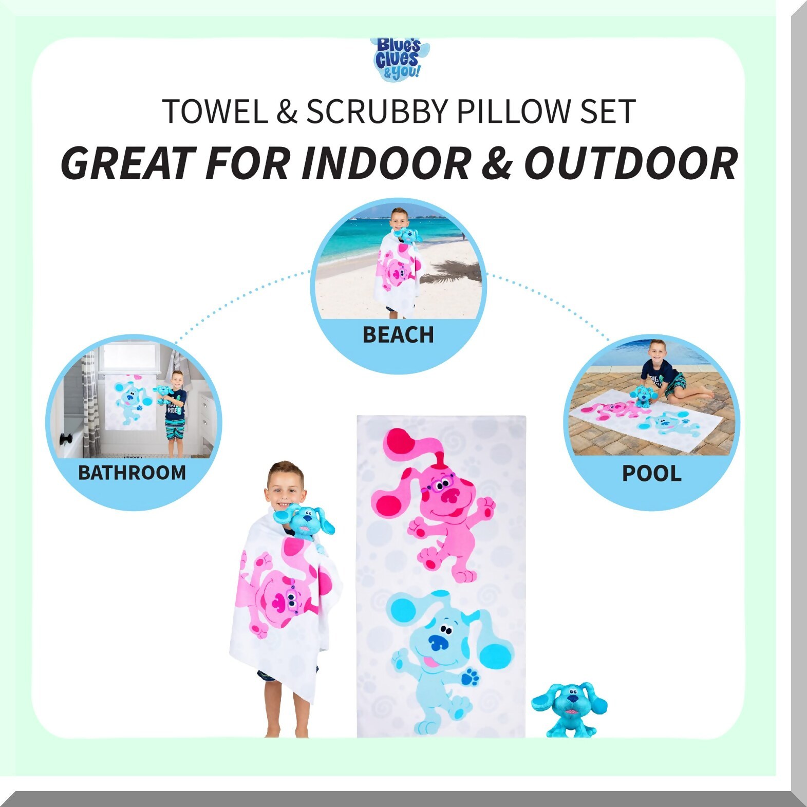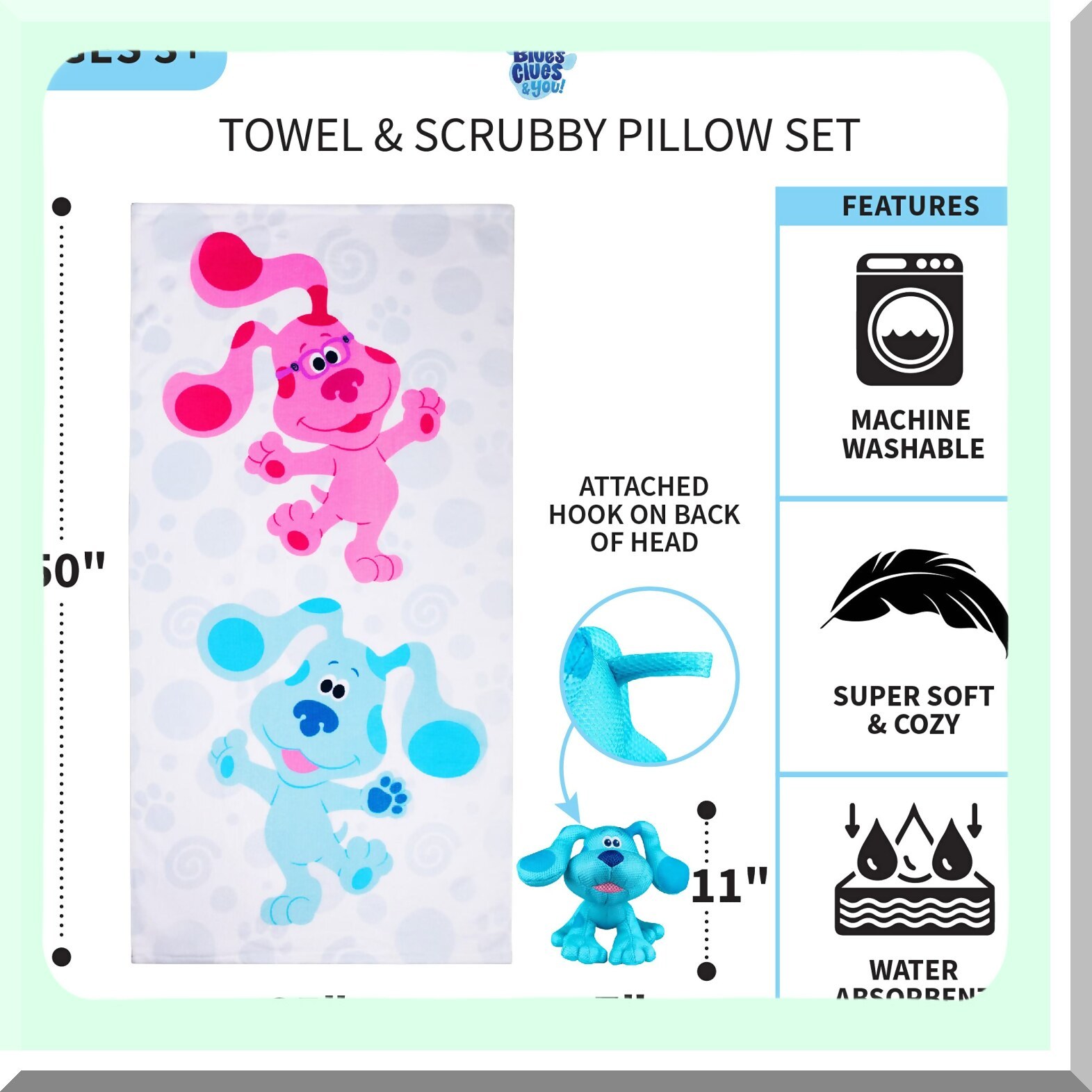 This two-piece bath set includes a soft microfiber towel and a mesh scrubby pillow, perfect for bath, pool, or beach use. The towel measures 25 inches wide by 50 inches long and features a "Clues for Us" pattern with Blue and Magenta characters on a grey and white background, offering quick-drying comfort. The mesh scrubby pillow, shaped like Blue, provides gentle scrubbing and doubles as a fun bath toy. Both items are designed to be cuddly and entertaining, making bath time enjoyable for children. The set combines practicality with colorful, engaging design, encouraging kids to have fun while staying clean and dry.