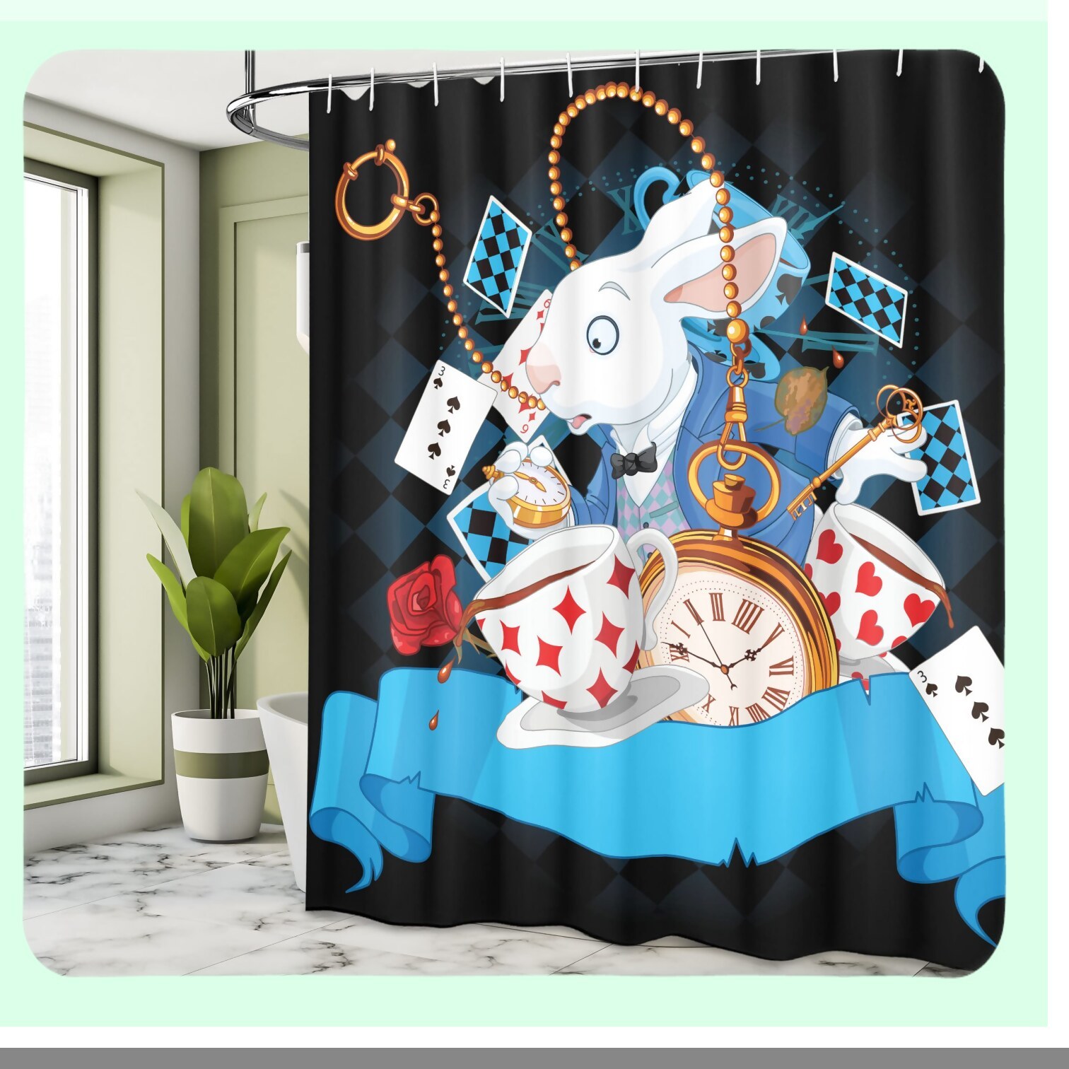 Transform your bathroom with this Alice in Wonderland-themed shower curtain featuring a charming cartoon style. Measuring 69 inches wide by 75 inches long, it is crafted from durable cloth fabric that is water-resistant and dries quickly. The design showcases whimsical characters, including a rabbit, motion cups, hearts, and flowers, set against a dark blue and charcoal grey background, adding depth and vibrancy to your space. High-resolution digital printing ensures vivid, realistic images that won't fade over time. The curtain is easy to install with included hooks, making it a simple way to refresh your bathroom decor. Its versatile design complements various color schemes of towels, rugs, and bathroom accessories, creating a cohesive look. Perfect for personal use or as a thoughtful gift, this shower curtain brings a playful, imaginative touch to any bathroom, transforming it into a relaxing retreat. Please allow slight measurement discrepancies due to manual measurement.