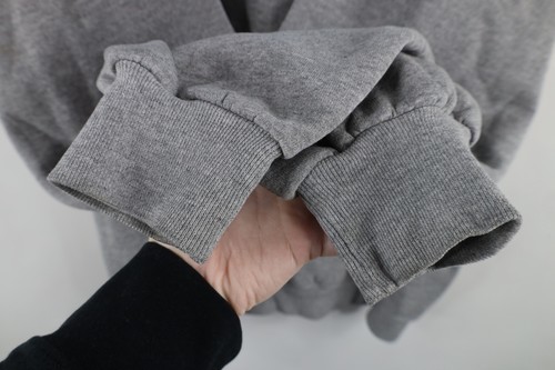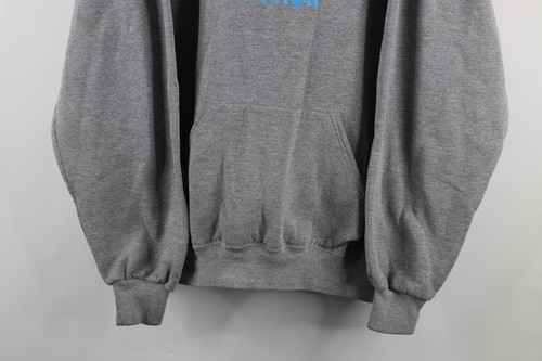 Hole front collar seam. Cuffs and hood discolored. Side of pocket ripped, has blemish. Missing hoodie string. Graphics cracking. Color faded. USA made