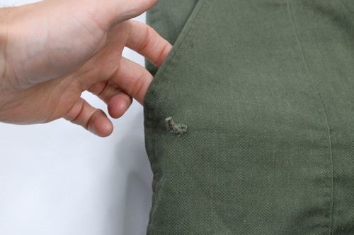 Front right waistband loop is unstitched on the bottom. Hole in the right hand pocket and bottom right leg. Blemishes on both legs. Distressed and faded. USA made