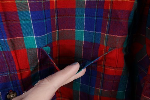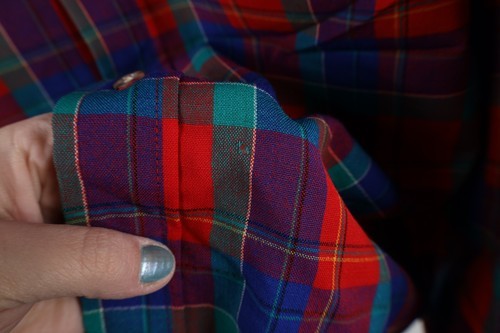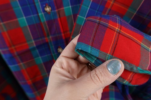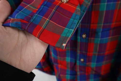 Holes front bottom, both cuffs. Stain front top, back bottom. USA made