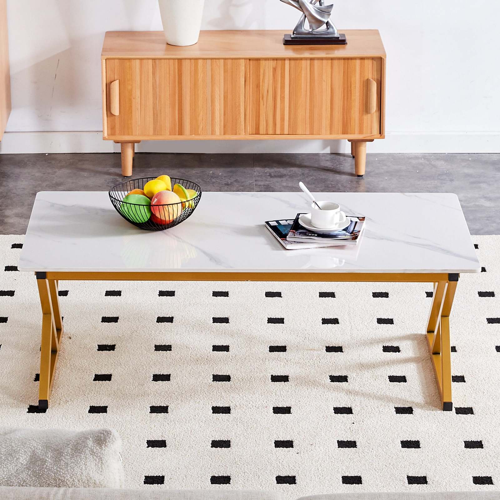 Modern White Marble Coffee Table w/ Golden Legs, Sintered Stone 47"